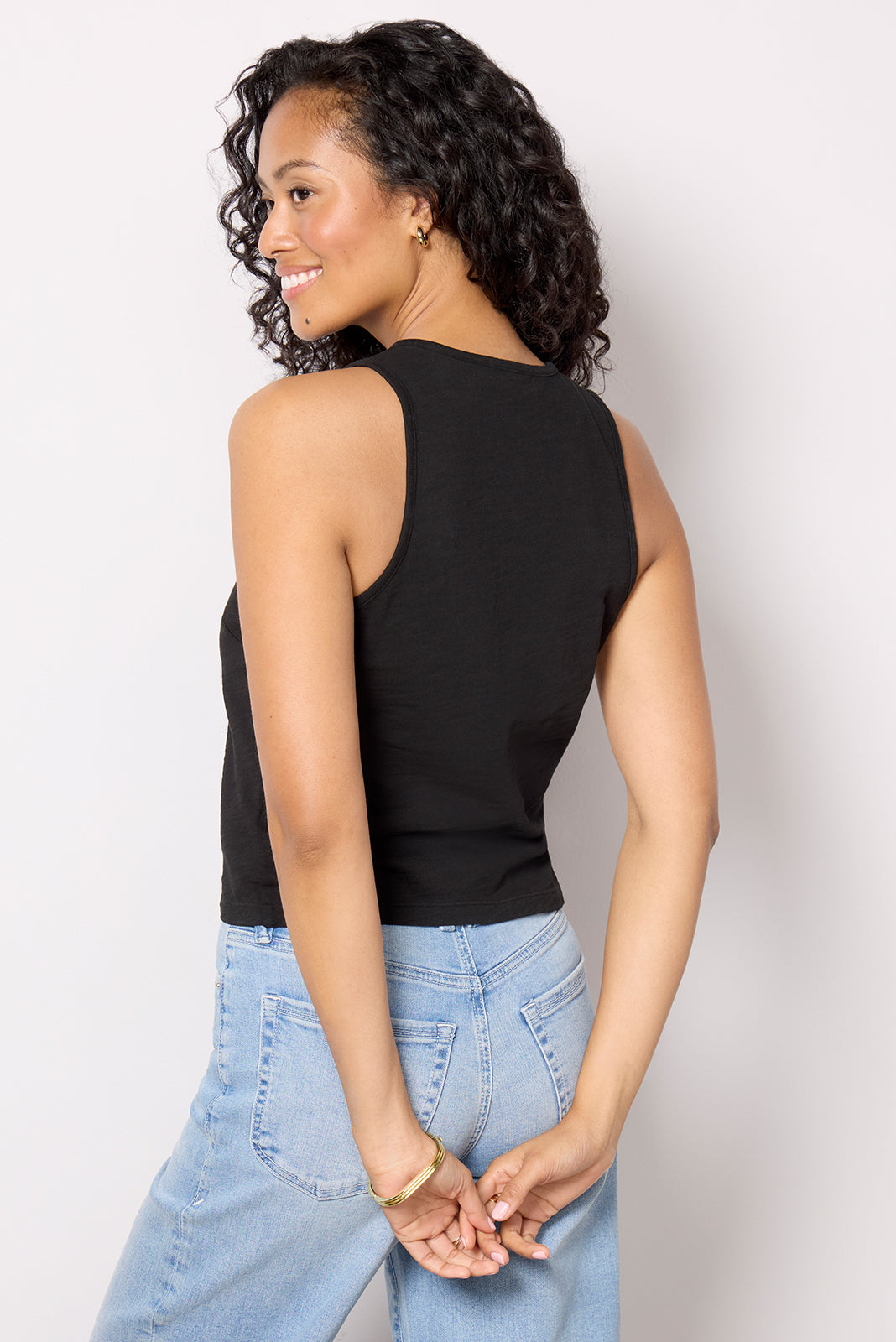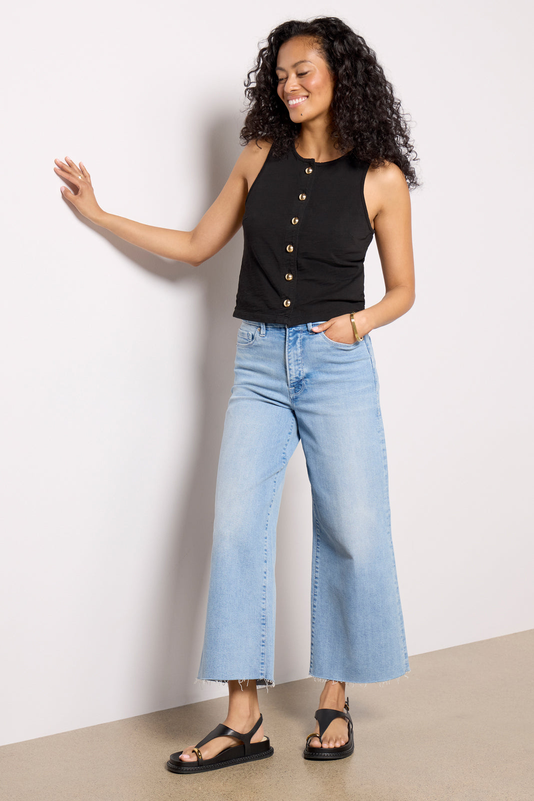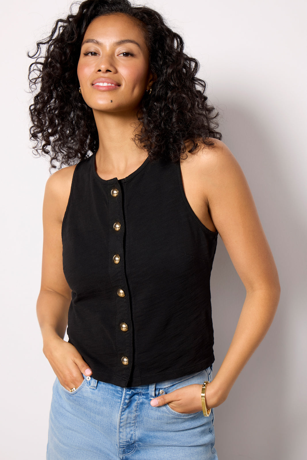 Gold buttons add an elegant touch to the Abbie Tank by Nation LTD. featuring a soft cotton fabric. crew neckline. and a cropped fit.