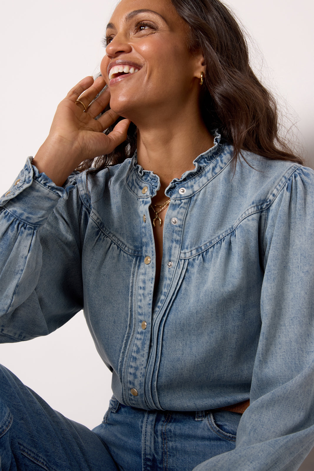 Finished with ruffles at the collar and cuffs. the Alanna Shirt by Rails is crafted in soft lyocell-blend denim with a seamed yoke. front snap closures. and long puff sleeves. Tuck into cargo pants. or pair with jeans for a denim-on-denim look.