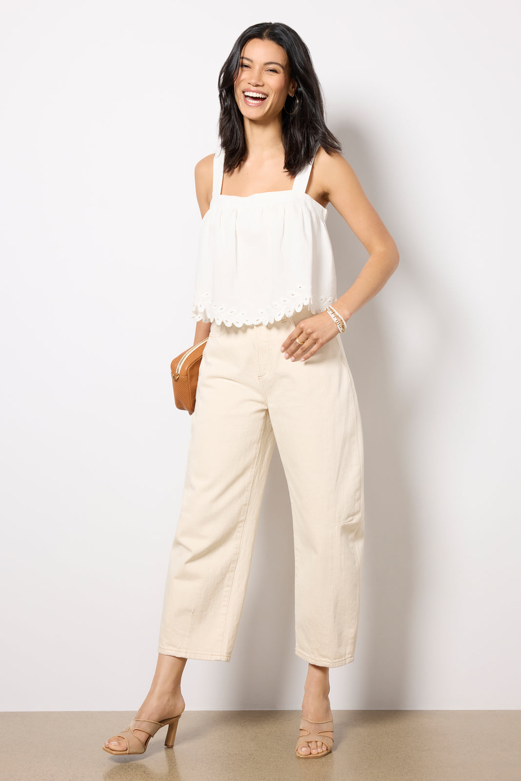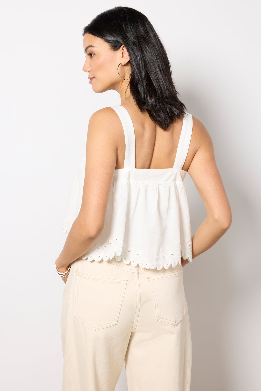 Add a feminine touch to your wardrobe with the Annecy Tank from Z Supply. featuring delicate cutwork embroidery. adjustable button straps. and a built-in jersey bra.?