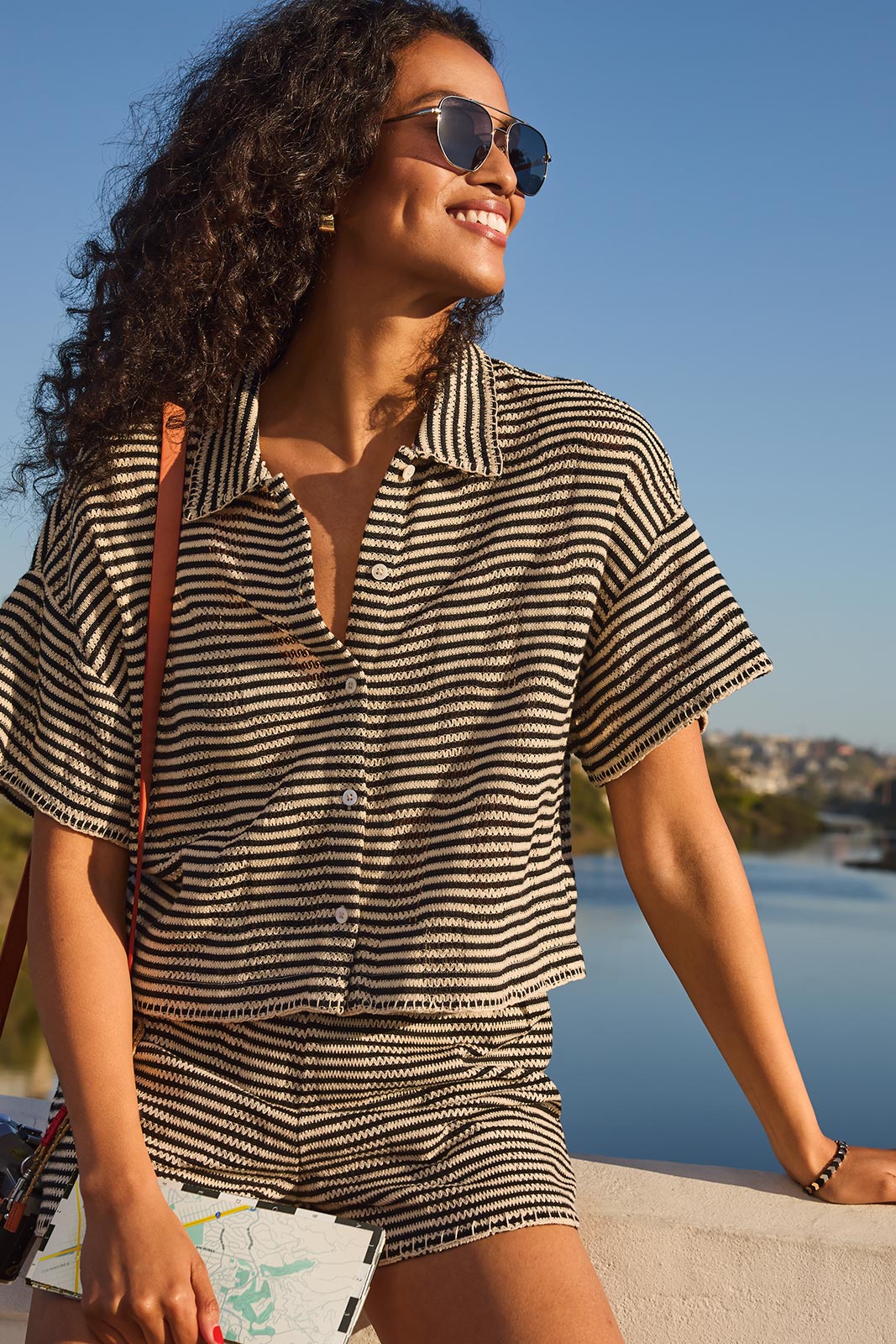 As comfortable as they are chic. these summery striped shorts by Z Supply are crafted in textured woven fabric with an elastic waistband and blanket stitch hems. Pair with the matching Monaco Button Up for the perfect warm-weather set.