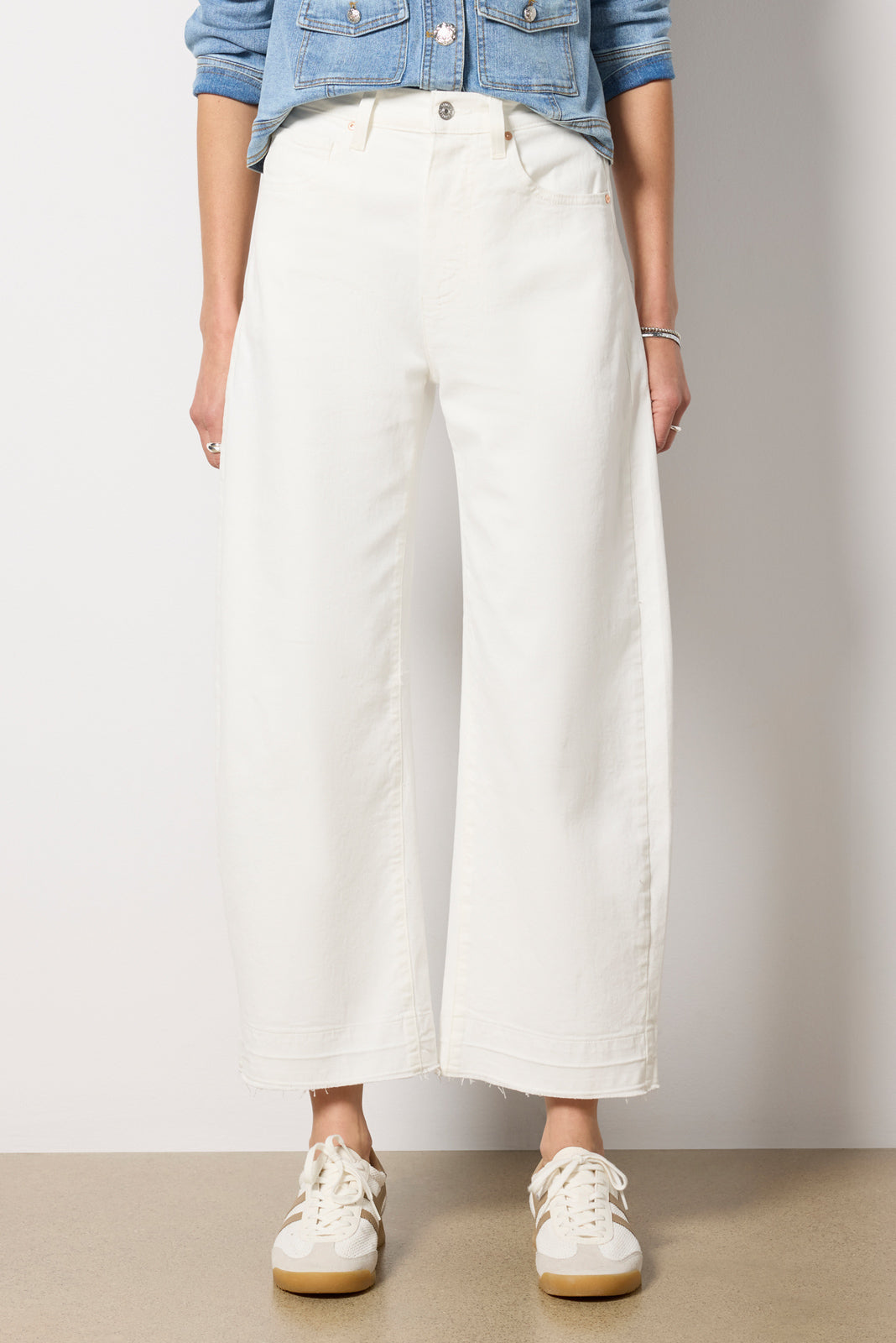 Released hems add a lived-in feel to the Arellia barrel leg jean by Paige. crafted in soft?ecru denim with a high-rise fit and ankle-length inseam.