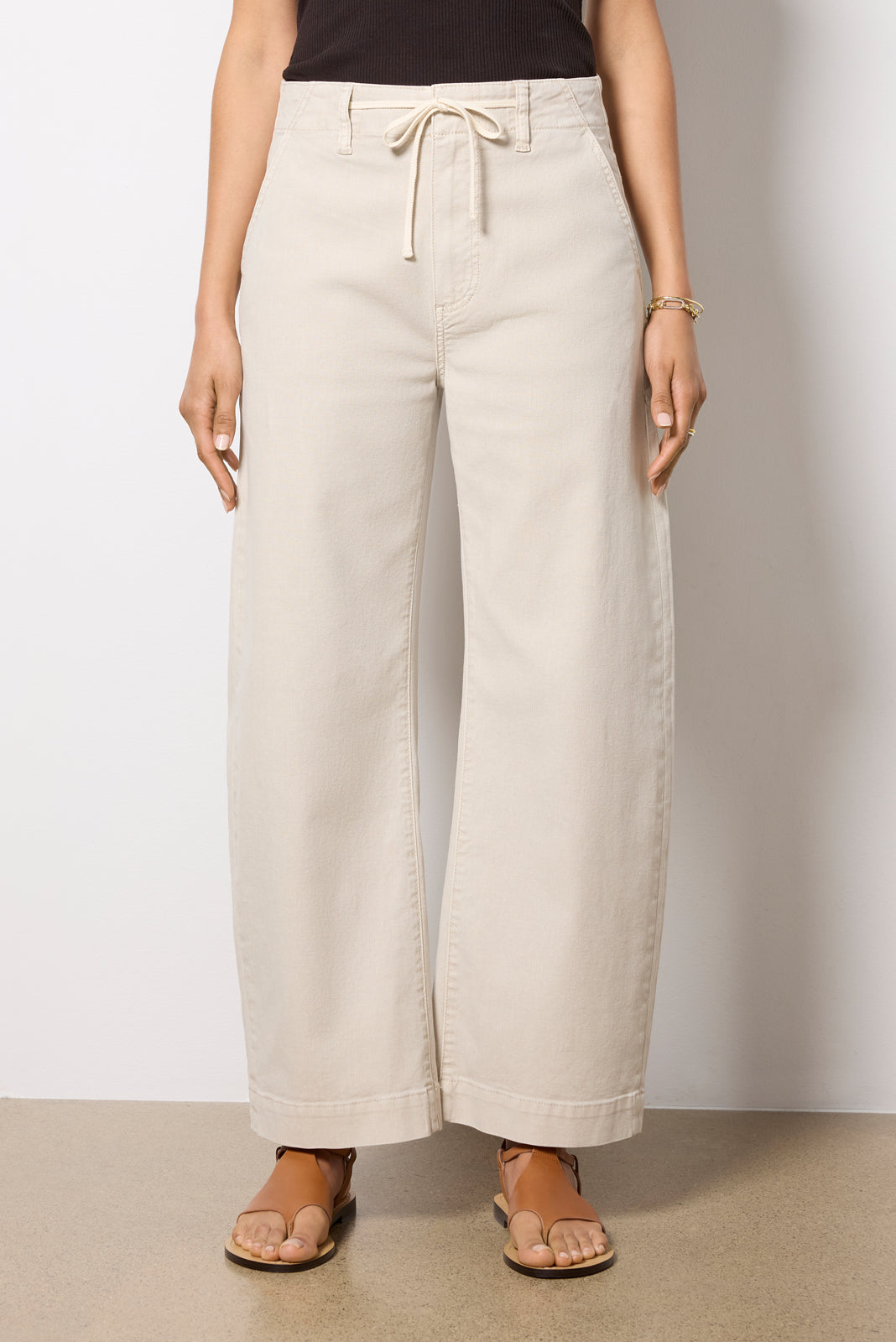 Crafted in a structured cotton with a hint of stretch. these versatile pants by Paige feature a tie waist with a zip fly. a barrel leg silhouette. and a high-waist fit.?