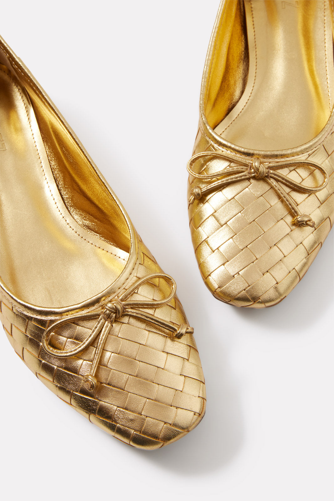 Chic and eye-catching. these gold ballet flats by Schutz are crafted in woven metallic leather with a squared toe and bow detail. Wear them with your favorite dresses or wide leg jeans.