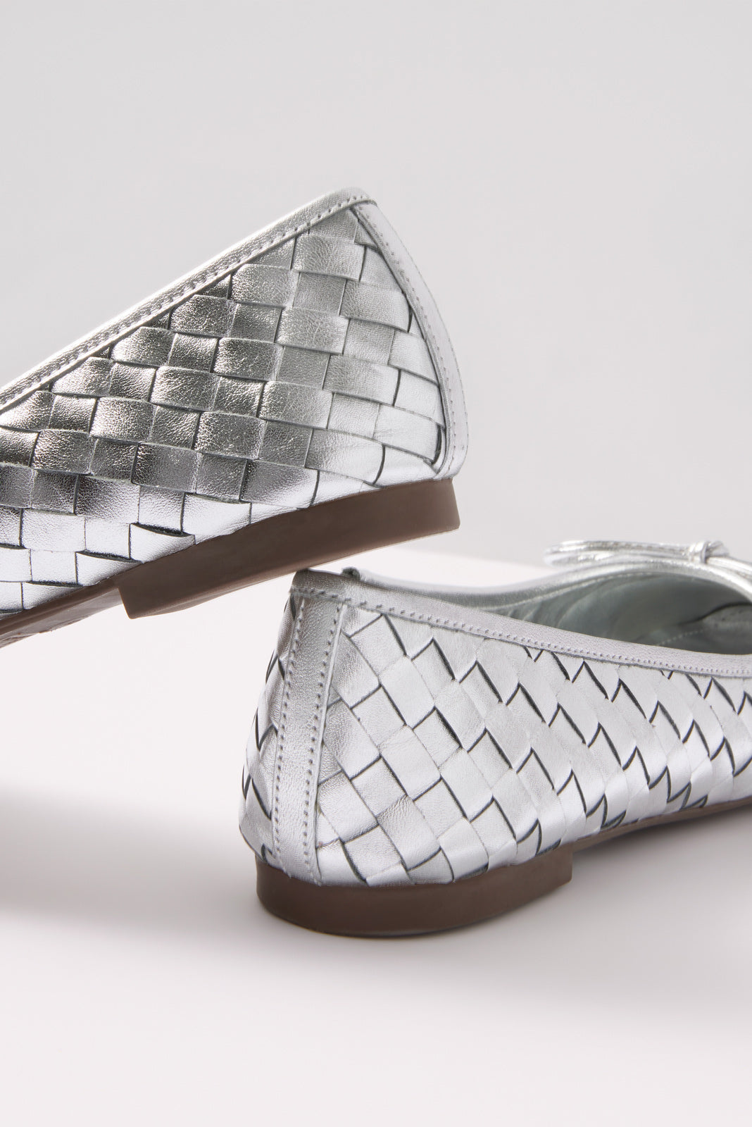Chic and eye-catching. these?silver ballet flats by Schutz are crafted in woven metallic leather with a squared toe and bow detail.