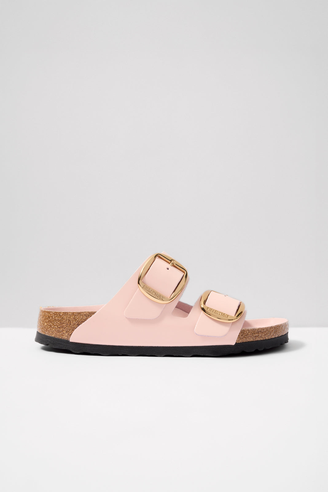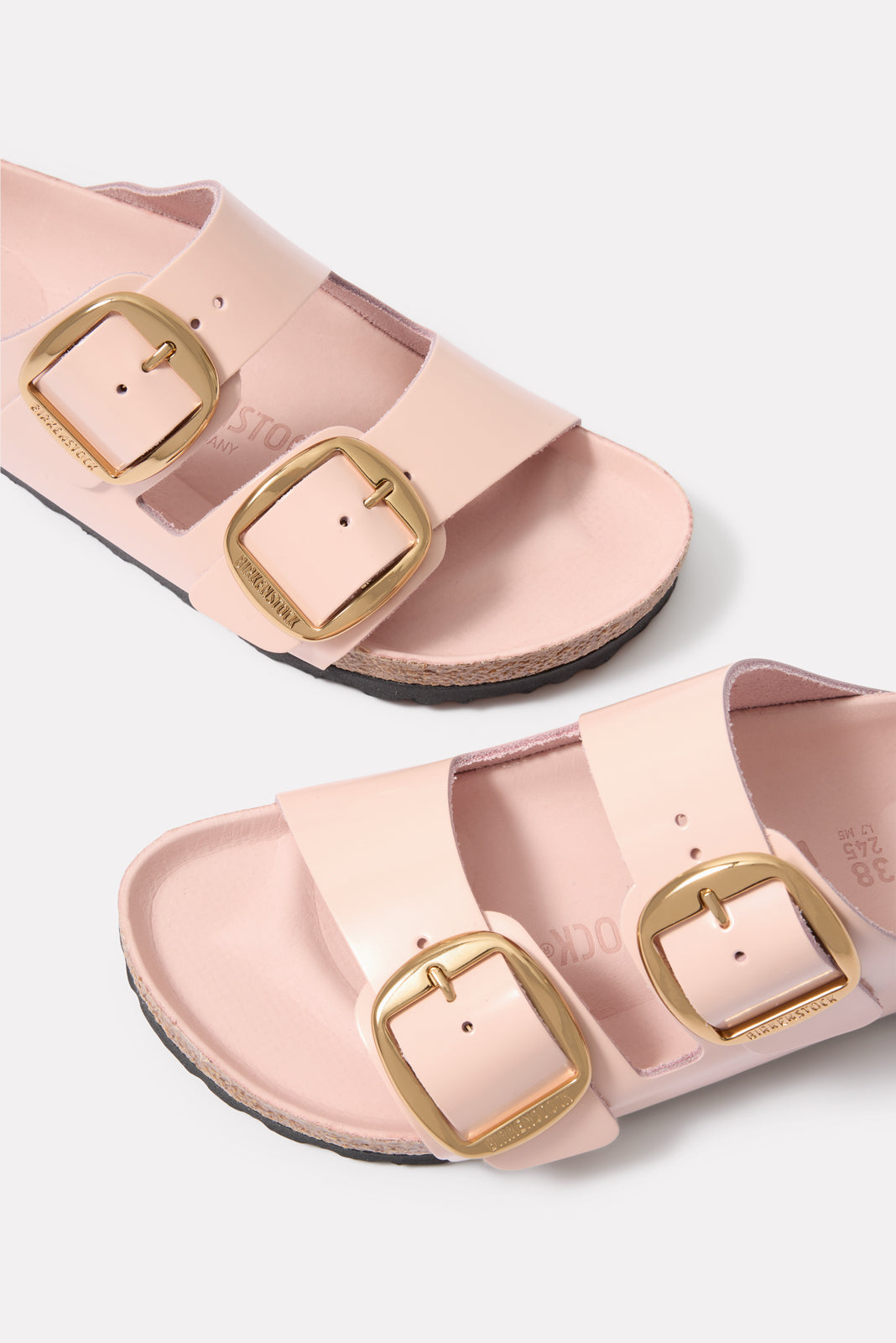 Bold gold-tone buckles update these iconic Arizona sandals by Birkenstock. featuring pink leather straps in a shiny patent finish.