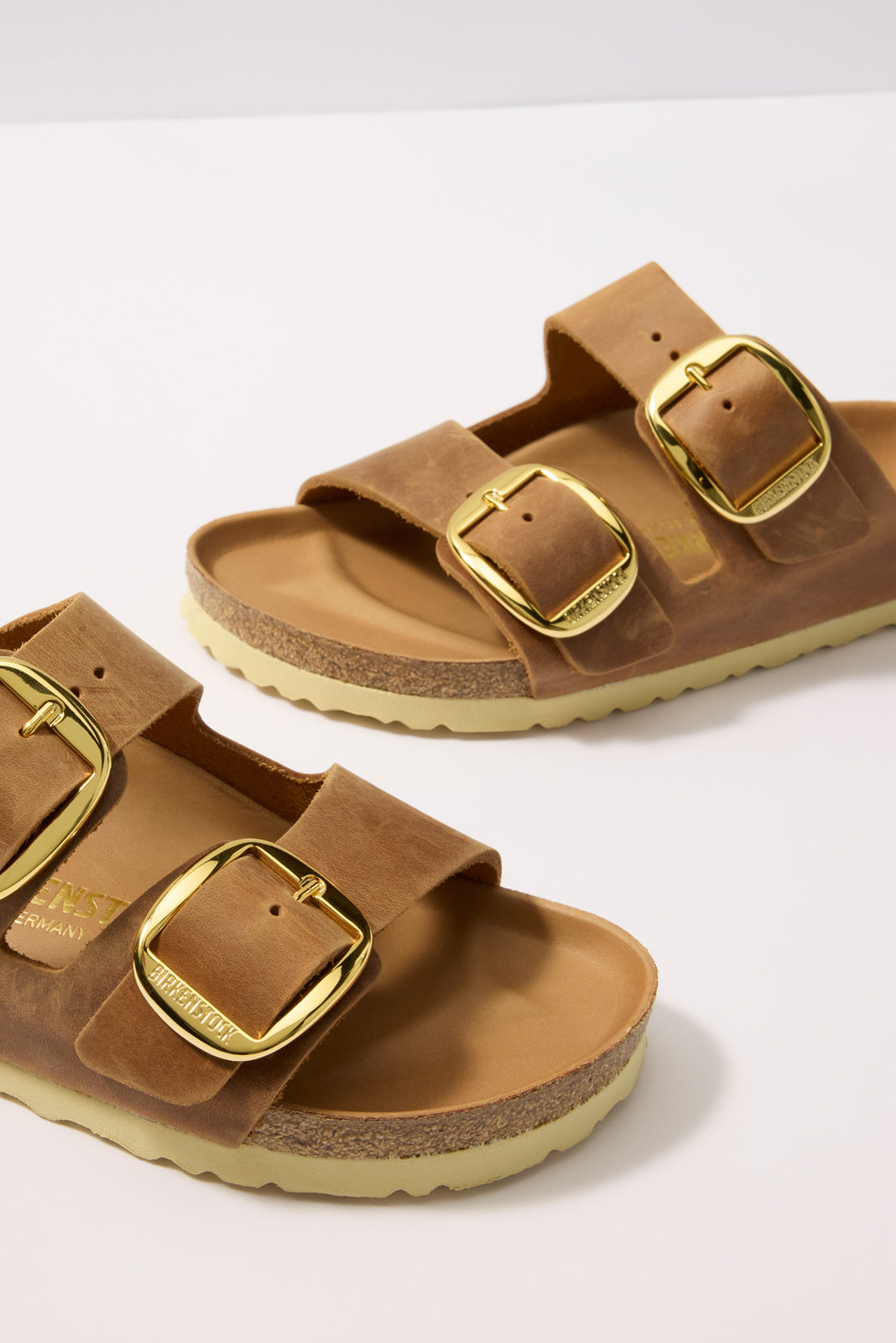 Bold gold-tone buckles update these iconic Arizona sandals by Birkenstock. featuring leather straps and a comfortable cork footbed.