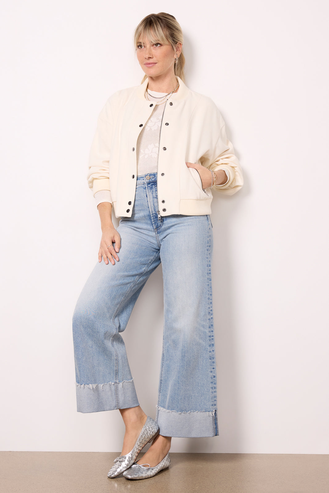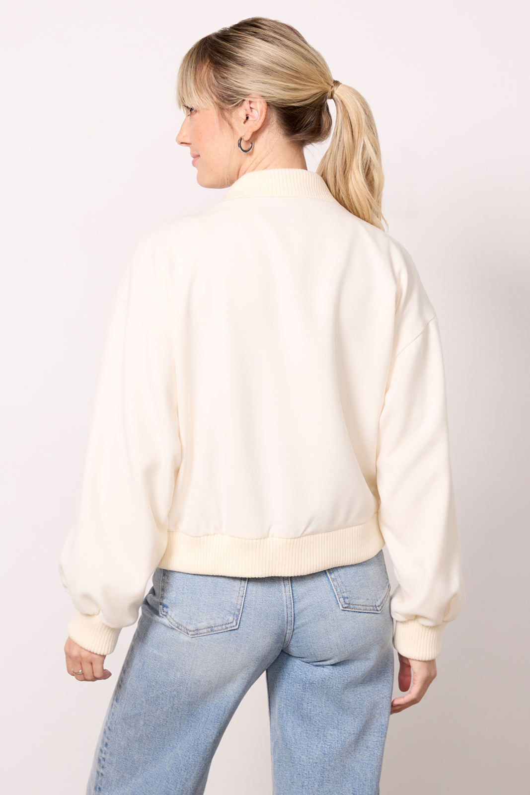 The Arlo Bomber by EVEREVE is the perfect finishing layer for all your cold-weather looks. featuring contrast ribbing along the cuffs and neckline. a zipper and snap button closure. and a relaxed fit.?