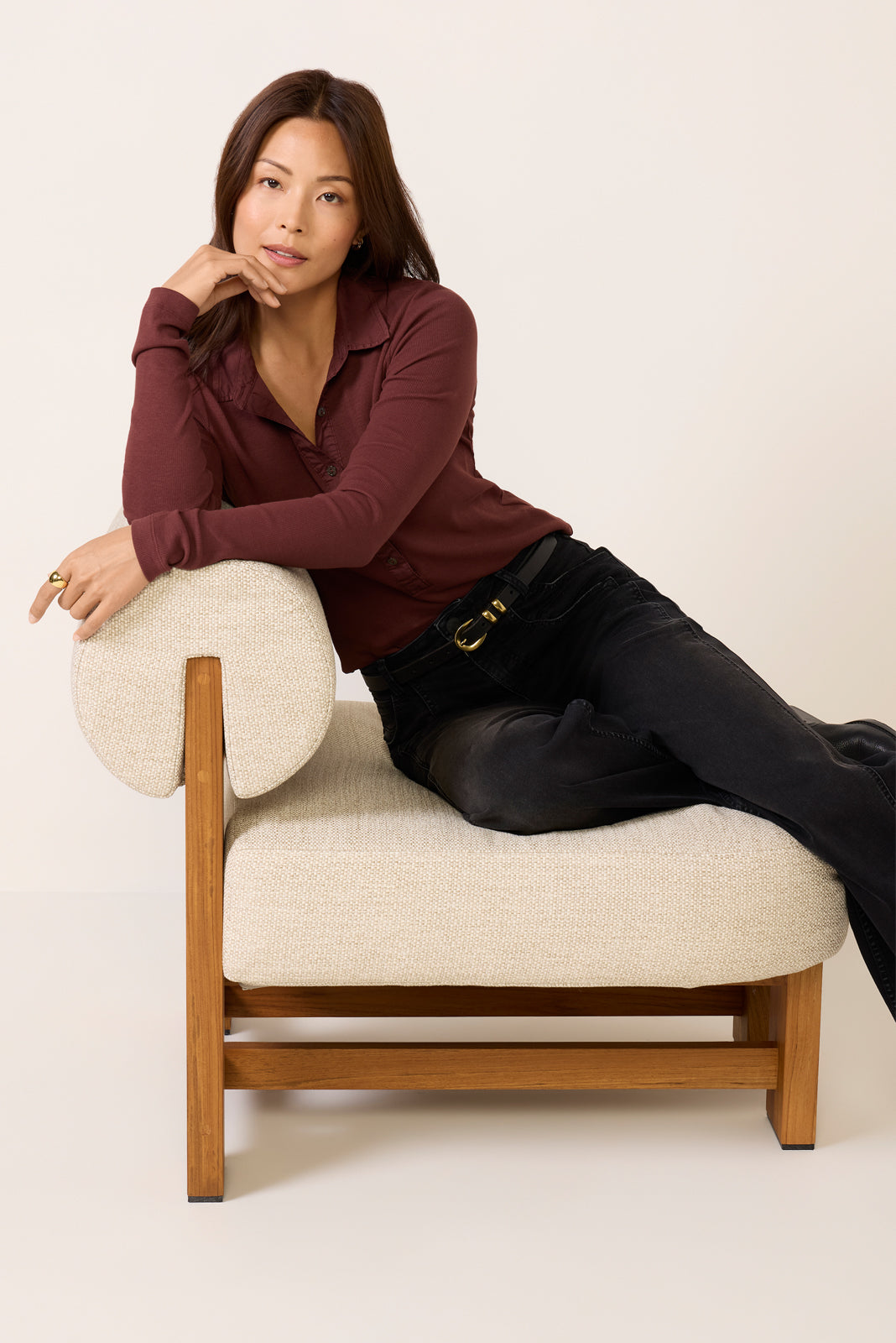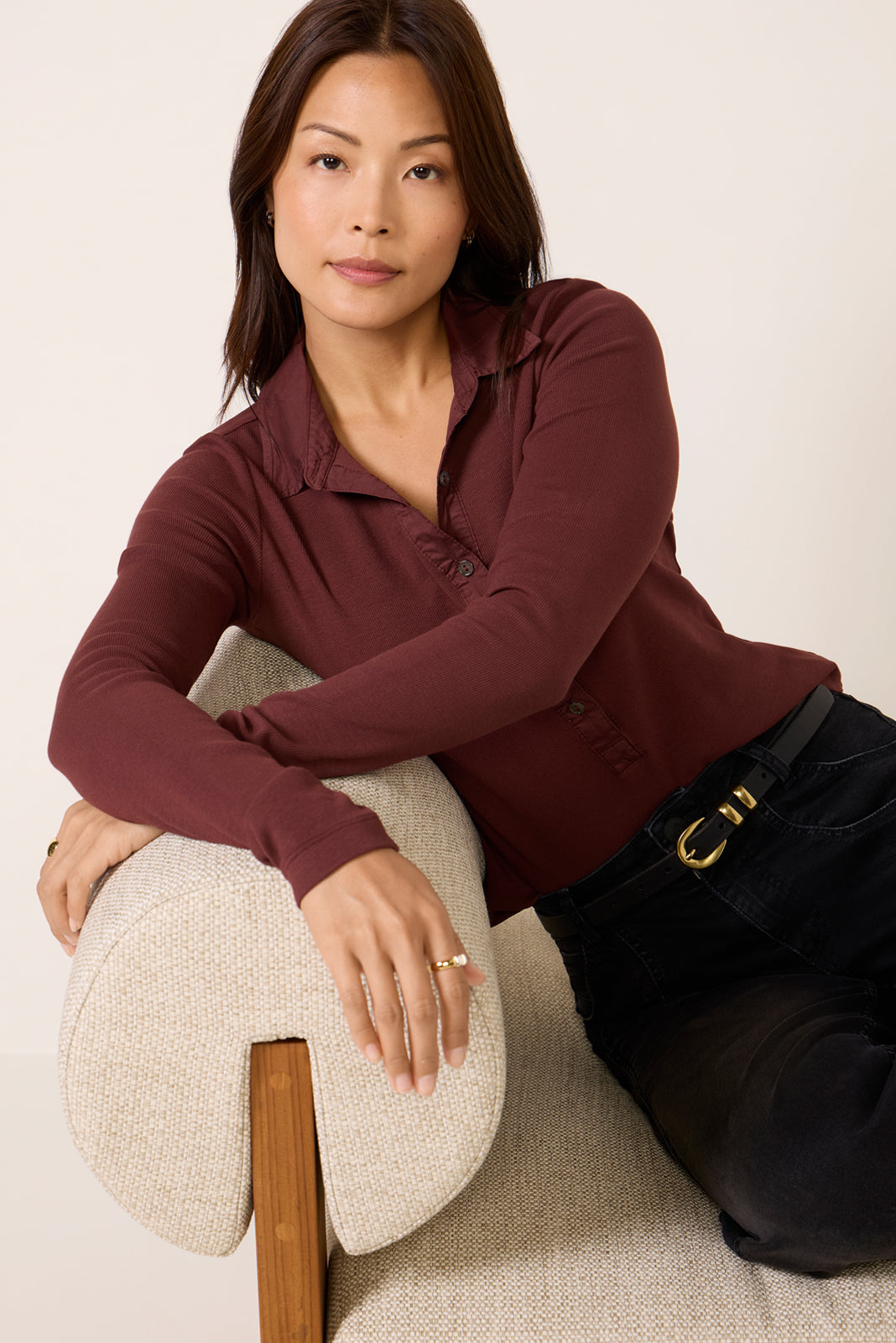 Buttery soft and oh-so-versatile. the Arvine Top by Velvet features a pointed collar. partial front buttons. and a fitted silhouette that’s perfect for adding your favorite layers.?