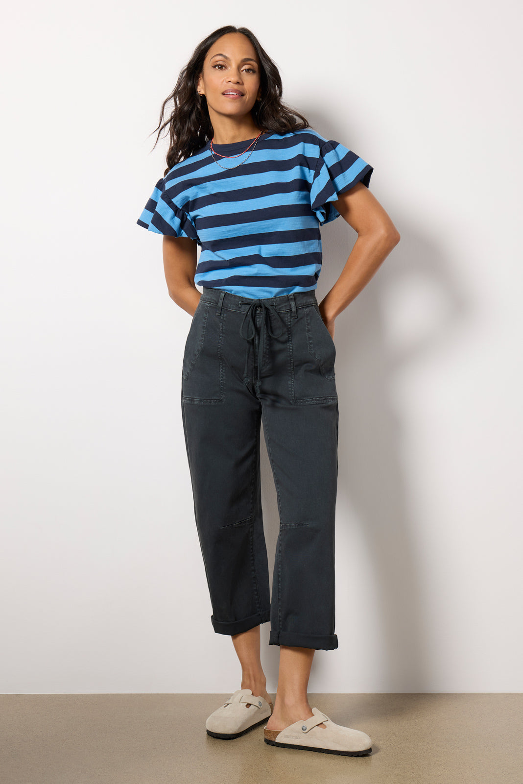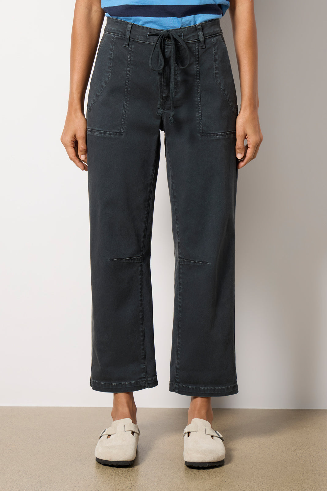Add a touch of utility-inspired style to your wardrobe with the Ashton barrel leg pant by KUT from the Kloth. Finished with an adjustable tie waist. these high-rise pants feature a relaxed fit. cropped hems. and utility pockets at the front and back.