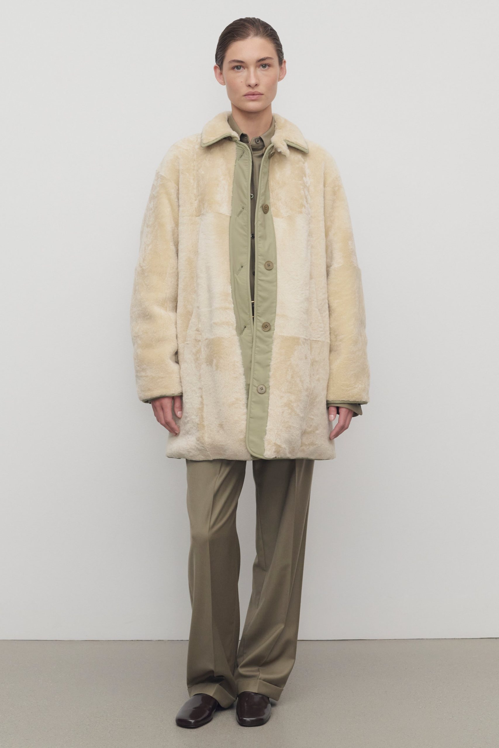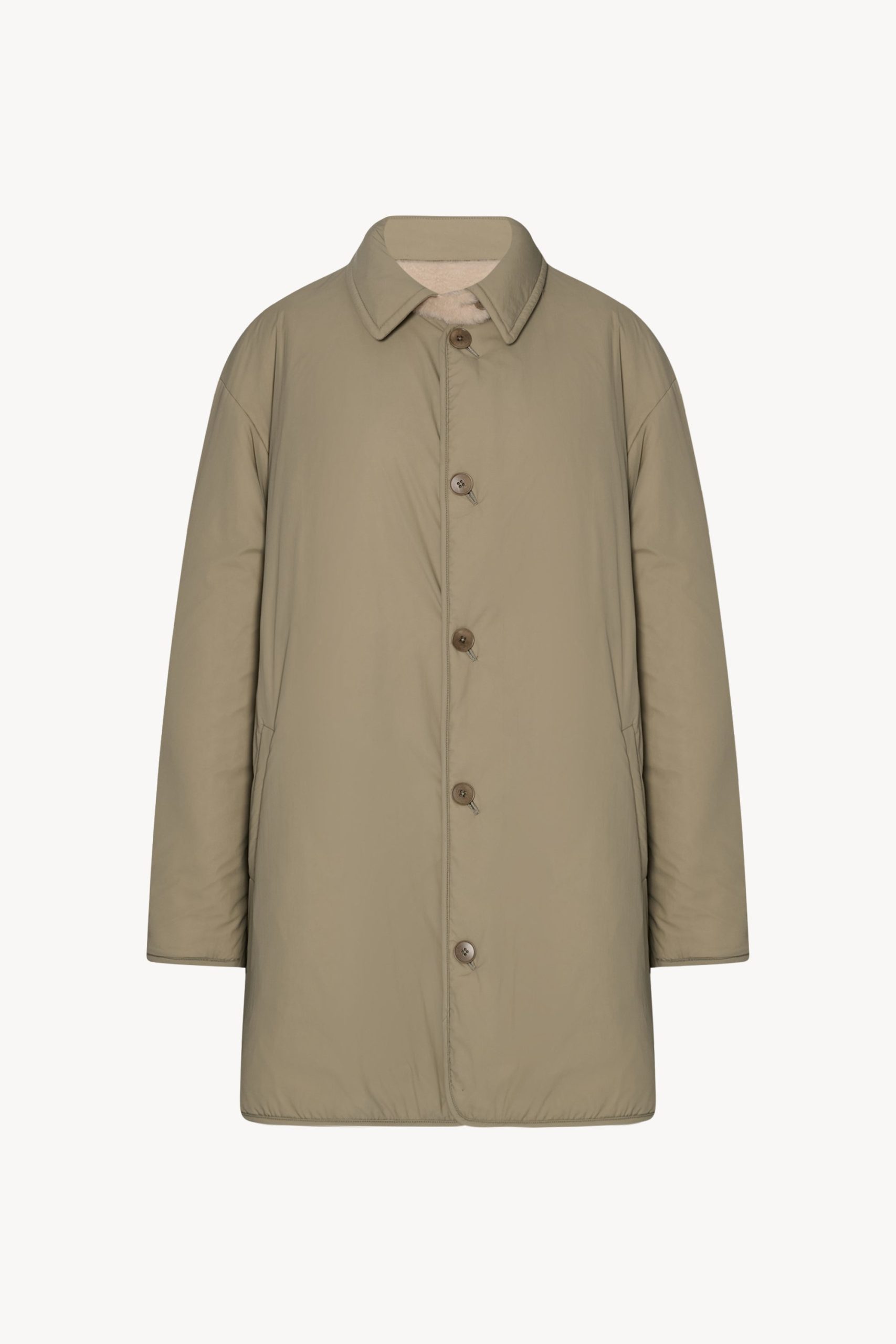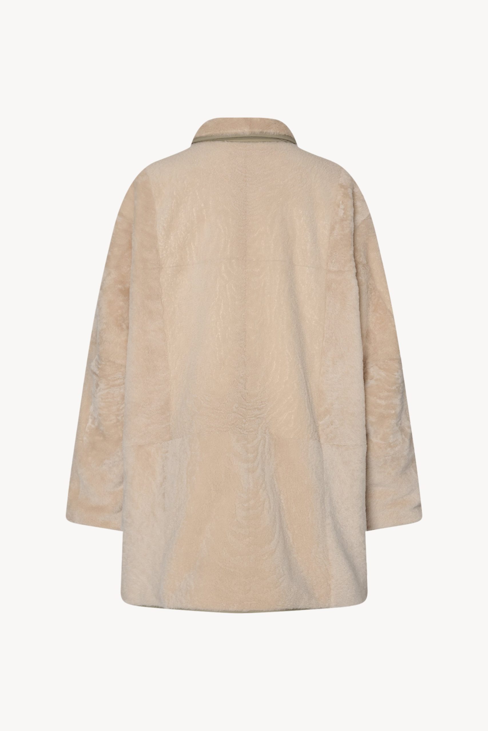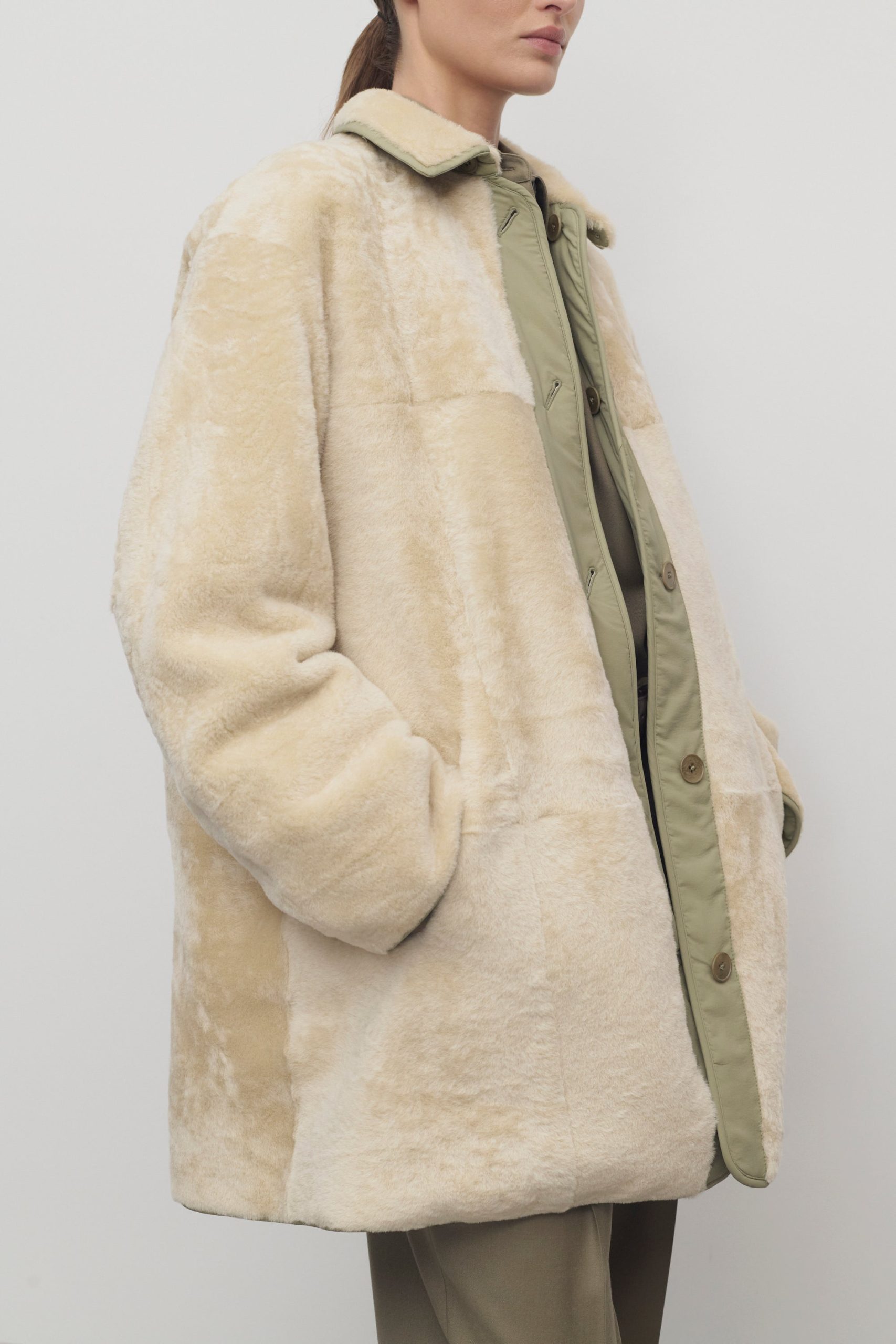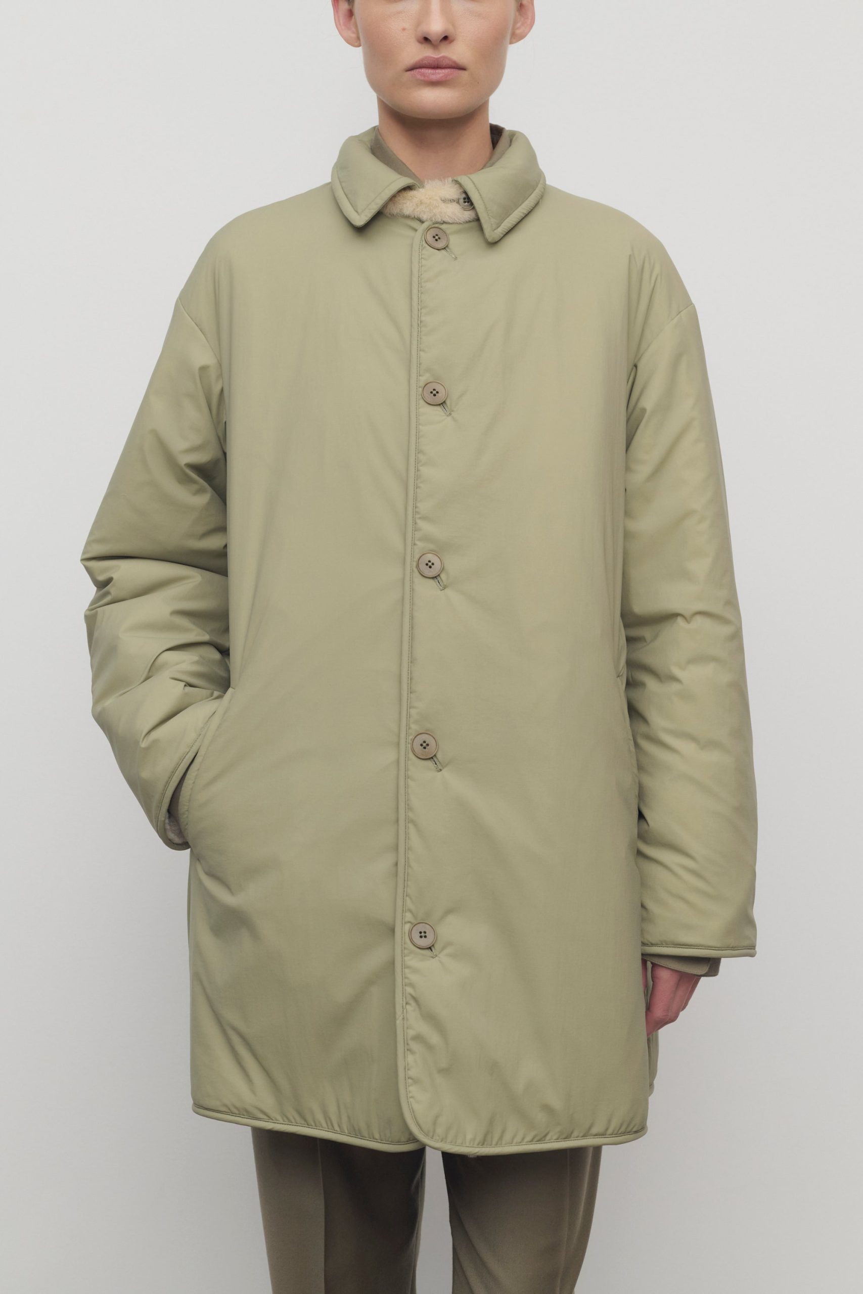 Oversized reversible coat in technical nylon and supple lamb shearling with detachable collar. nylon trim and elbow patch details. and exposed front button closure.