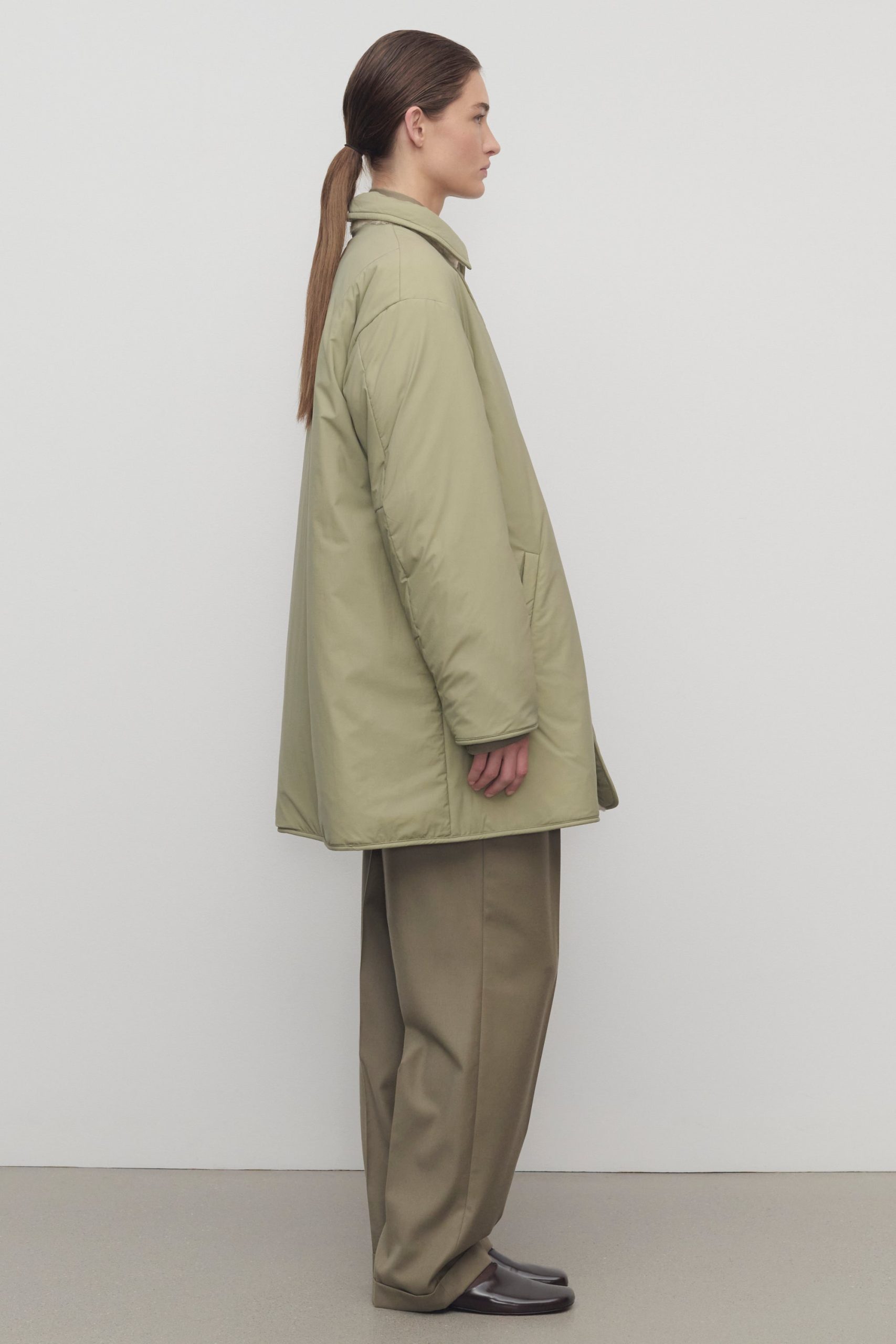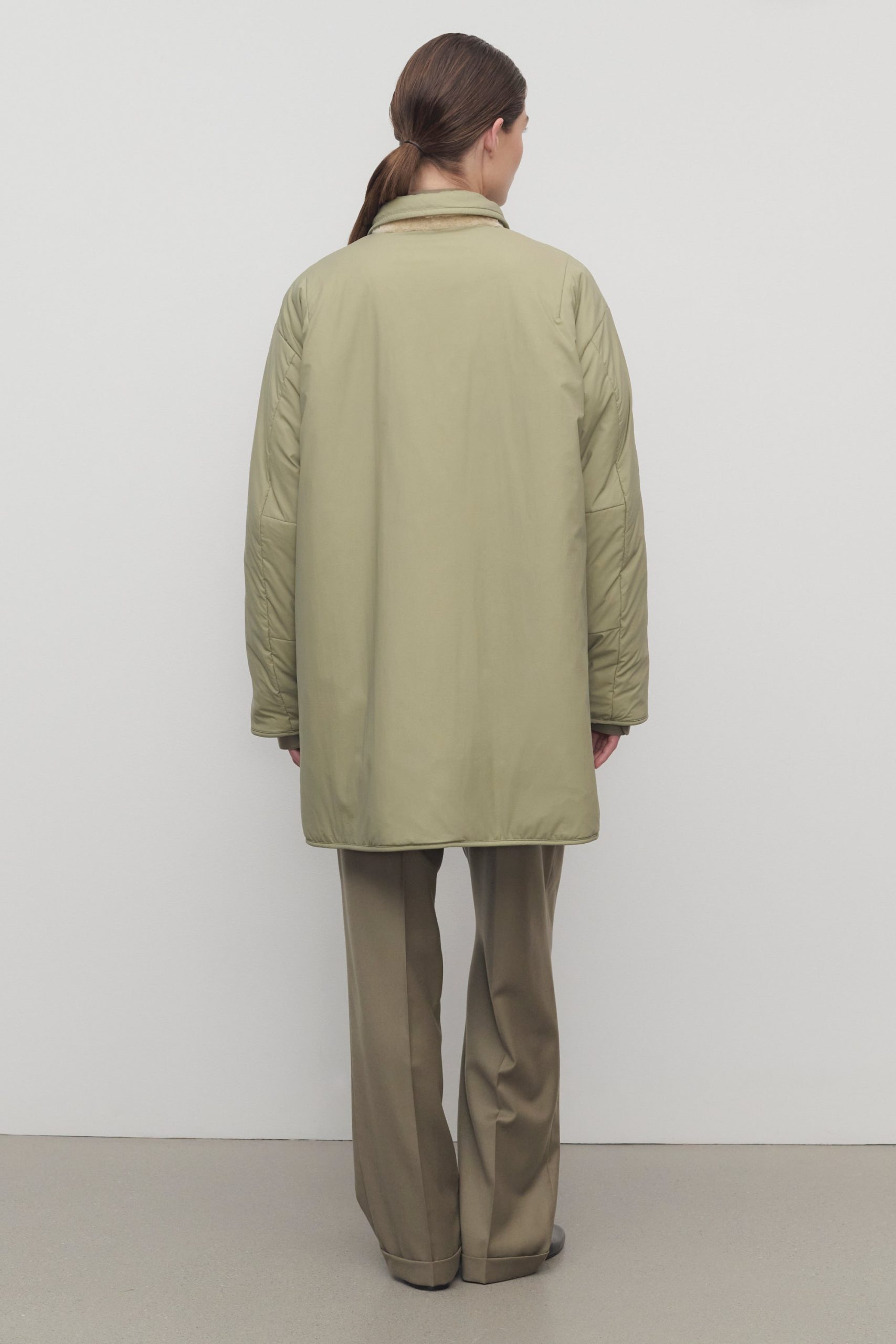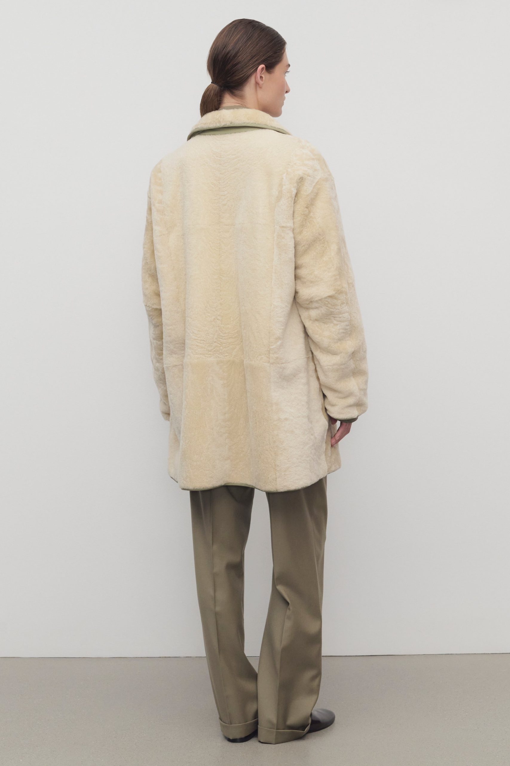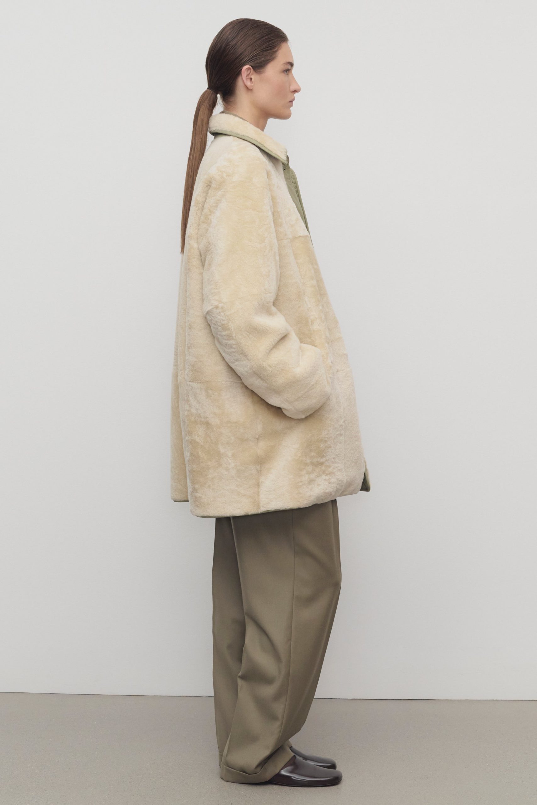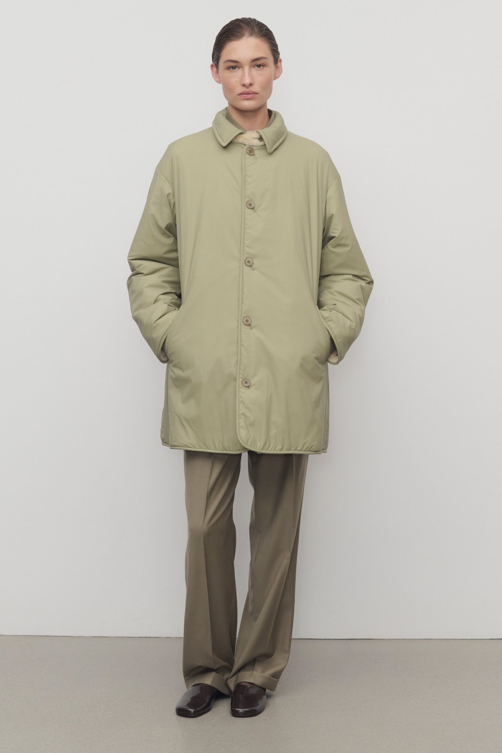 Oversized reversible coat in technical nylon and supple lamb shearling with detachable collar. nylon trim and elbow patch details. and exposed front button closure.