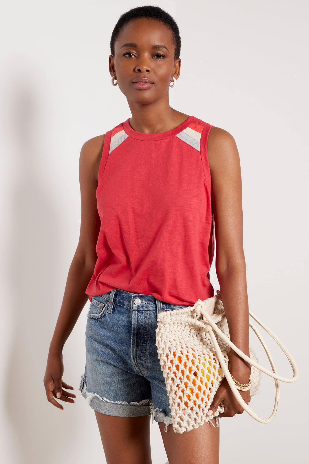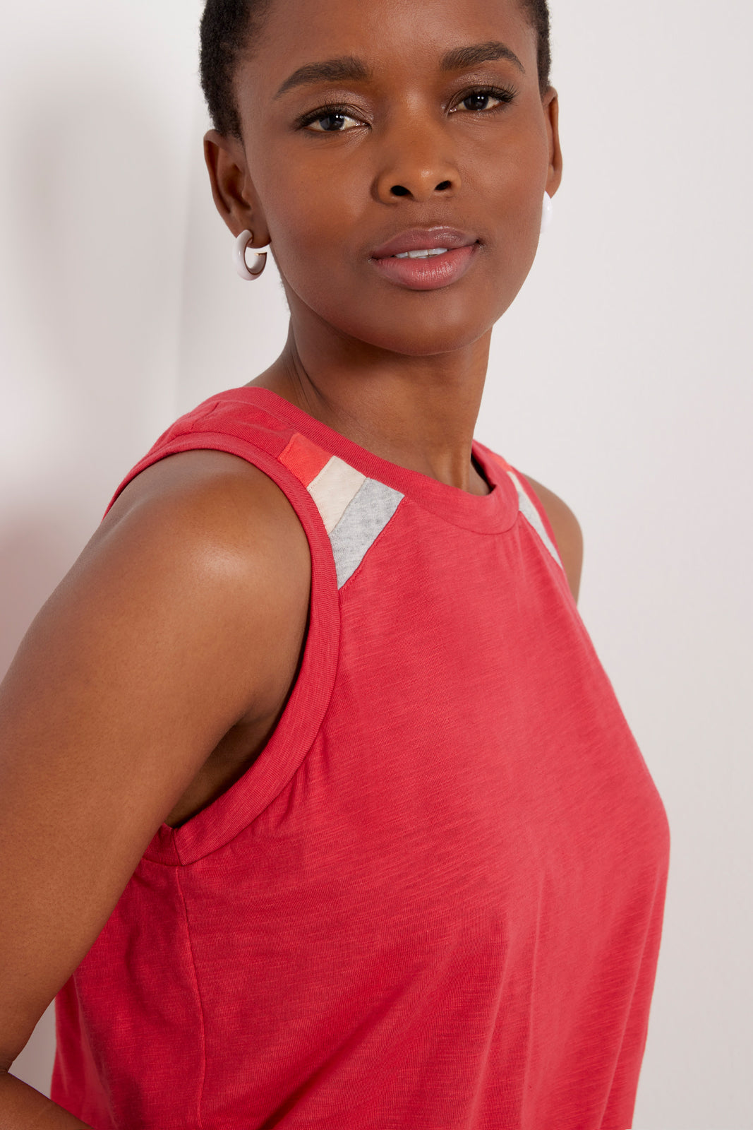 A colorblocked shoulder detail adds a vibrant twist to this essential EVEREVE tank. crafted in soft cotton slub fabric with a crew neckline and curved hem. It will be your go-to summer staple with?jeans. cutoffs.?and skorts.