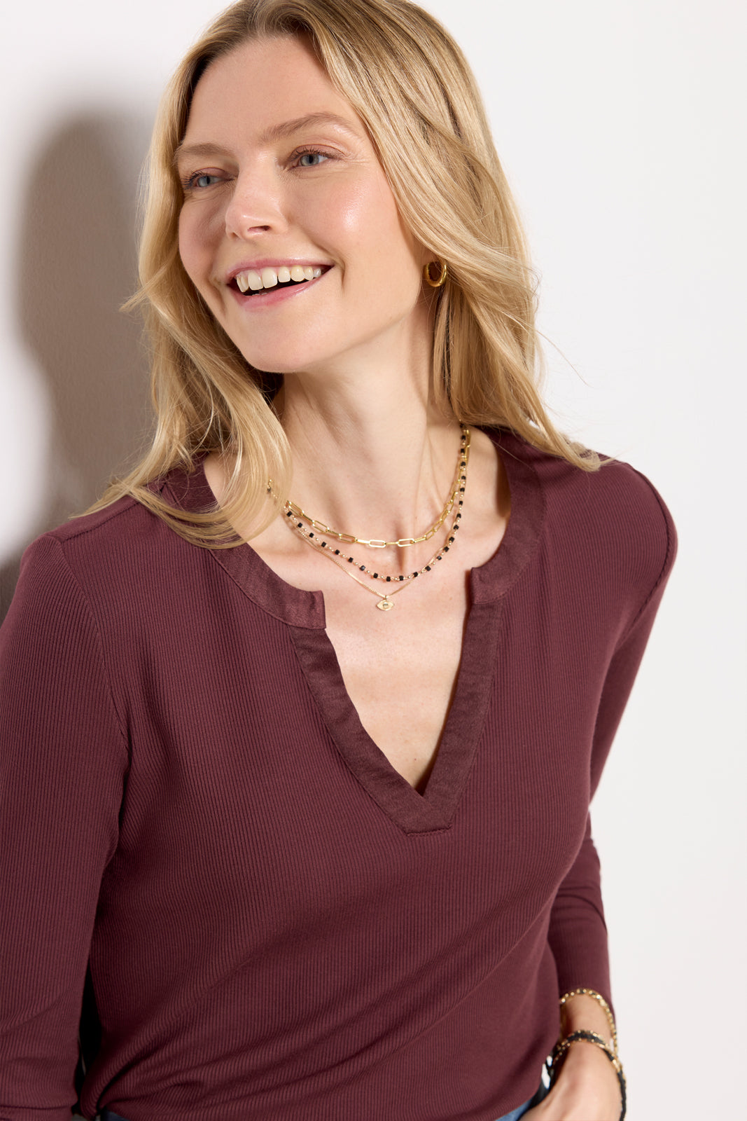 A split neckline with satin trim elevates the versatile Beau tee by EVEREVE. featuring a long sleeve silhouette. curved hem. and soft rib knit fabric. Layer with a shacket and jeans. or wear tucked into cargo pants.