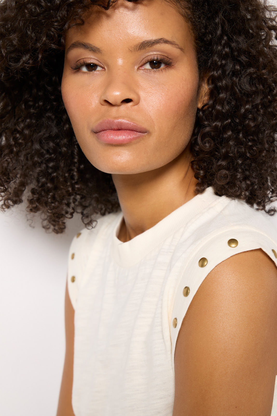 Crafted in a lightweight cotton. the Brinley Tee by EVEREVE features a crew neckline. studded sleeve details. and bra-friendly gussets at the armhole.?