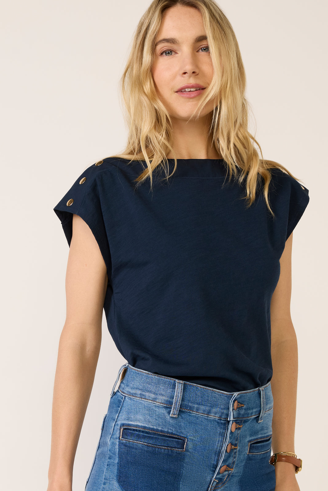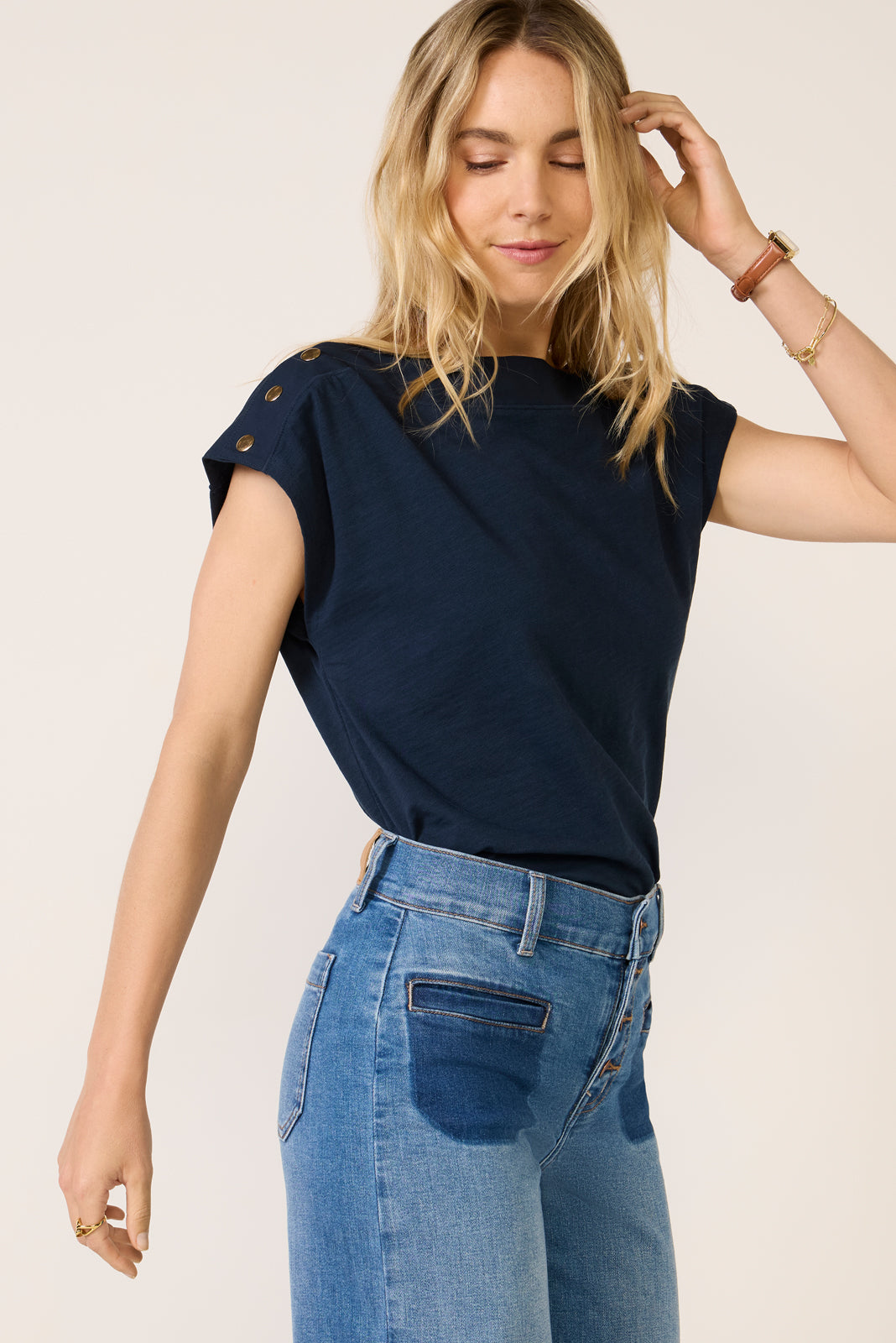 Gold-tone shoulder snaps elevate this stylish boat neck top by Nation LTD. featuring a slightly cropped fit. cap sleeves. and soft cotton slub fabric.