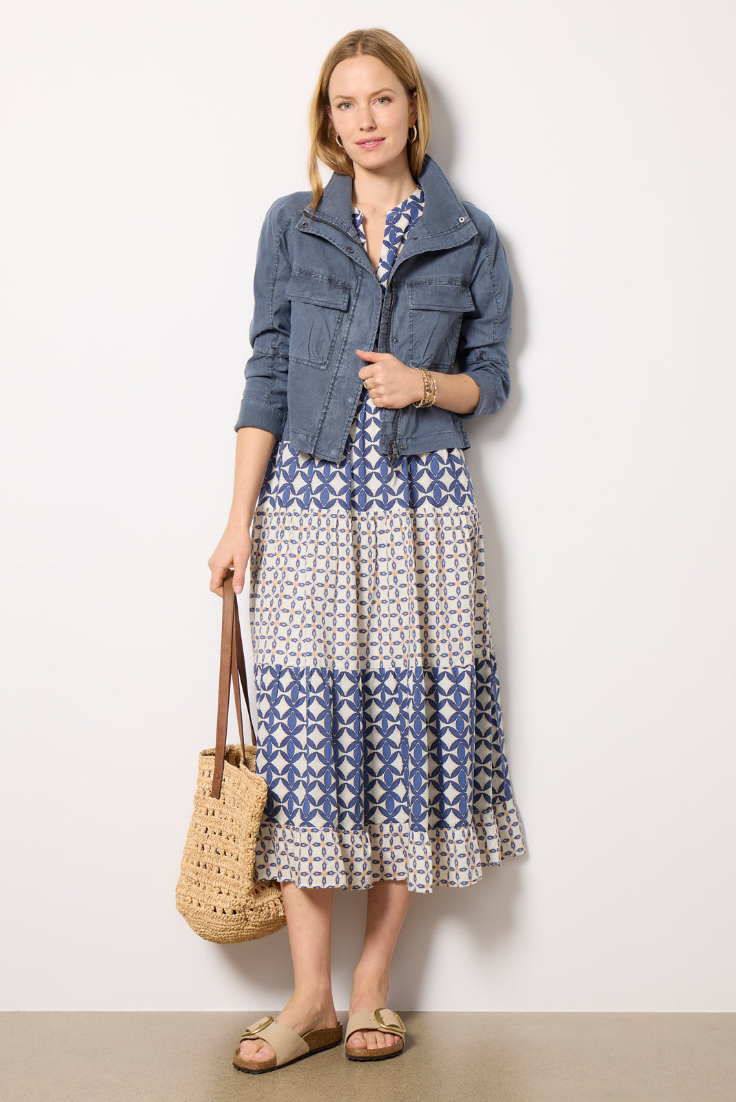 Chic with a utility-inspired edge. this EVEREVE jacket features a slightly cropped silhouette with a front zip and snap closure. chest pockets. and seamed raglan sleeves. The linen-blend fabric makes it the perfect lightweight layer.