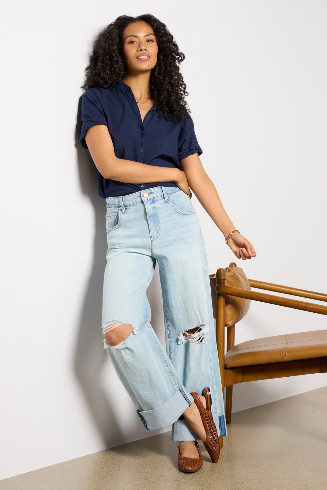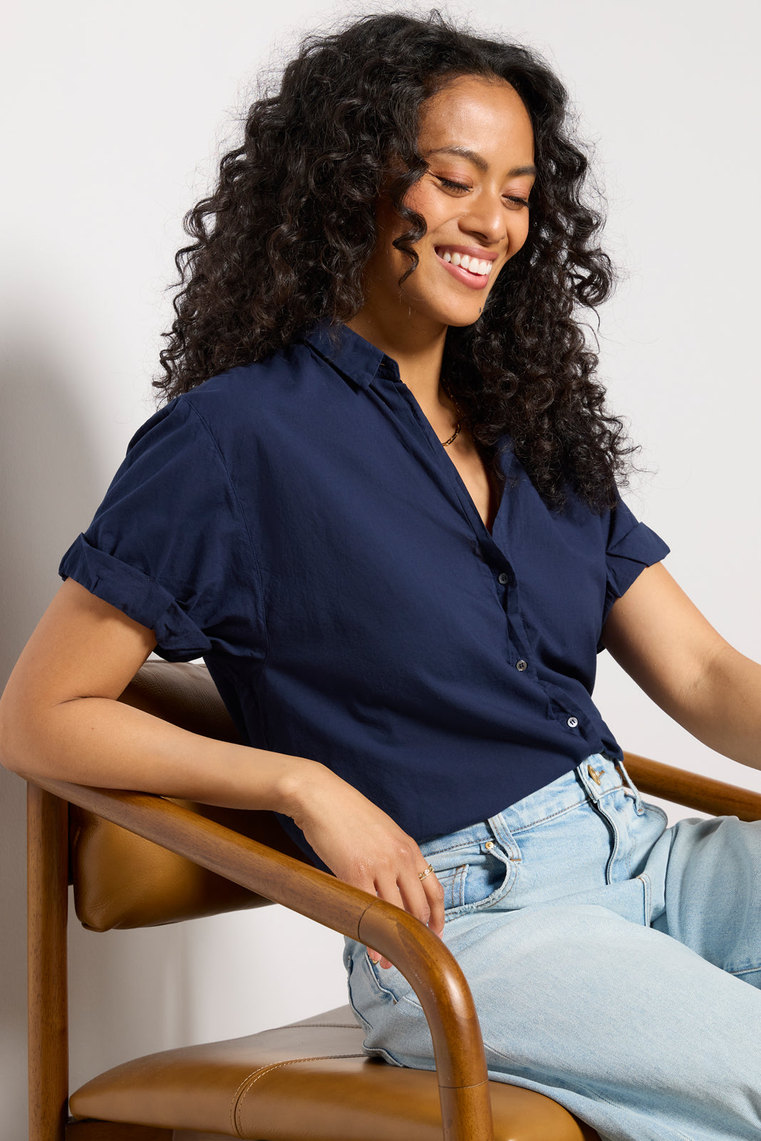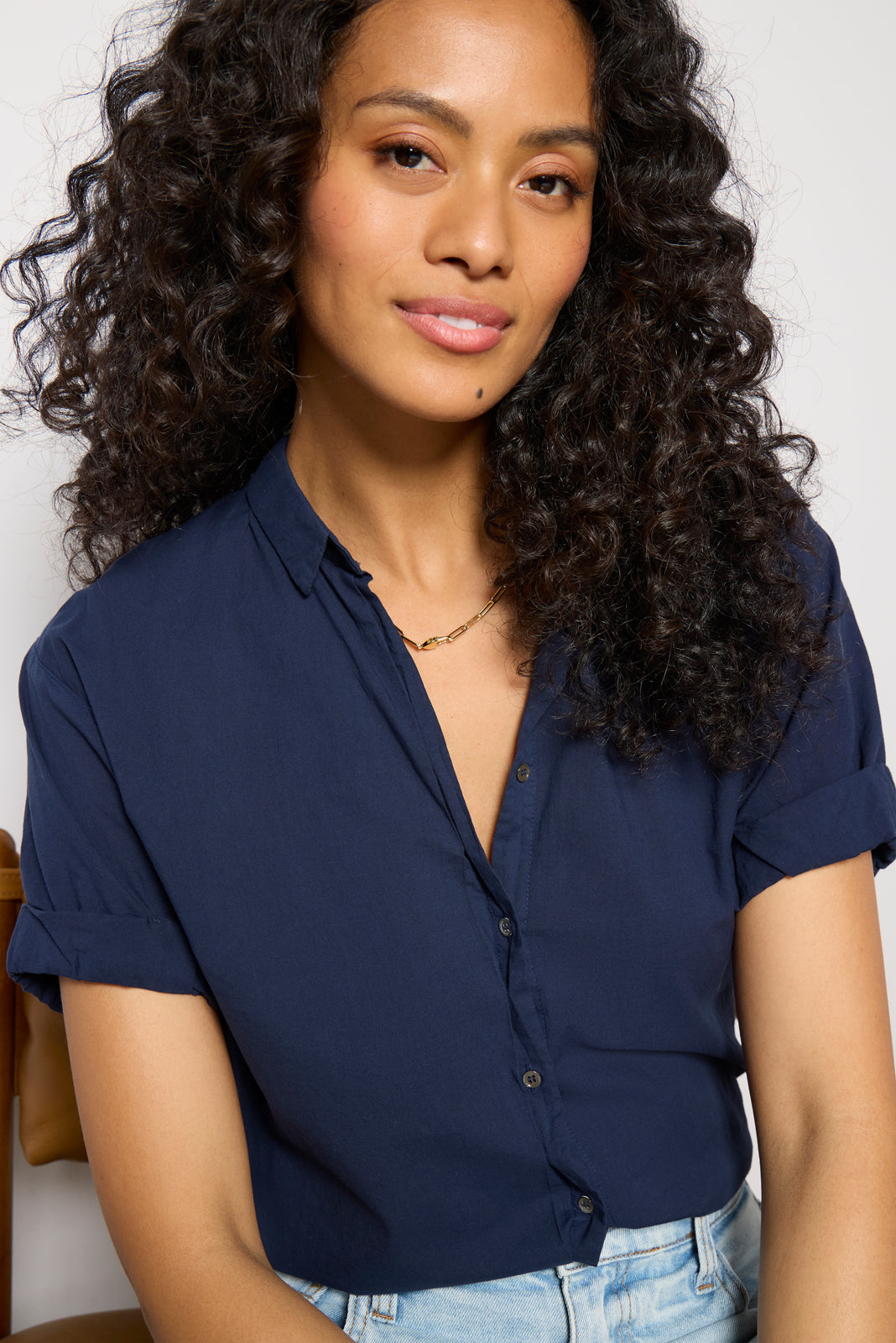 An effortlessly chic essential. the Channing button-down shirt by Xirena is?crafted in lightweight cotton poplin with a relaxed fit. curved hem. and rolled short sleeves for a bit of edge. Style with a pair of cargo pants. or wear half-tucked into your favorite jeans.