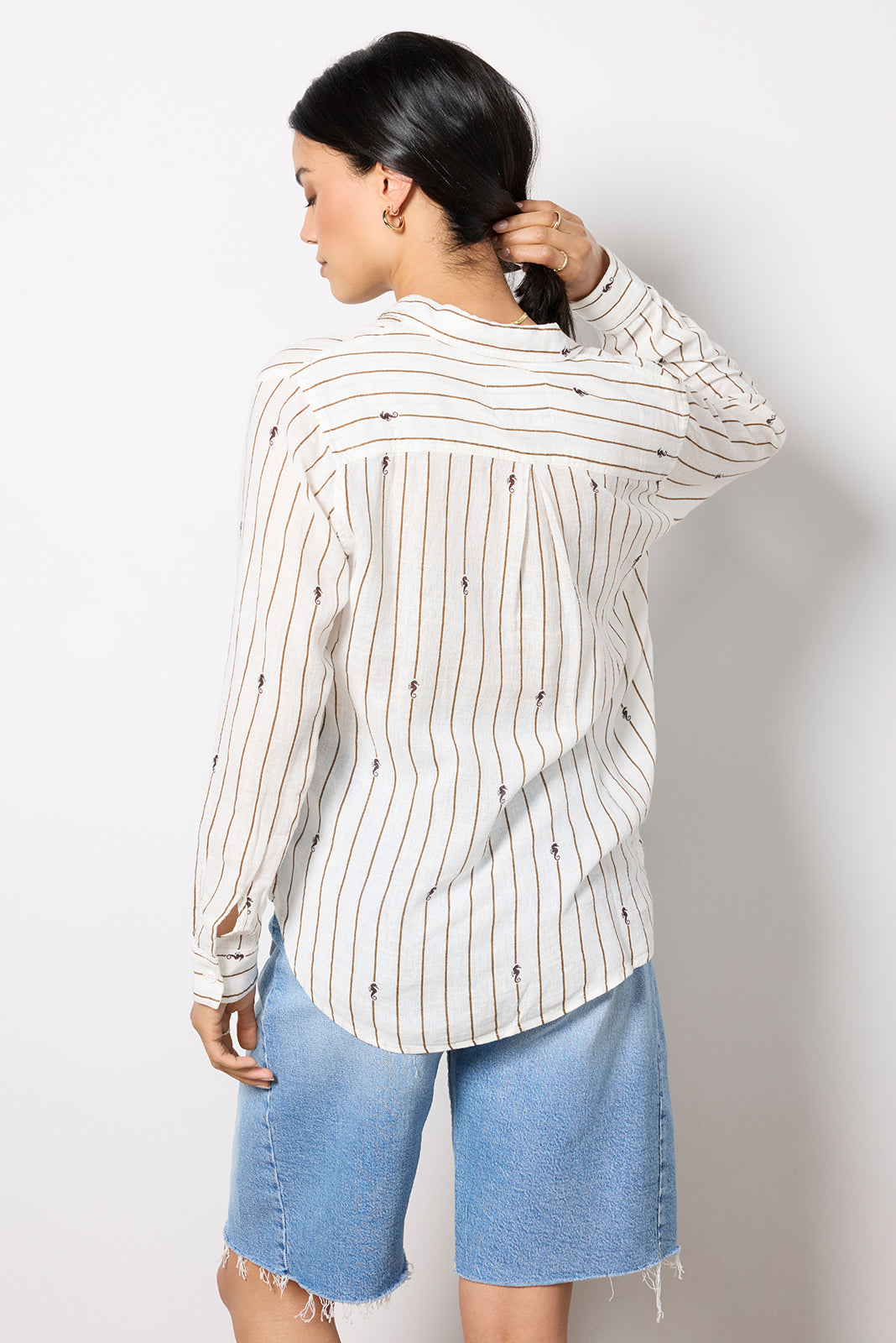 A?playful seahorse pattern adorns this summery button-down shirt by Rails. crafted in breezy linen-blend fabric with a relaxed fit. curved hem. and left chest pocket.