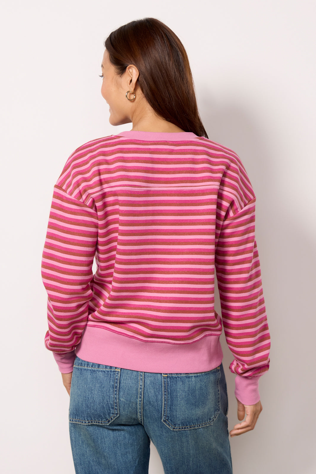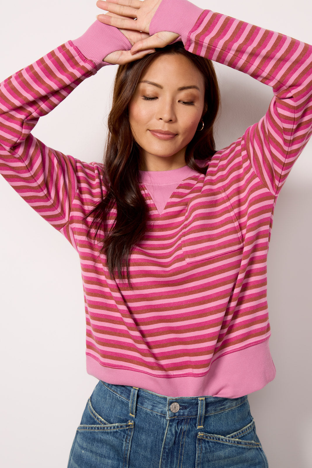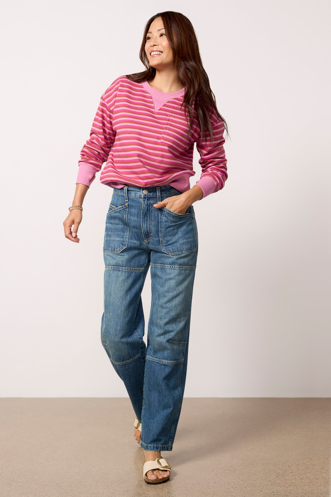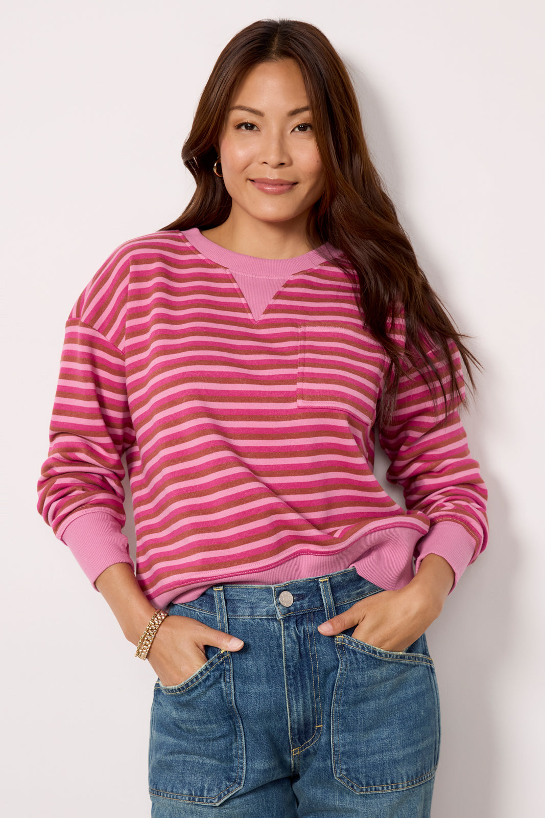Keep it casual-chic in this striped crewneck sweatshirt by EVEREVE. Finished with dropped shoulders?and a left chest pocket. this relaxed pullover features thumbhole cuffs. ribbed trim. and washed?knit fabric for a comfortable. lived-in feel. Wear it with jeans. cargo pants. or your favorite leggings.