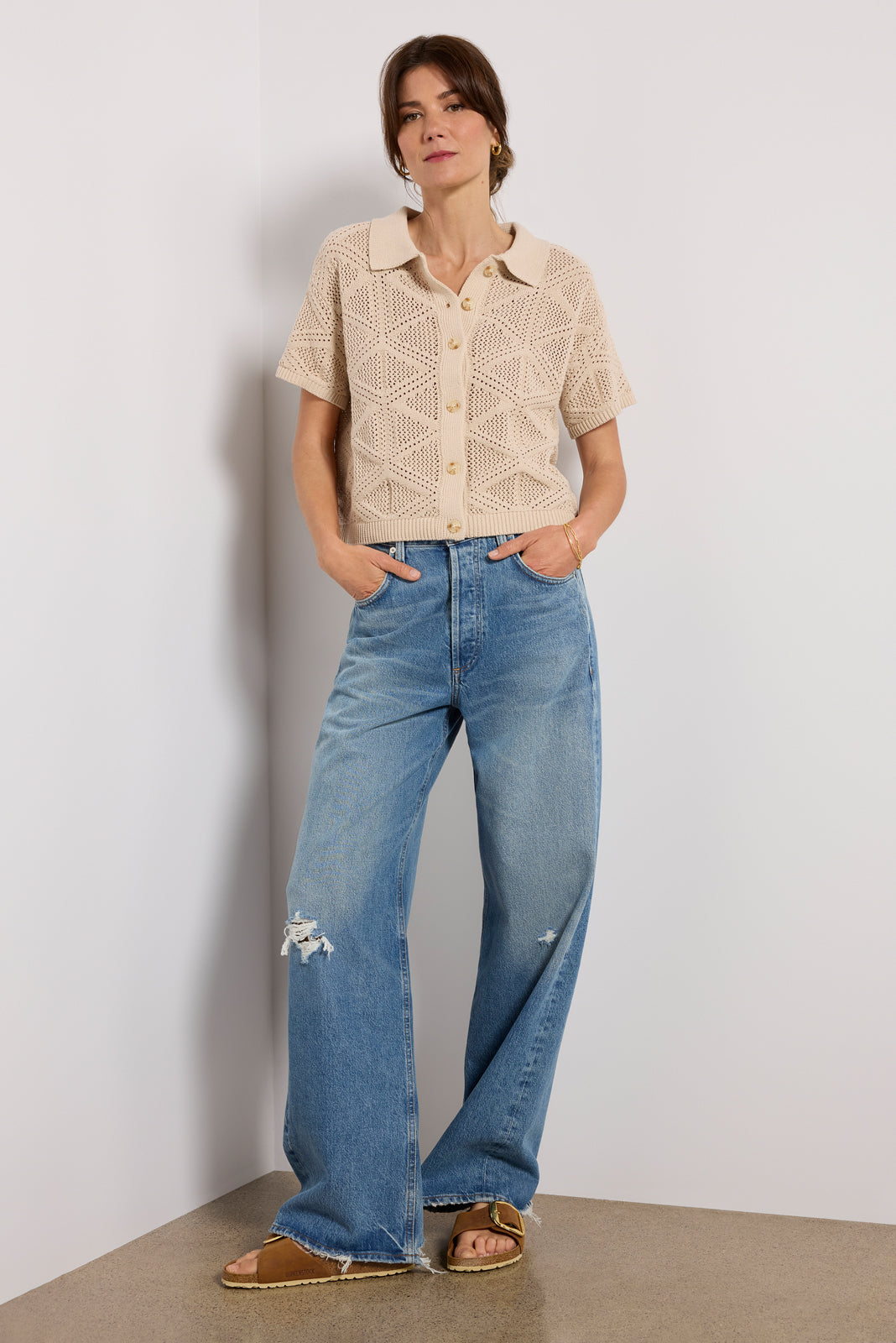Easy and on-trend. the Chase Pullover from EVEREVE features a point collar. front button closures.?open-knit details. and a relaxed fit.?