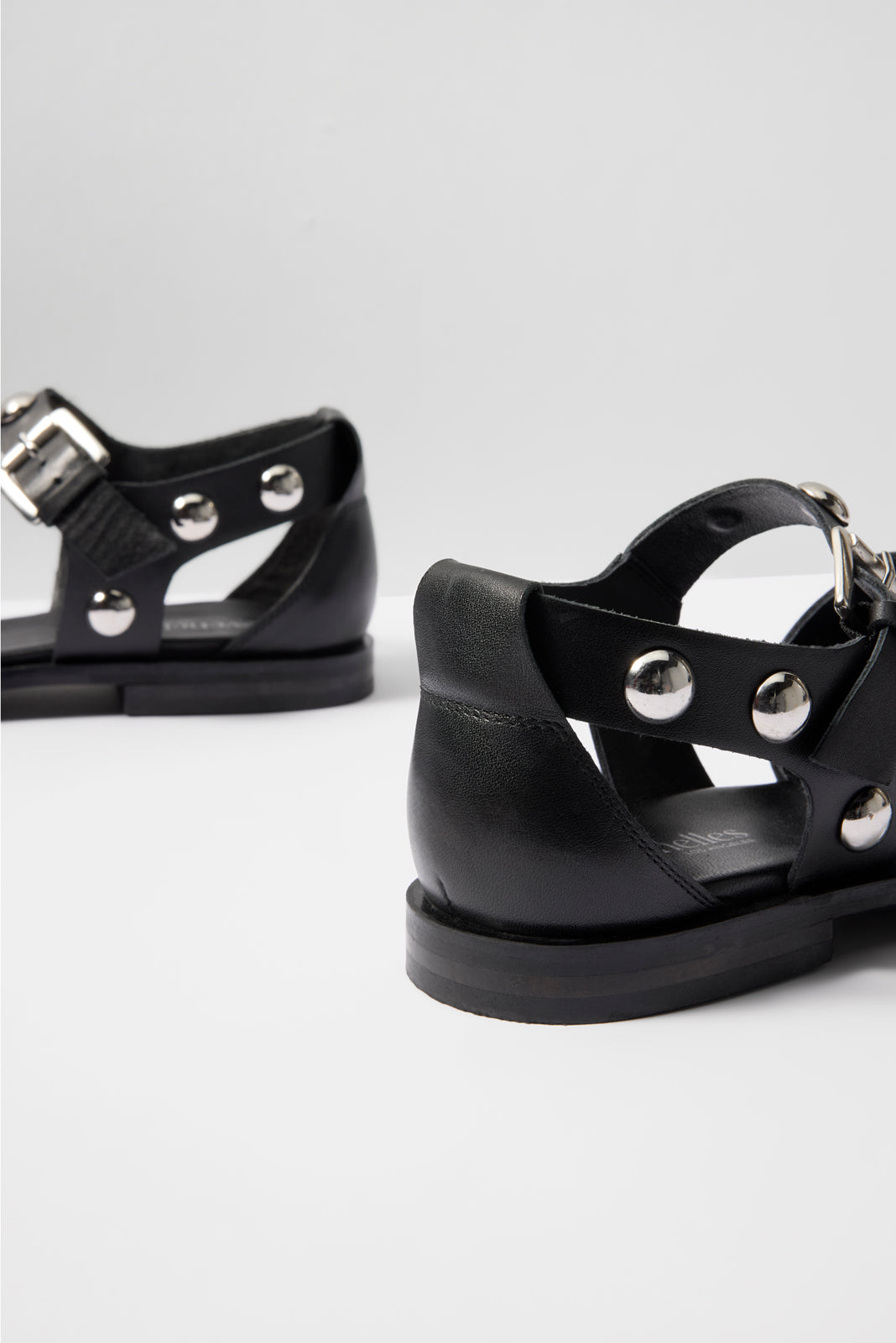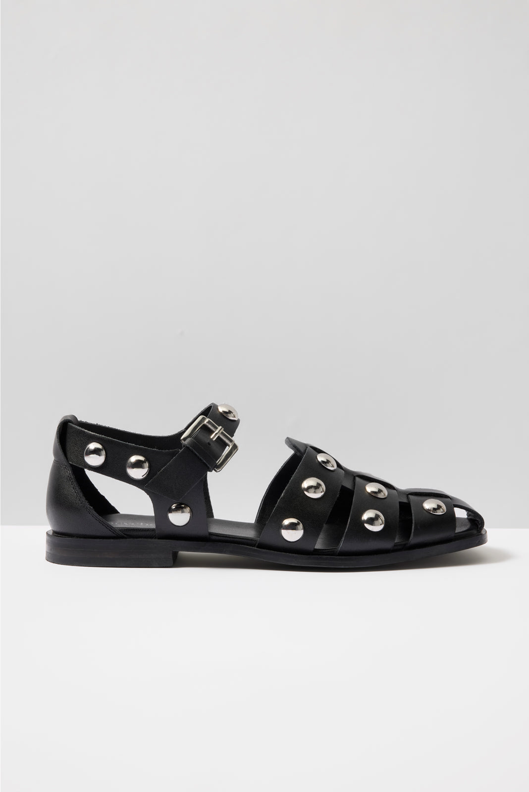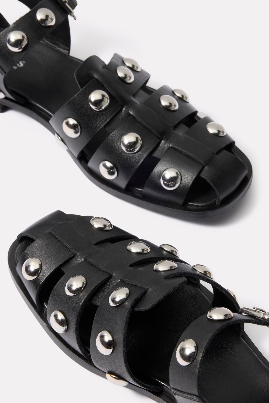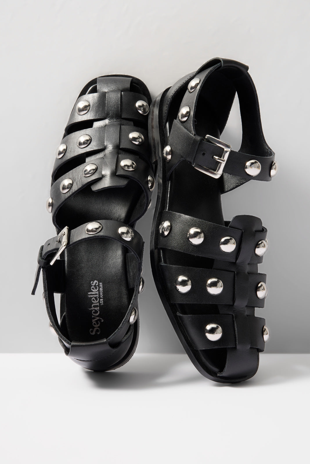 Silver studs add a stylish edge to these fisherman sandals by Seychelles. crafted in soft black leather with a strappy design and adjustable buckle closure.