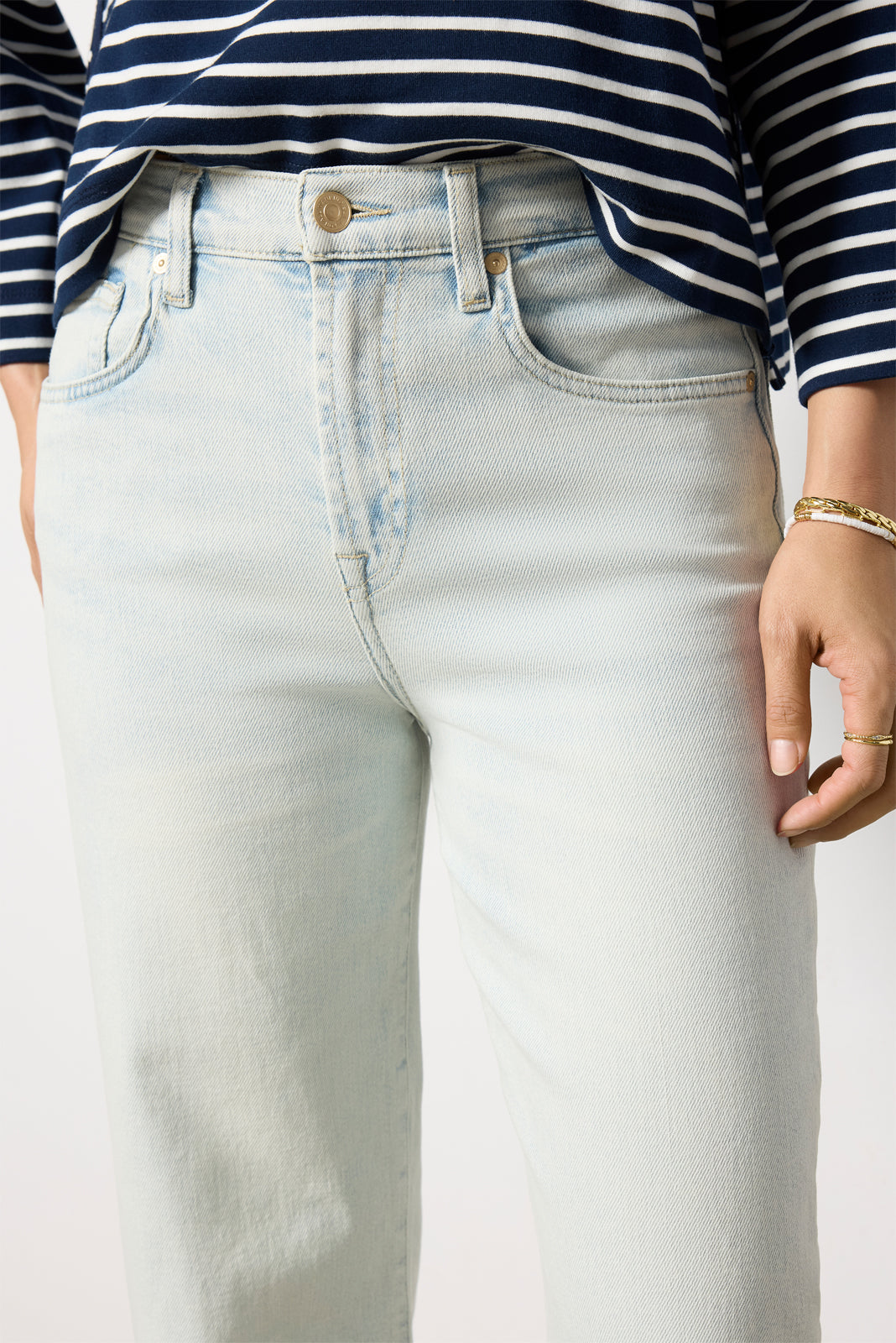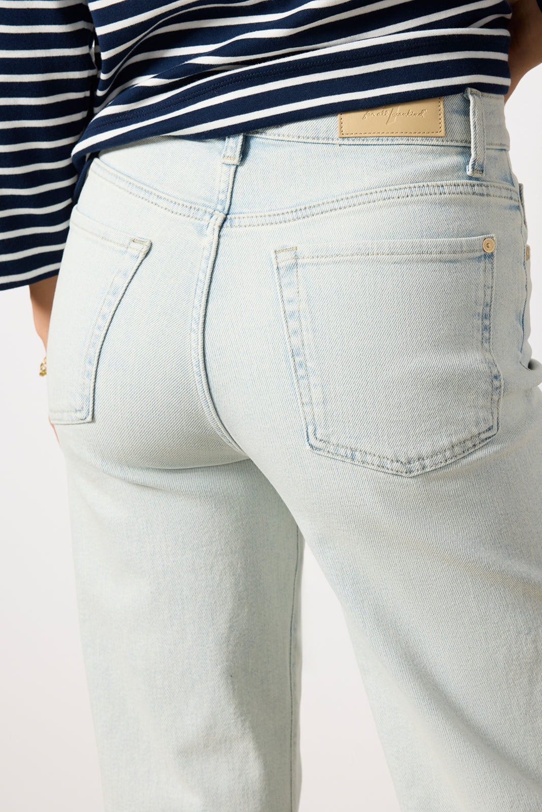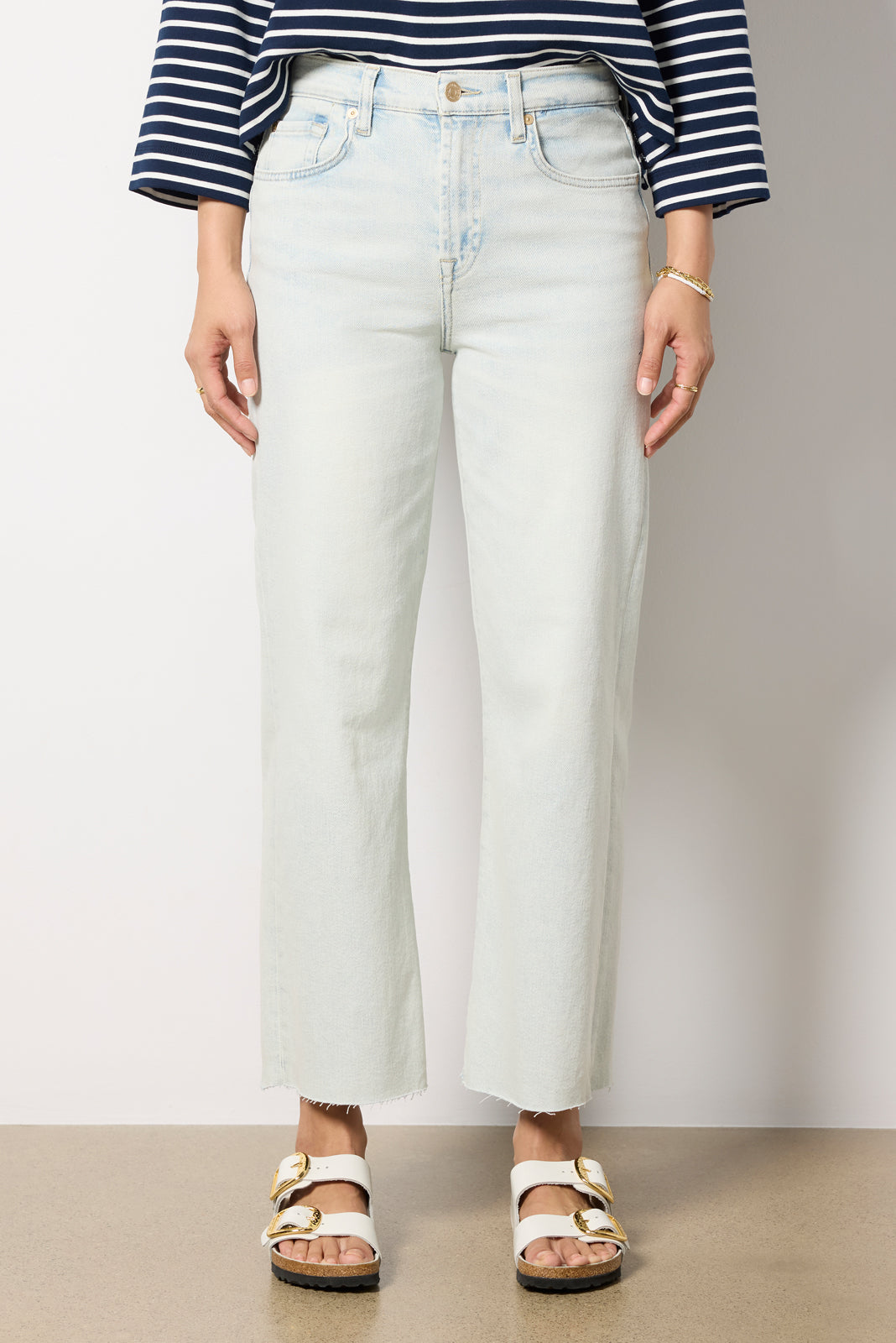A cropped length defines the chic silhouette of the Alexa wide leg jean by 7 For All Mankind. featuring a?light blue wash. raw hems. and soft stretch denim for day-to-night wear.