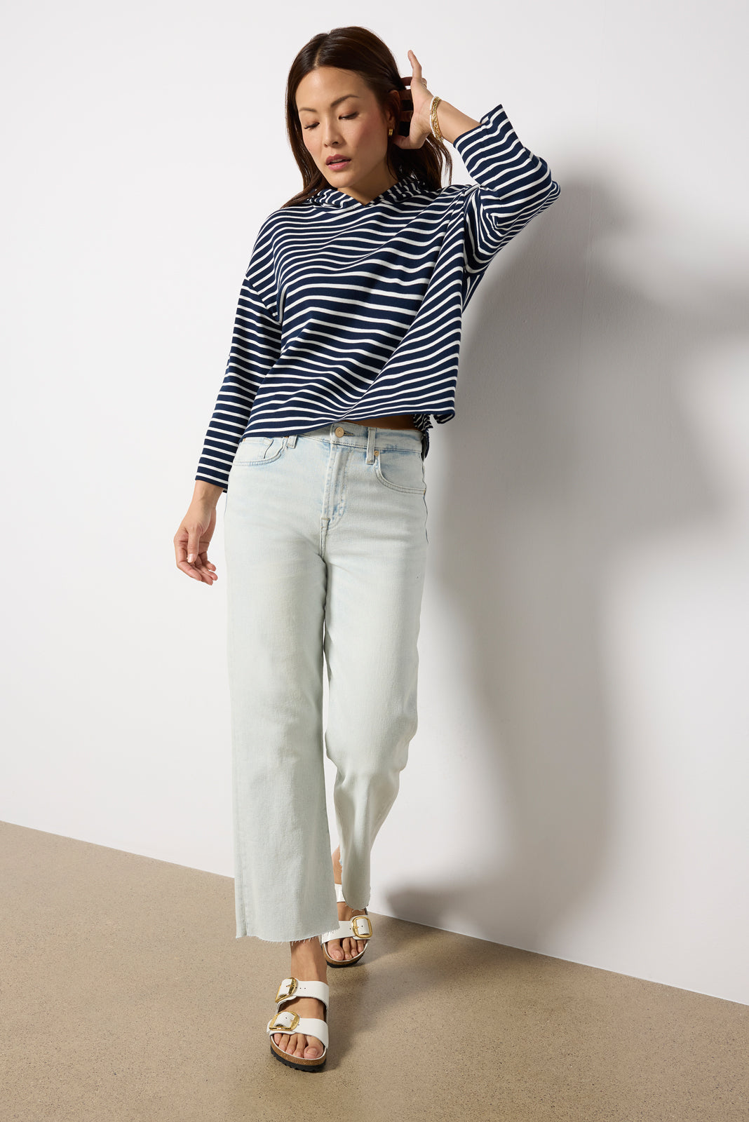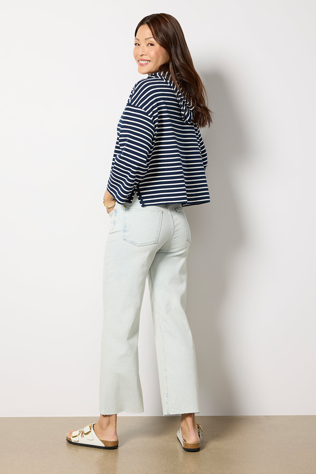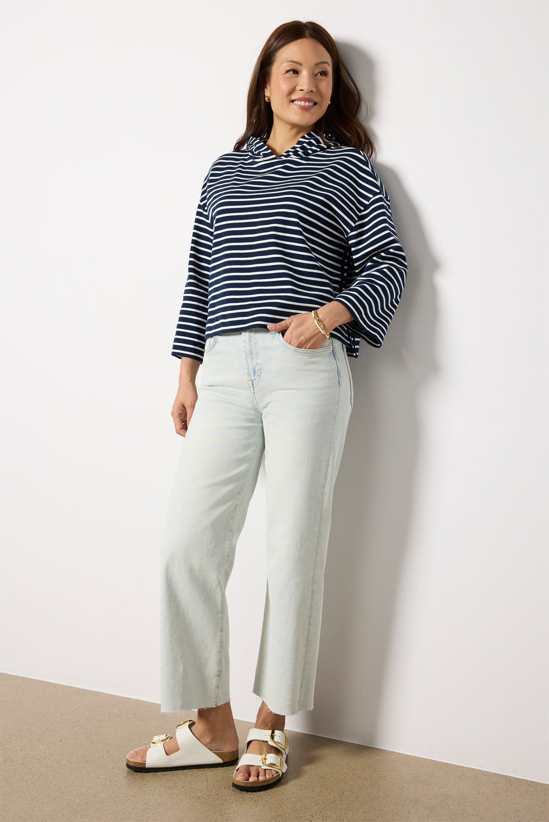 A cropped length defines the chic silhouette of the Alexa wide leg jean by 7 For All Mankind. featuring a?light blue wash. raw hems. and soft stretch denim for day-to-night wear.
