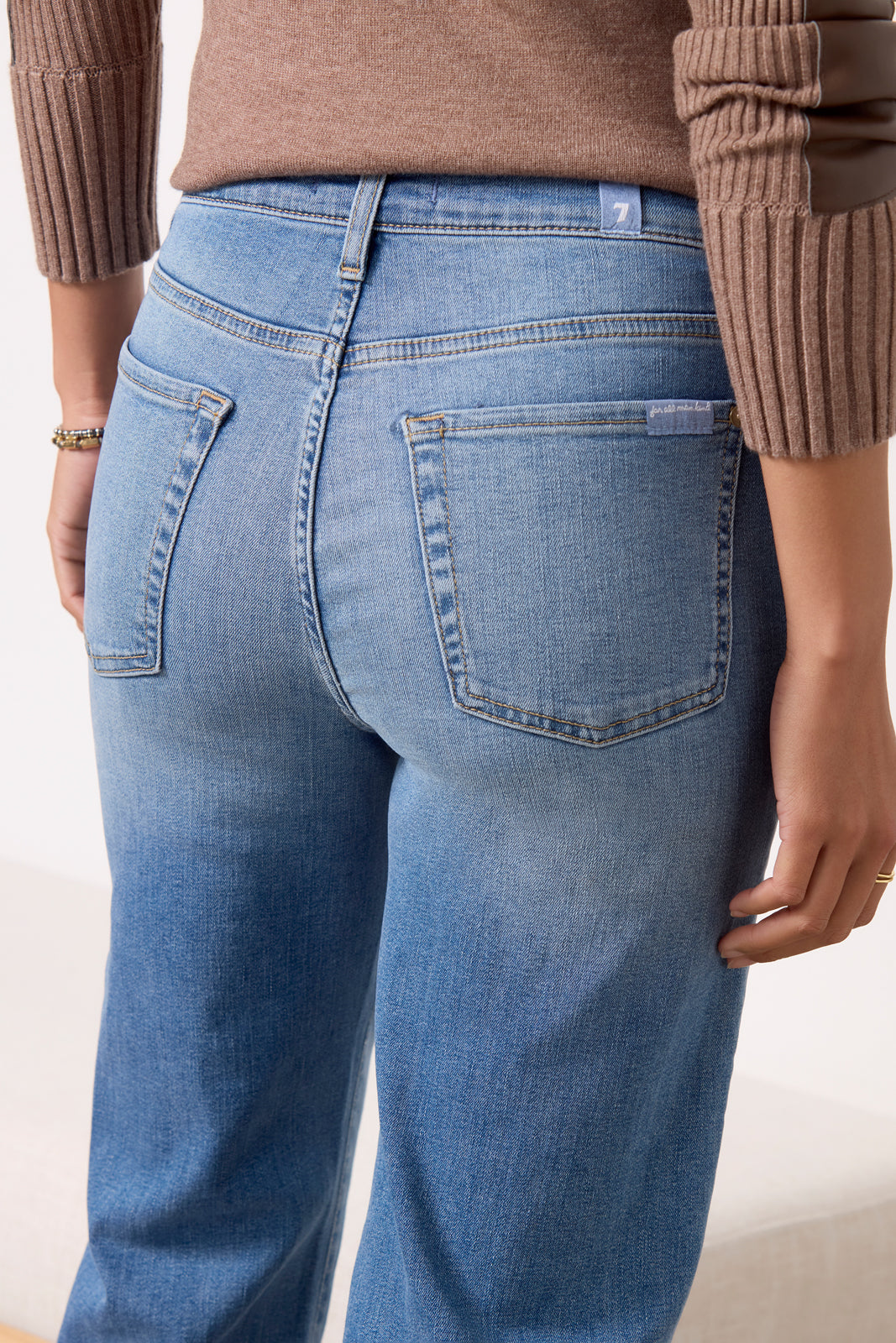 A cropped wide leg creates the chic silhouette of these 7 For All Mankind jeans. Perfect for day-to-night wear. the Alexa features raw ankle-length hems and soft stretch denim fabric in a faded blue wash.