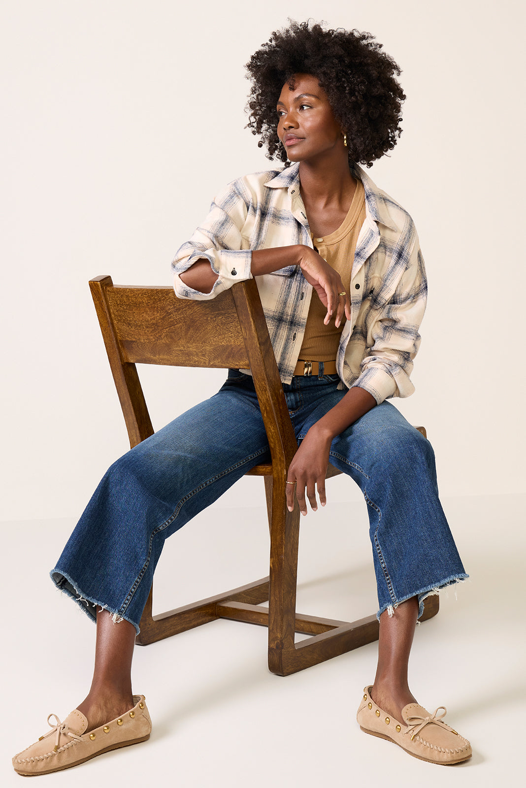 The perfect layer for fall. the Crosby Flannel by ASKK NY is crafted in a soft cotton blend and features a classic collar. front buttons. and a cropped. boxy fit.?