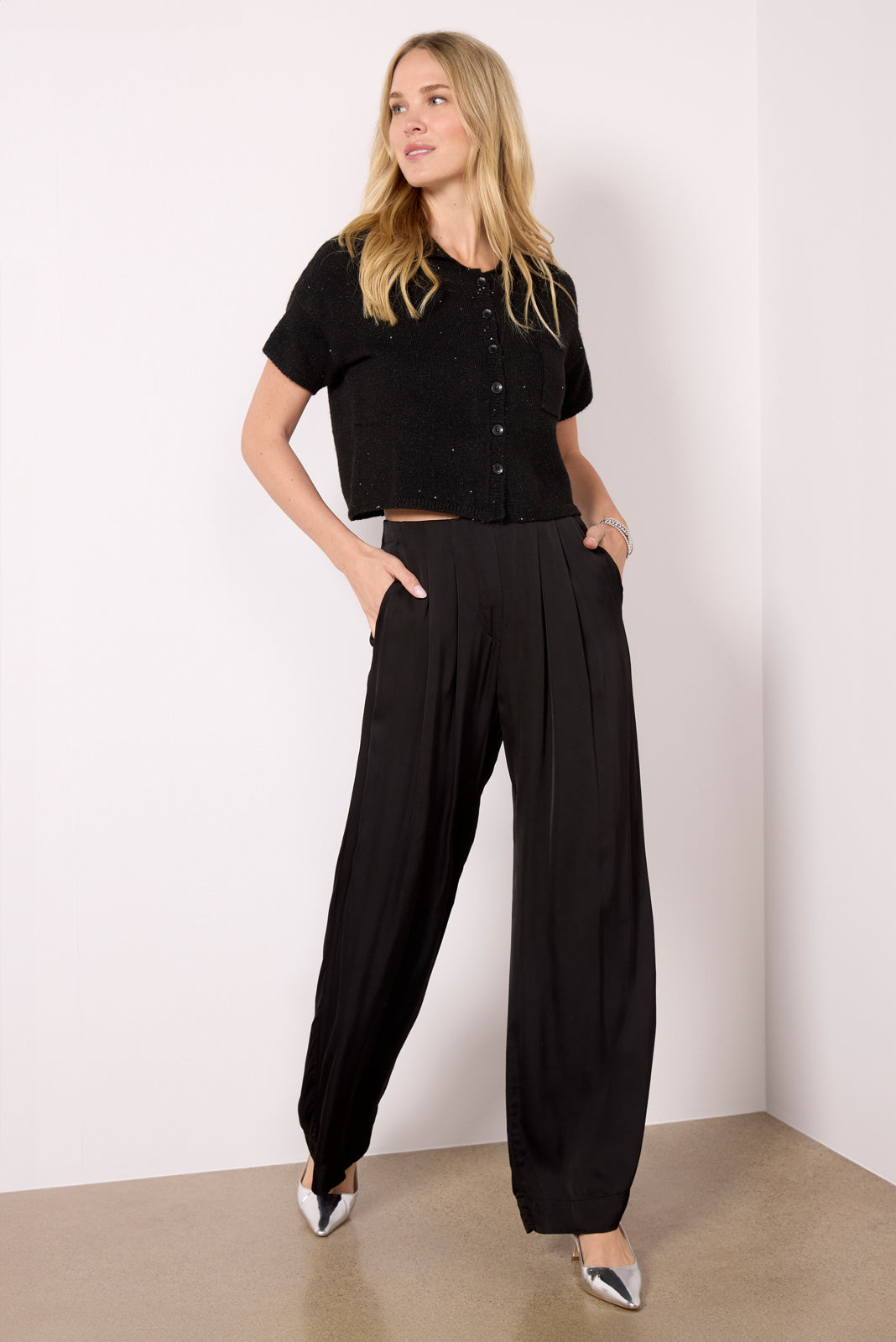 Shimmering sequins add the perfect hint of sparkle to this button-front sweater by LNA. featuring a cropped silhouette with a collared neckline. left chest pocket. and ribbed trim.