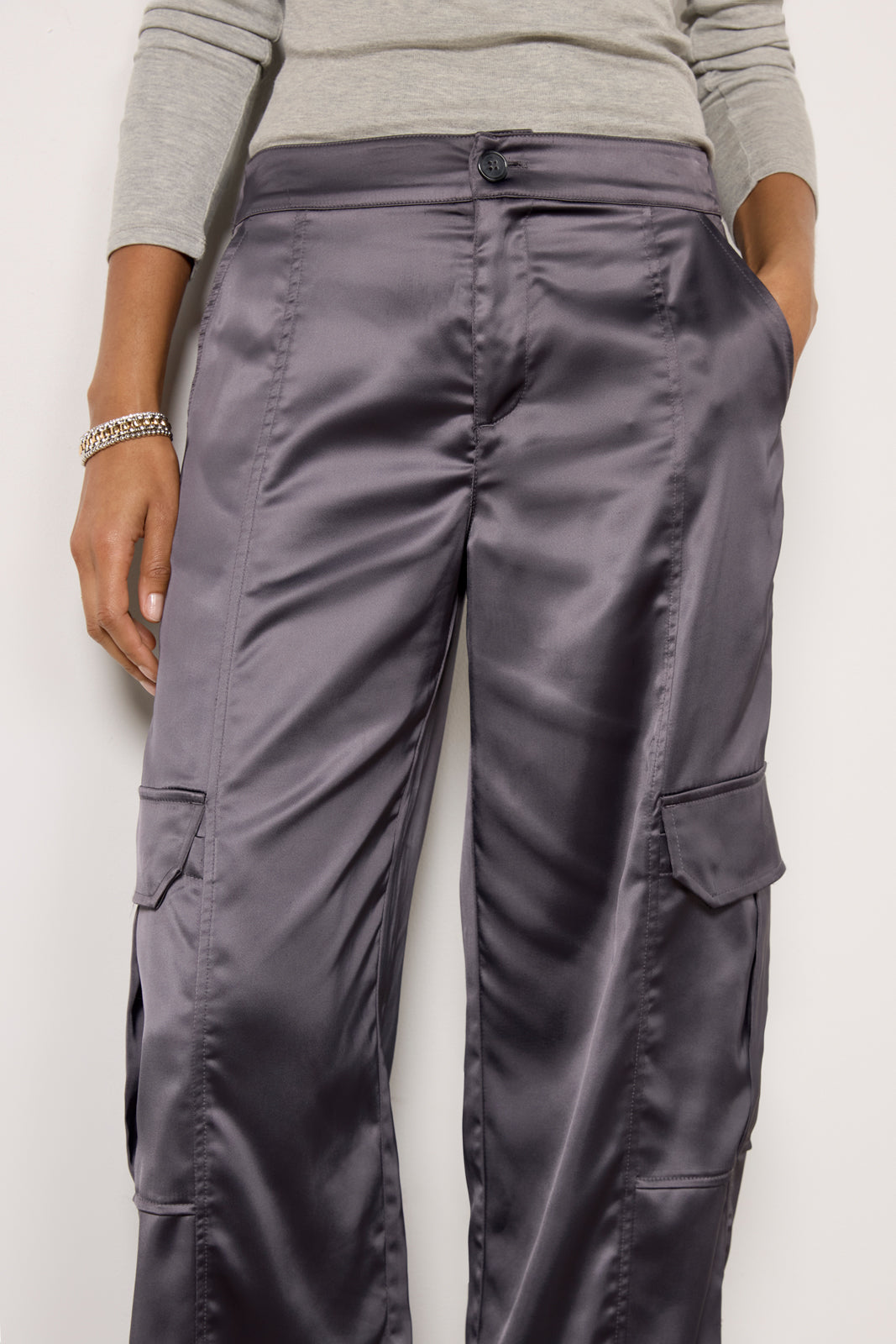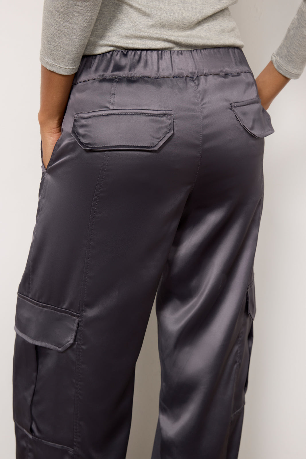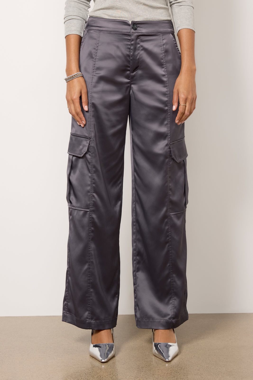 Elevate your next night-out look with these satin cargo pants by Sanctuary. Topped with utility-style pockets. these wide leg pants feature a flattering high-rise. back elastic waist. and full-length hems.
