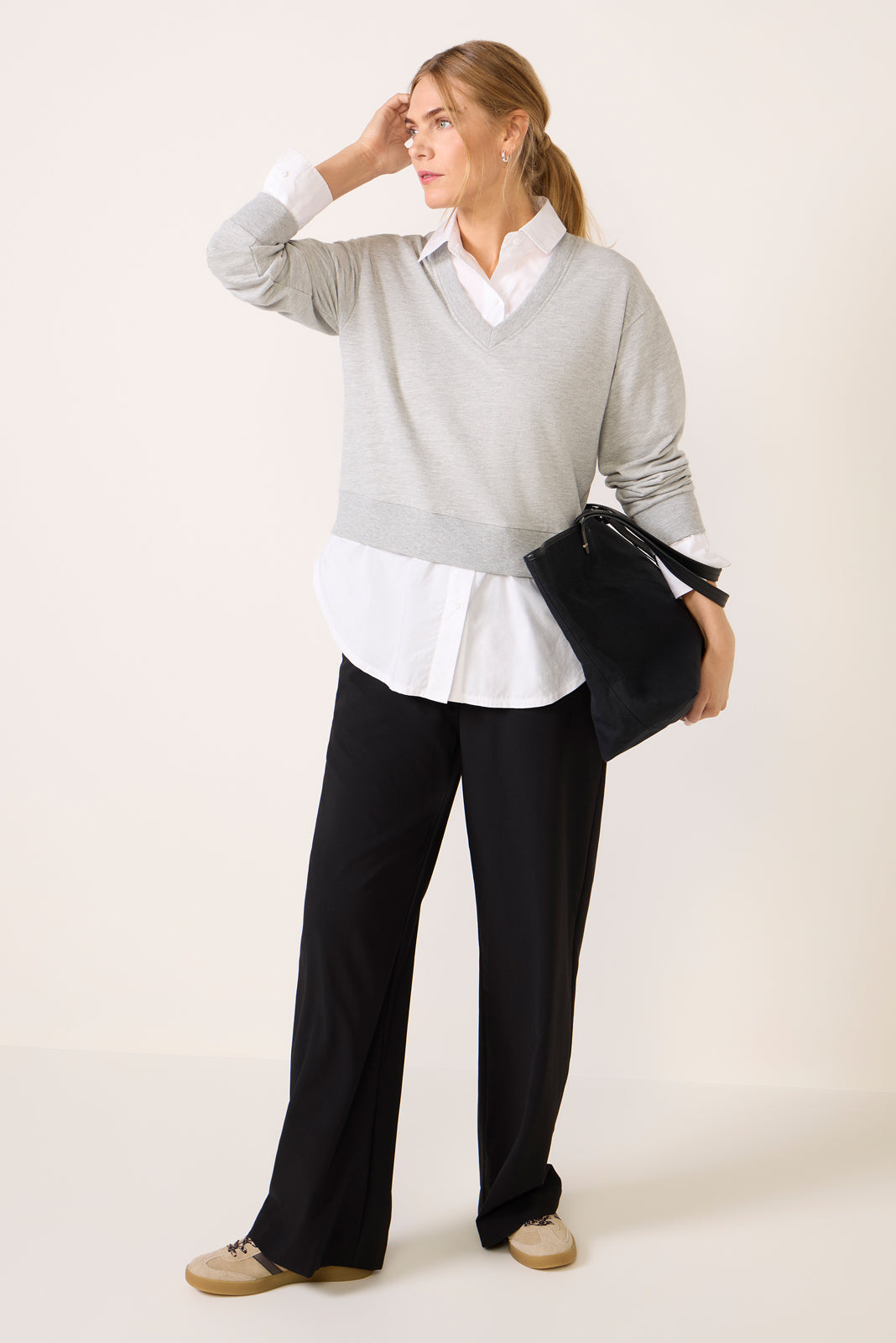 The Ellie Twofer Sweatshirt by?Z Supply makes layering easy. featuring a cotton poplin button down and a soft knit sweater vest with a v-neckline. long sleeves. and a relaxed fit.?