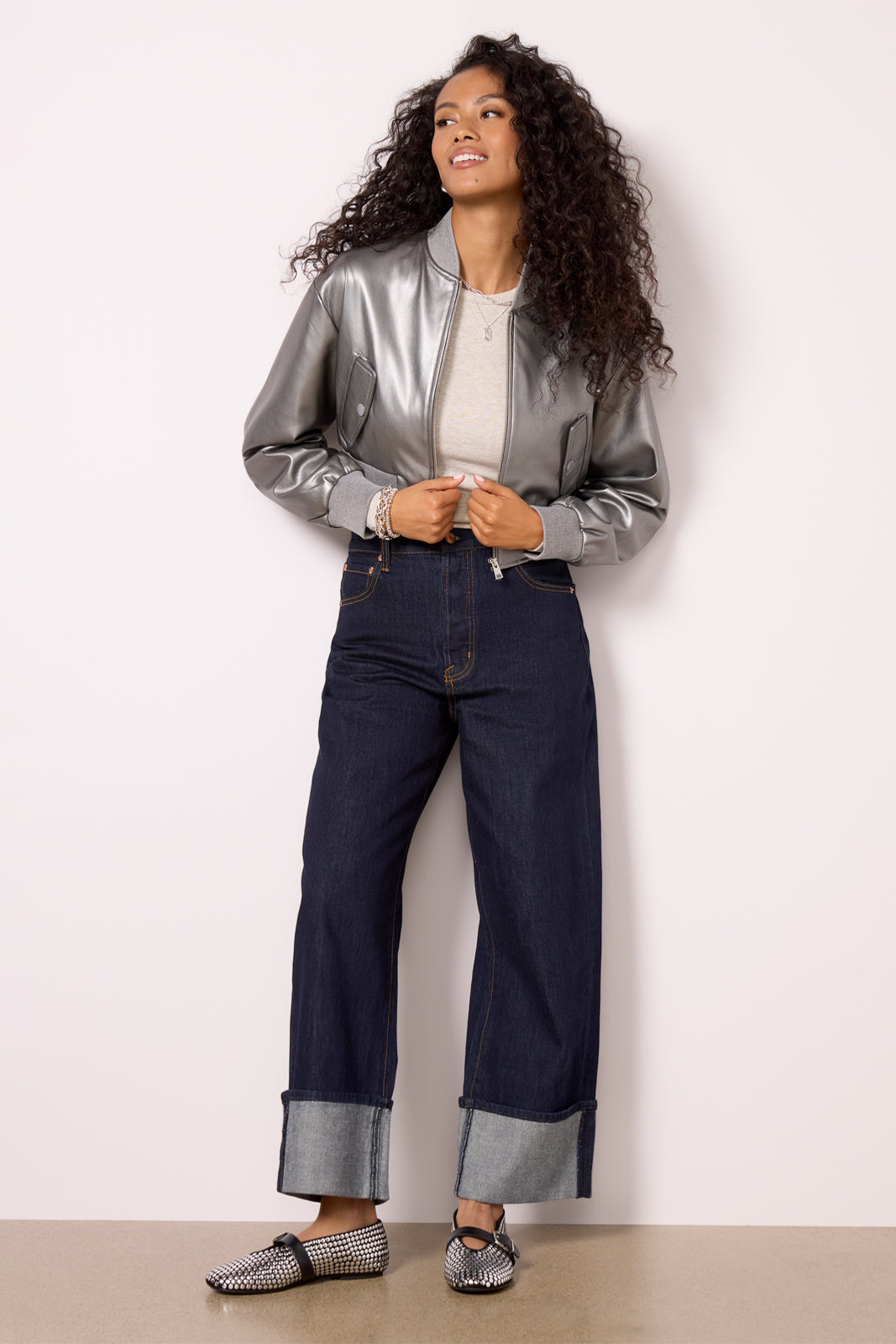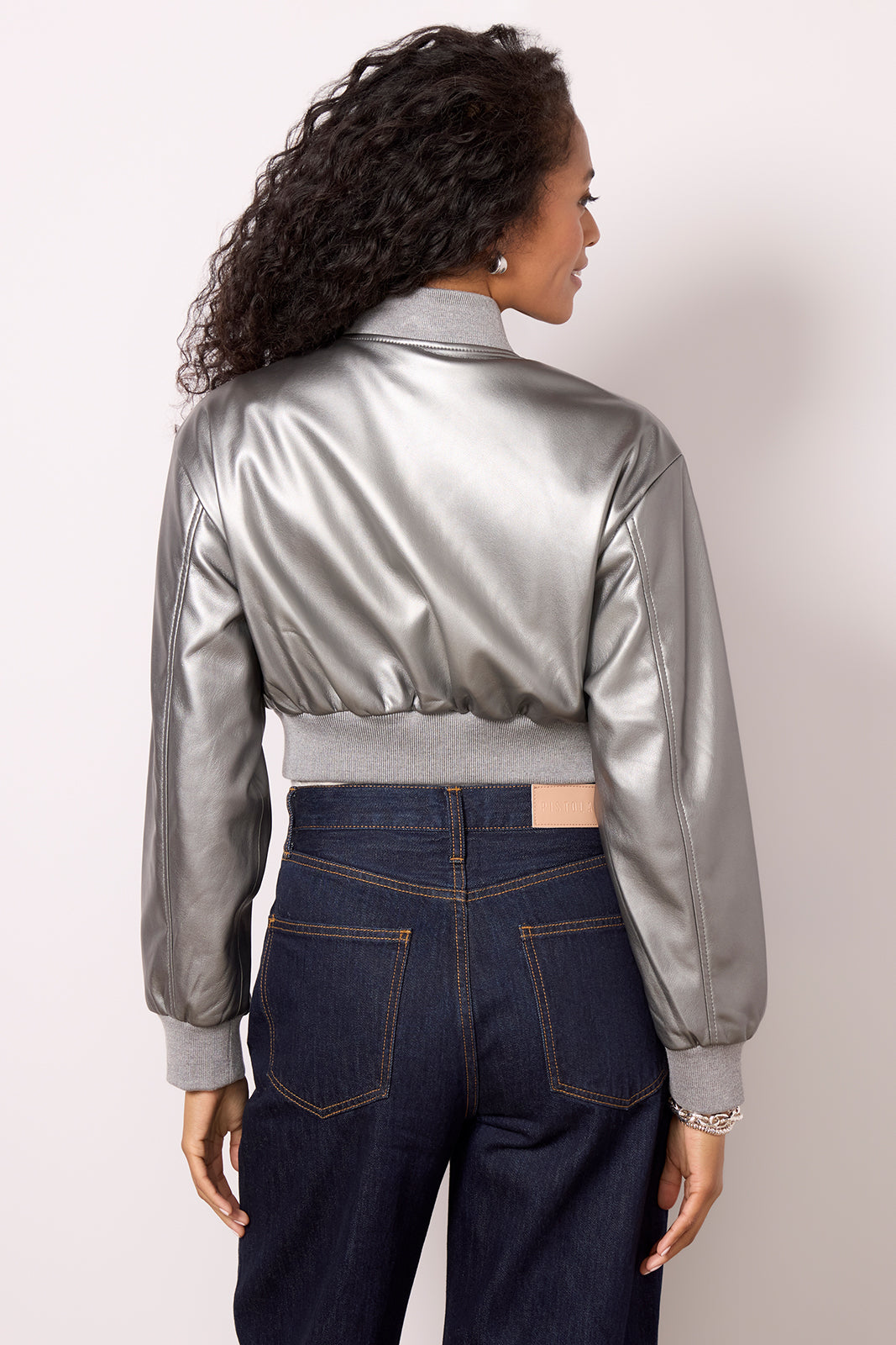 Add next-level style to your layering collection with the Evelin jacket by Lamarque. Finished in metallic faux leather. this chic bomber jacket features a cropped silhouette. snap pockets. and rib knit trim at the collar. cuffs. and hem.
