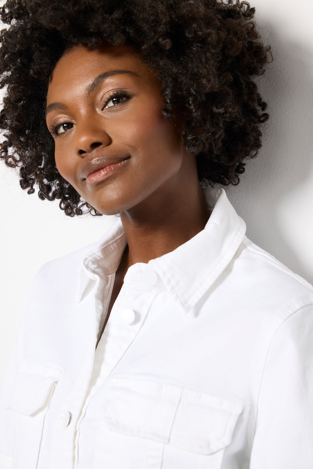 This short sleeve jacket by KUT From The Kloth is the perfect transitional layer. featuring a cropped button-front silhouette. chest pockets. and?soft twill?fabric.