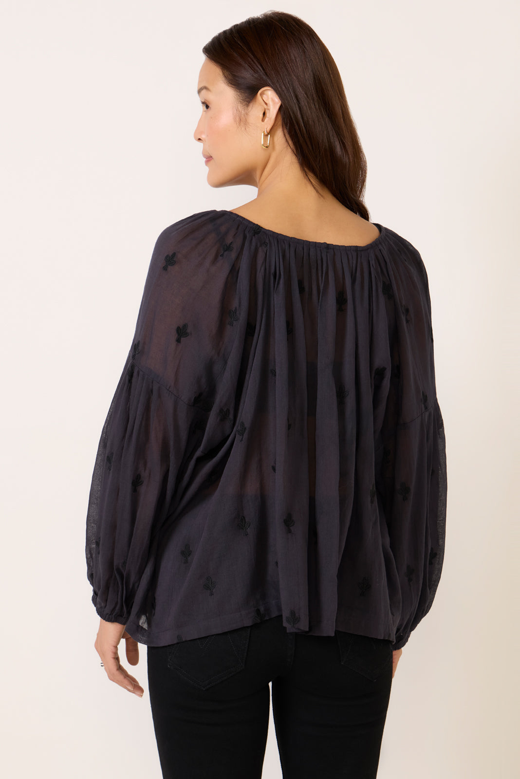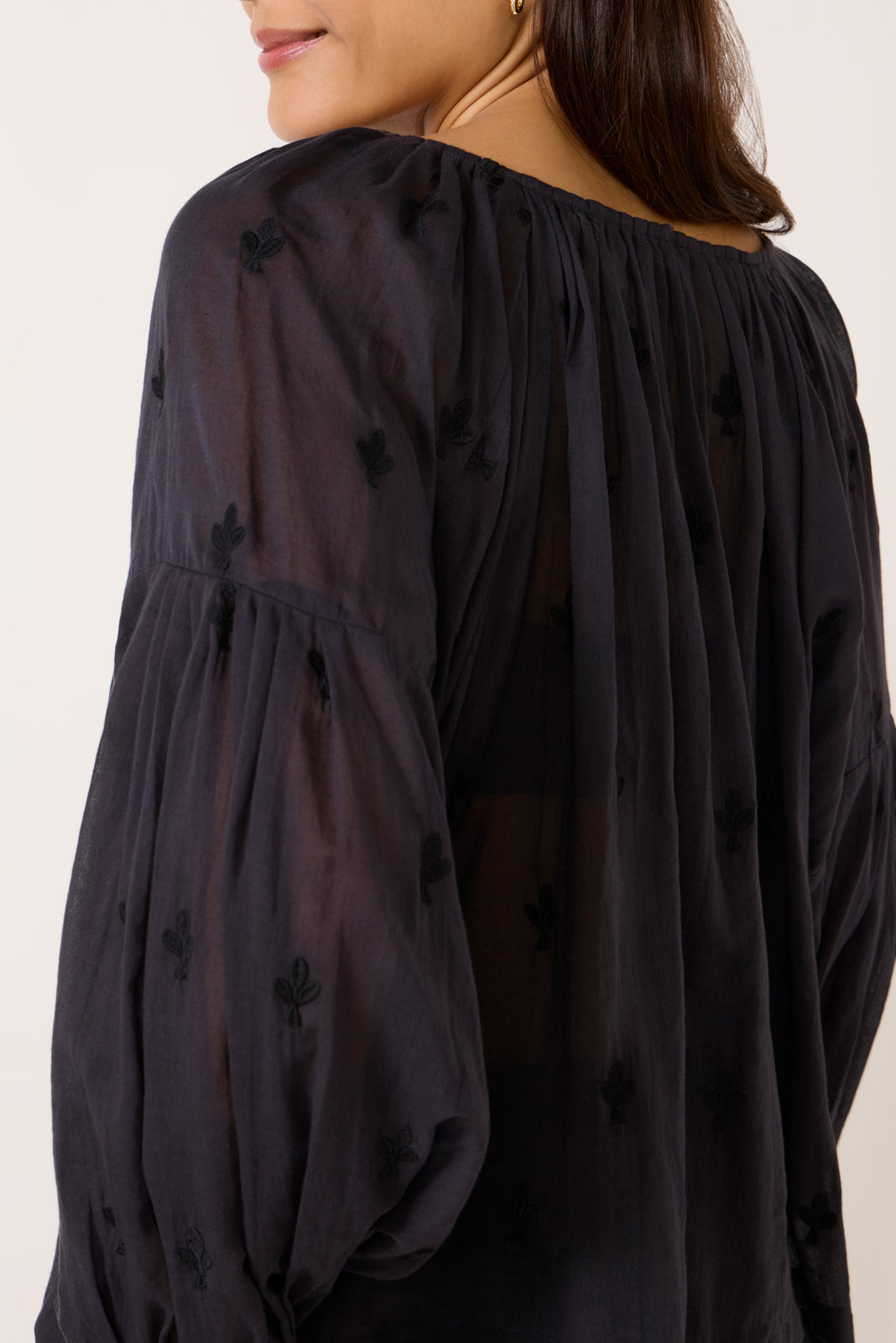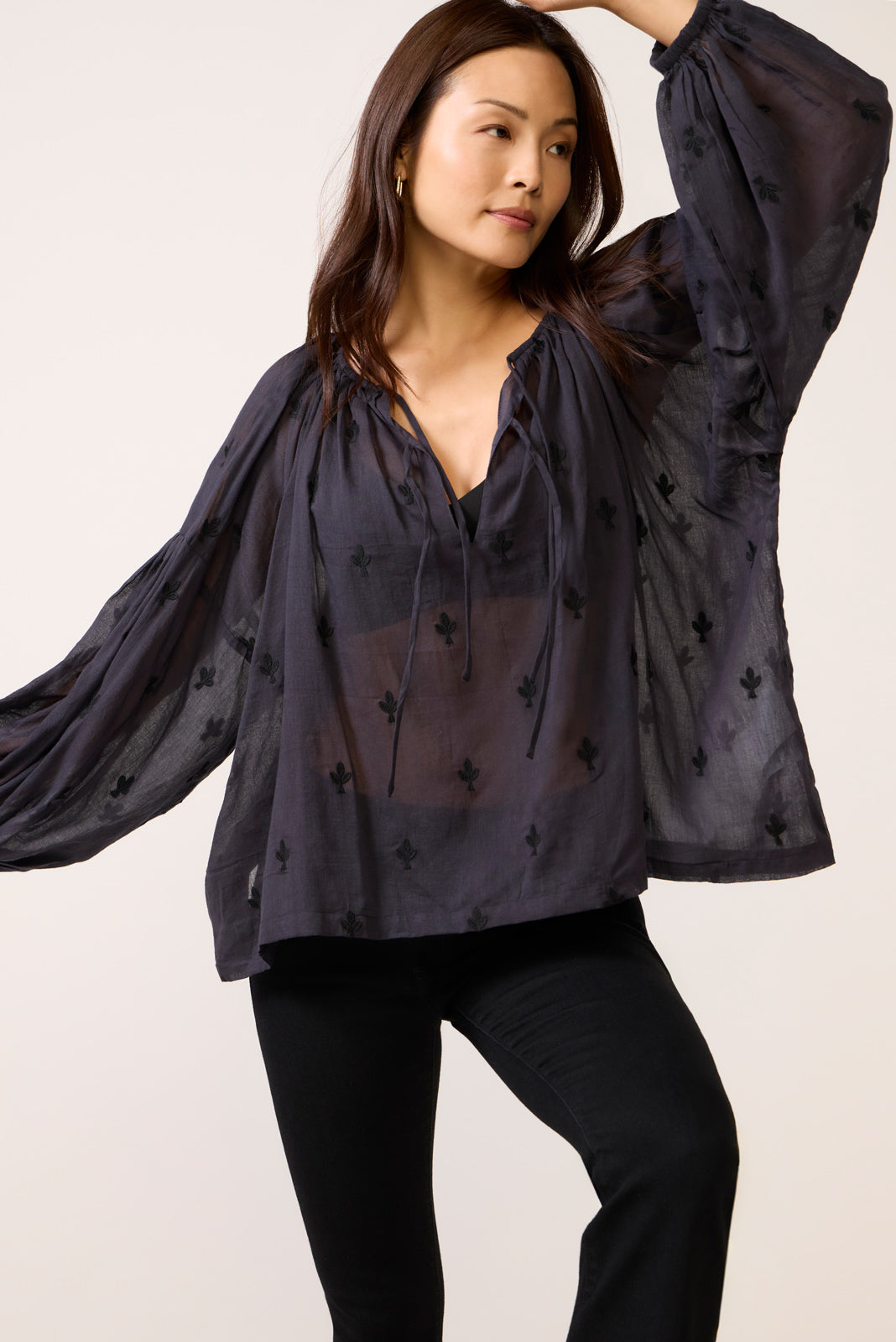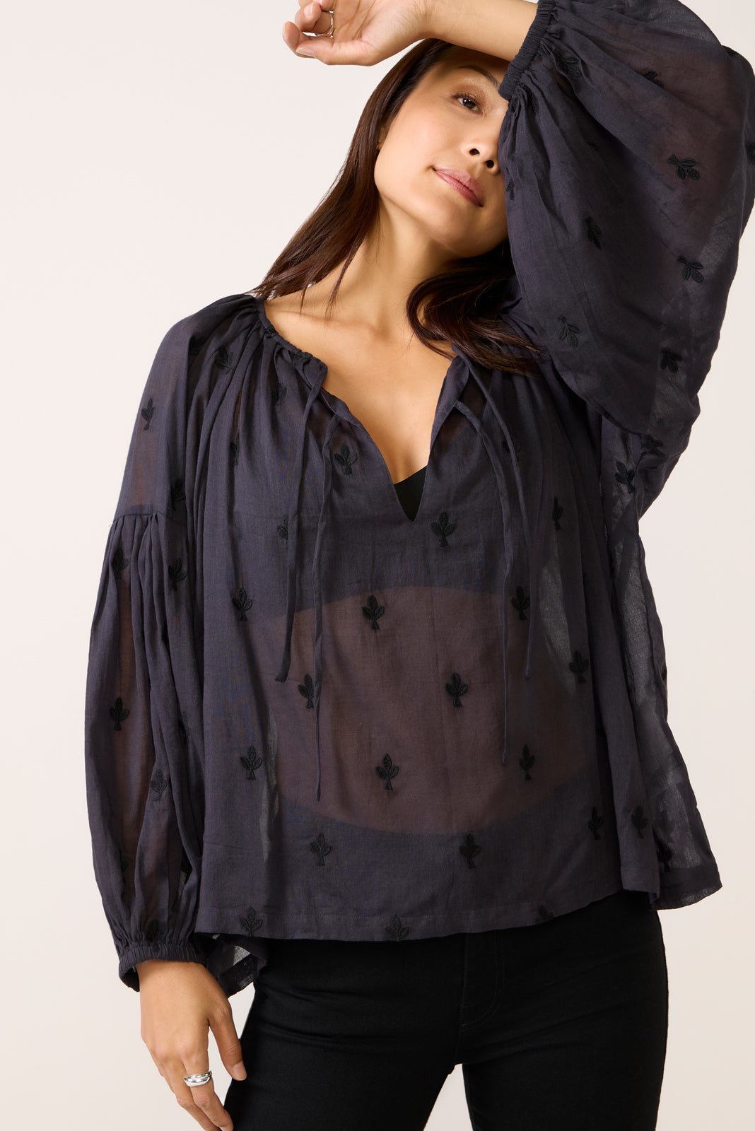 Add a touch of boho to your?blouse collection with the Folk Top by Emerson Fry. featuring embroidered cotton. split neckline with ties. dropped shoulders. and a relaxed fit.?
