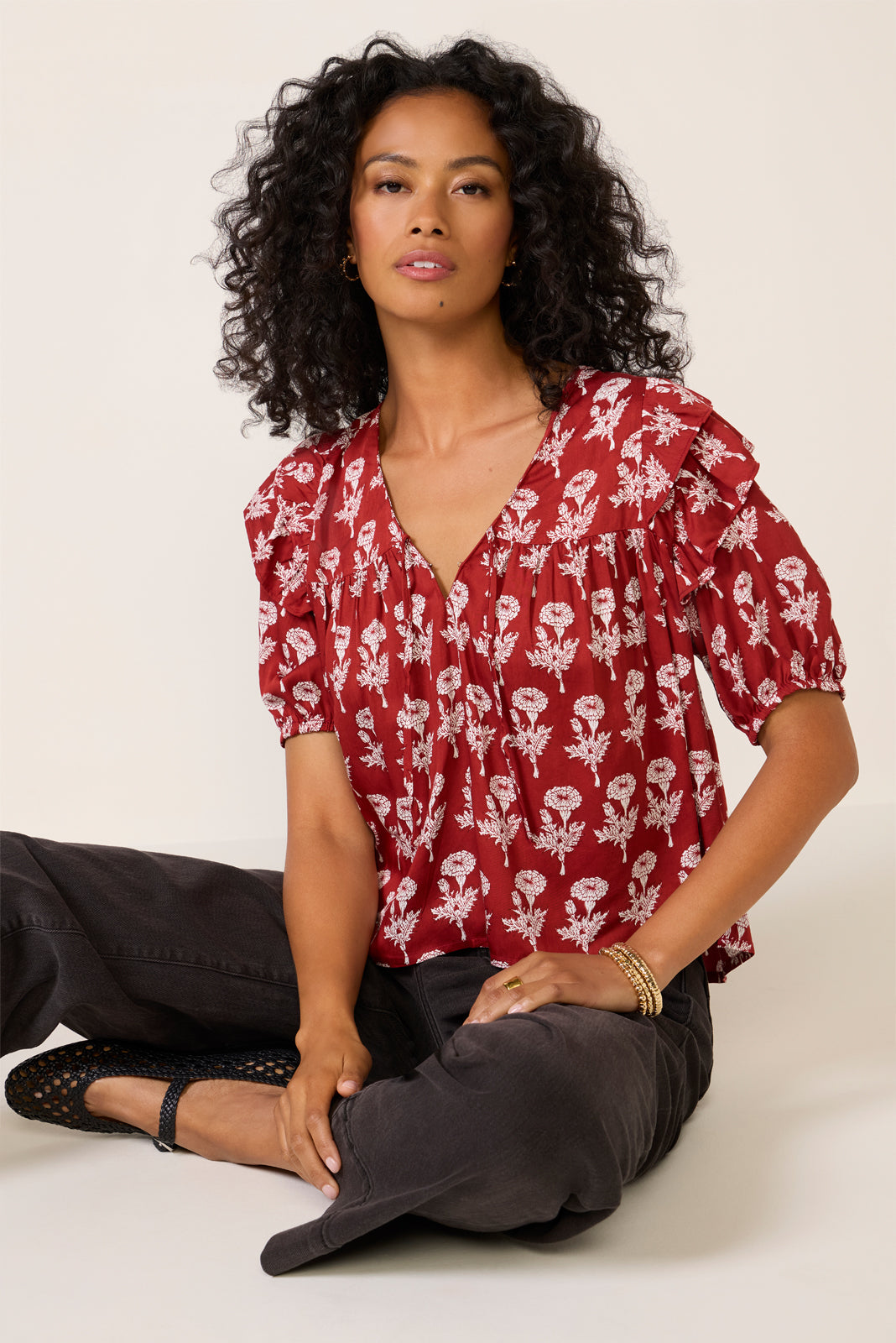 Ruffled puff sleeves elevate this fun and flowy top by Emerson Fry. featuring a relaxed fit. seamed yoke. and v-neckline with a tie detail and hook-and-eye closure.?