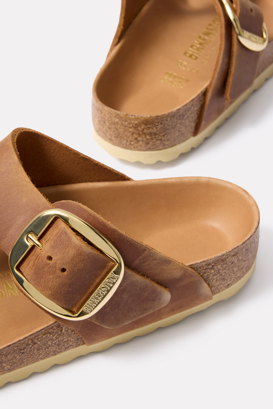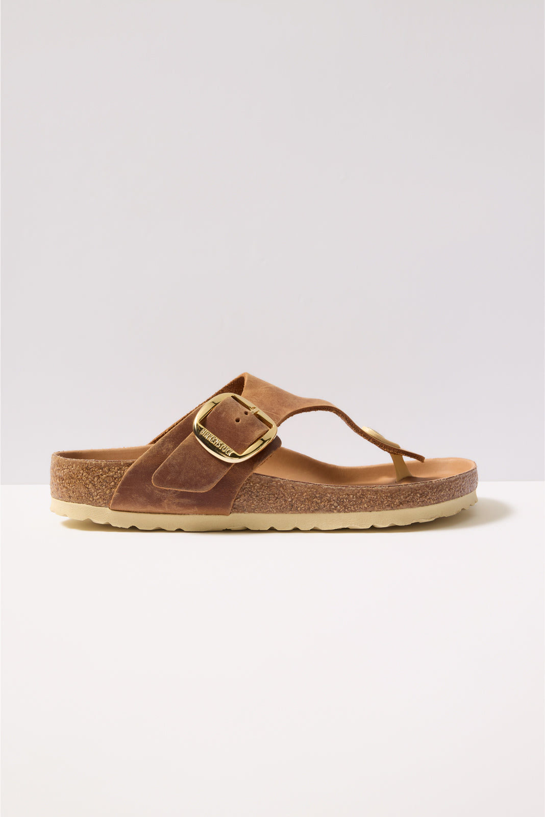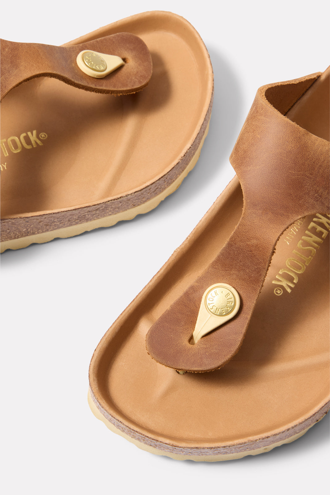 Bold gold-tone buckles elevate the classic Gizeh sandal by Birkenstock. featuring a thong-style leather strap and comfortable cork footbed.