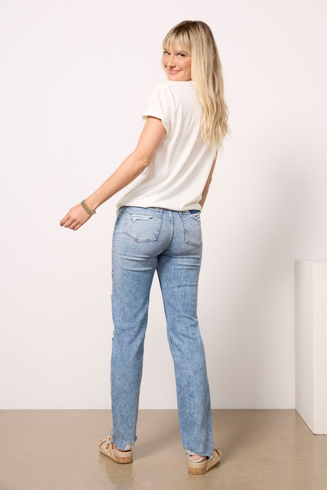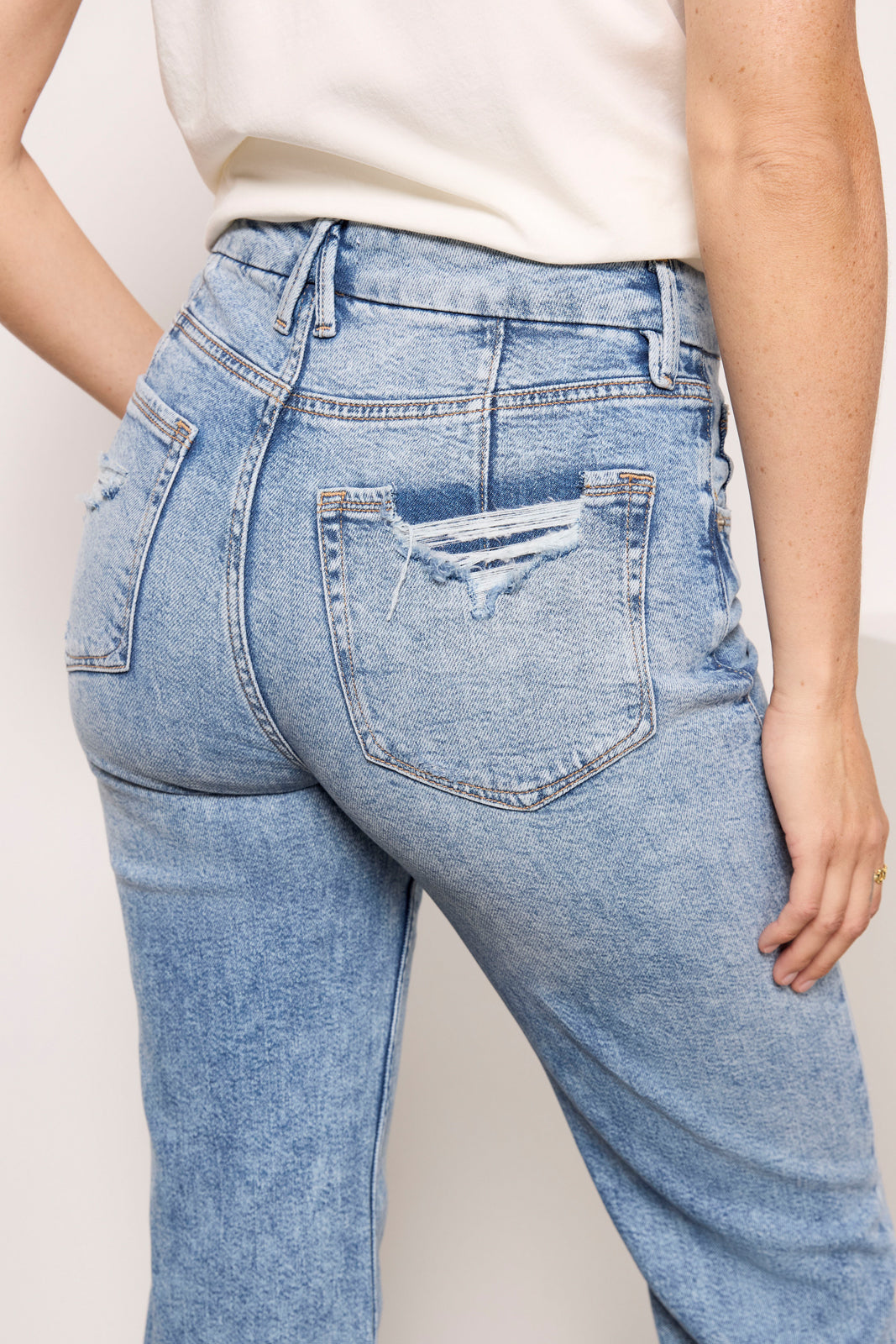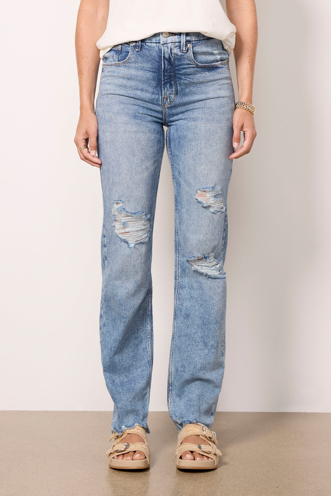 A vintage-inspired straight leg defines the Good Icon jean by Good American. Finished with distressed details and raw hems. these high-rise jeans are designed with a gap-proof waistband for an always-flattering fit.