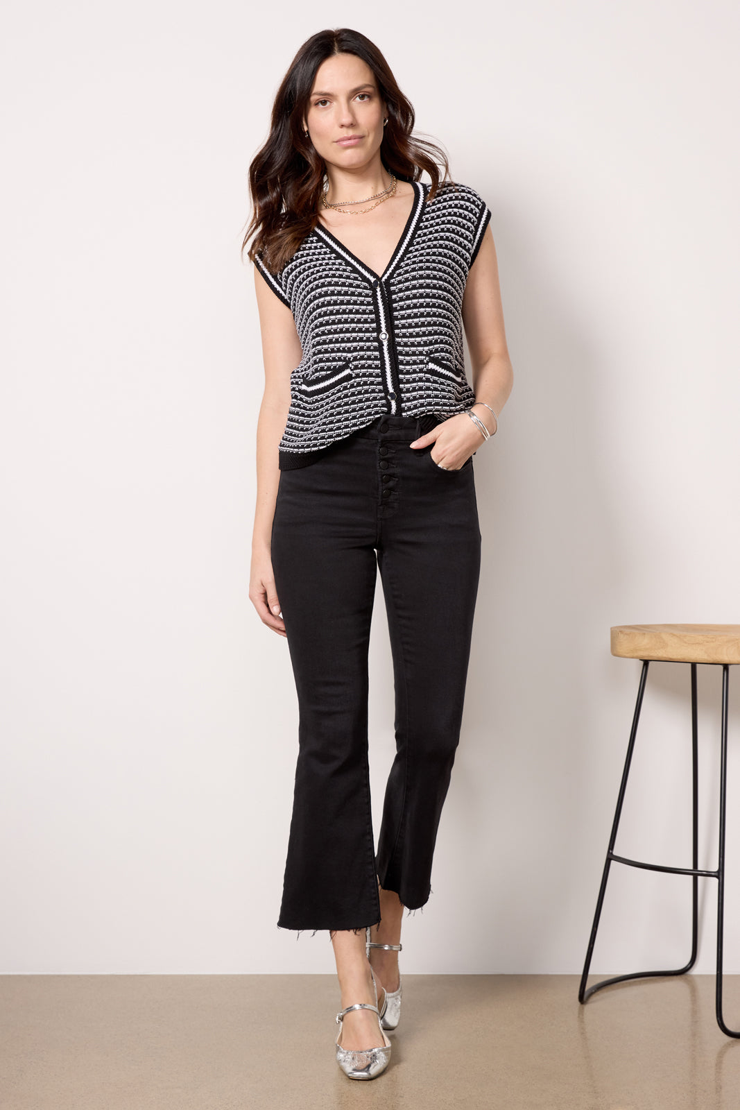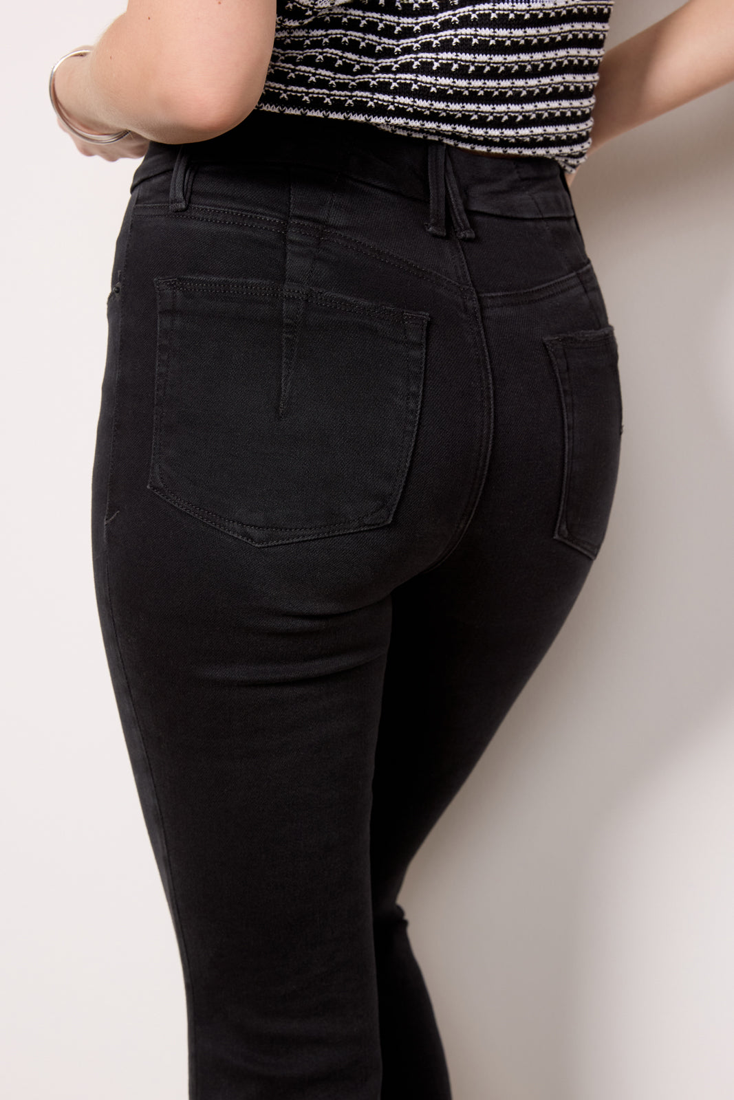 Darted back pockets and an exposed button fly add interest to these flattering bootcut jeans by Good American. Finished with ankle-length raw hems. these versatile jeans are perfect for day-to-night wear thanks to the black wash and soft. sculpting denim fabric.