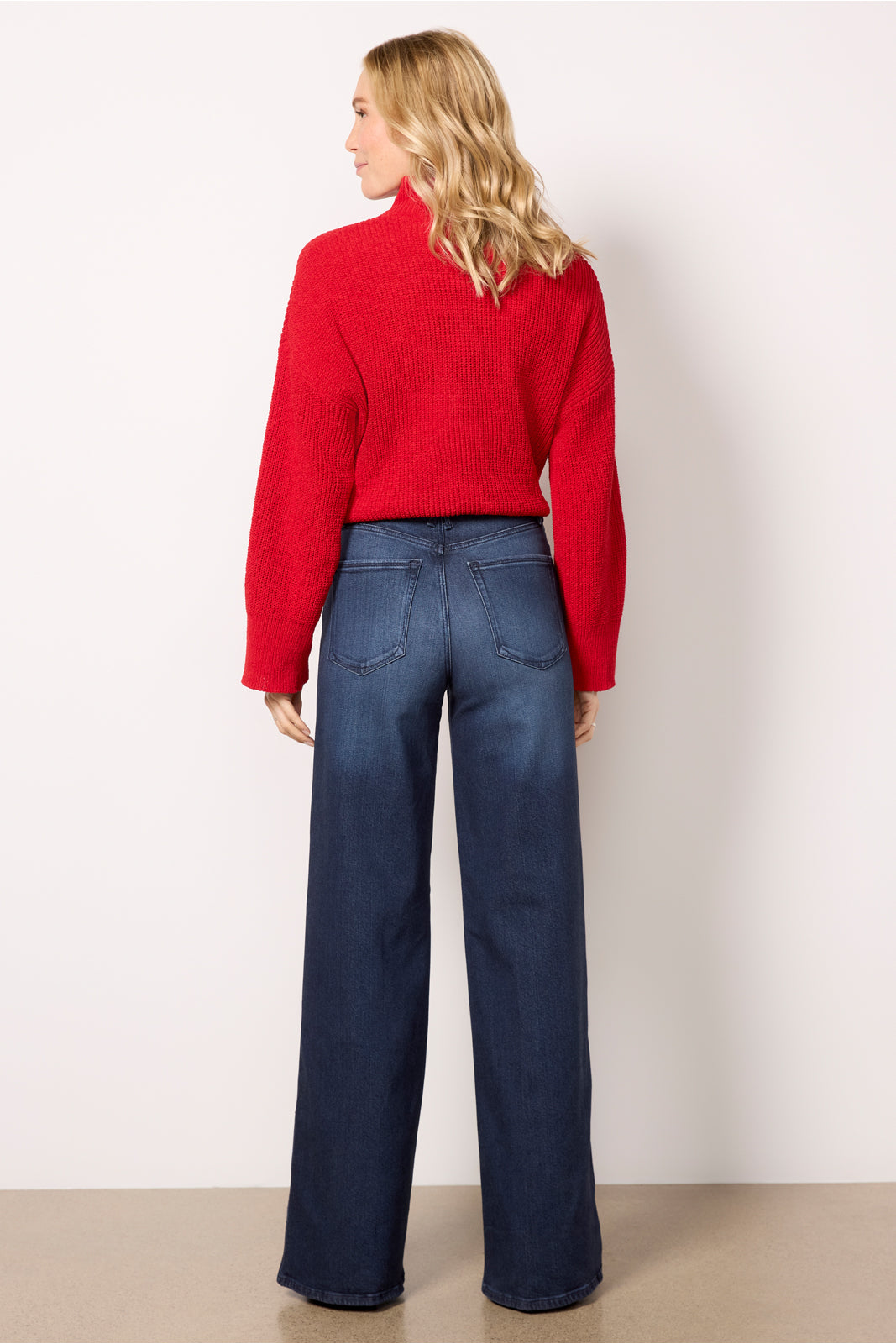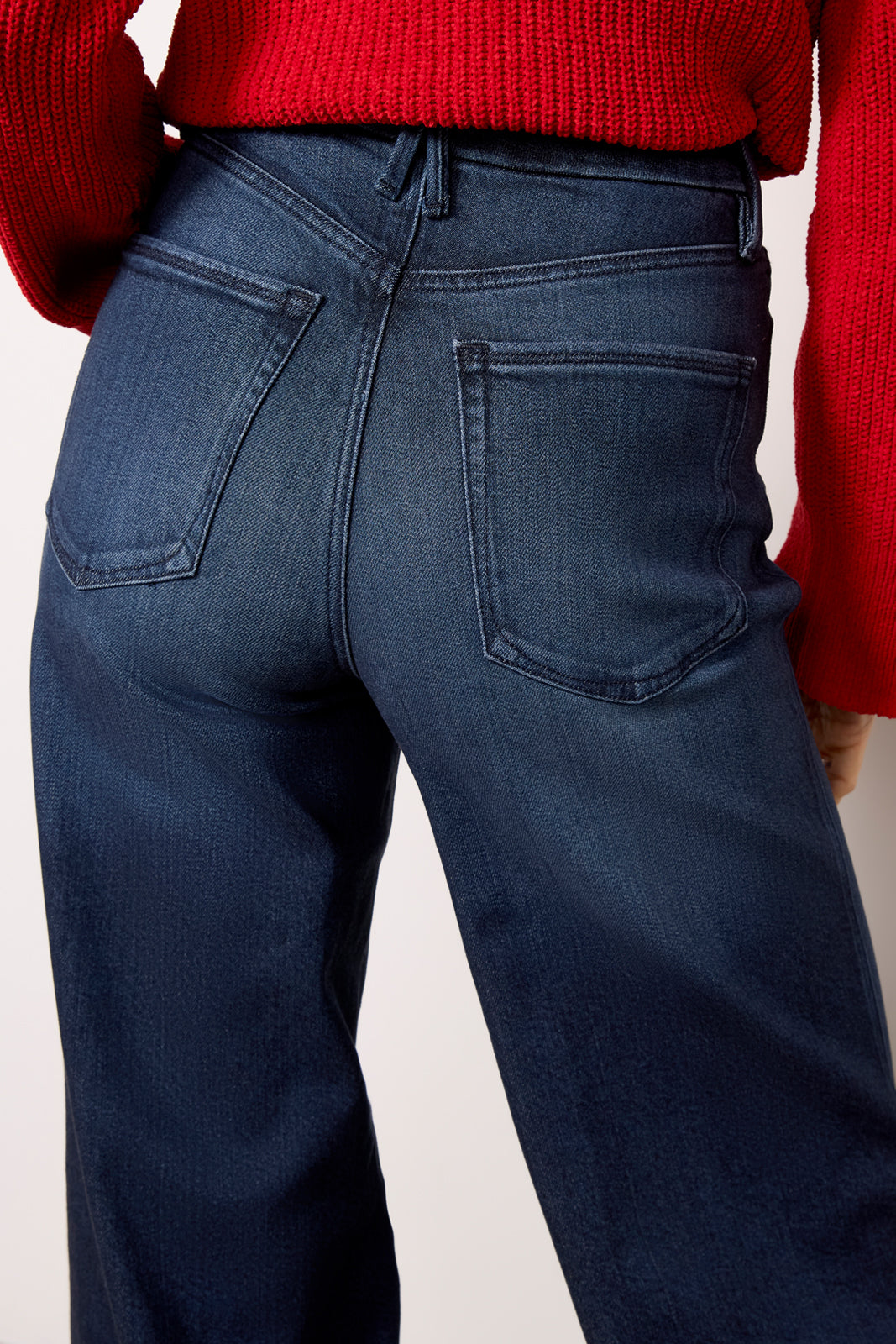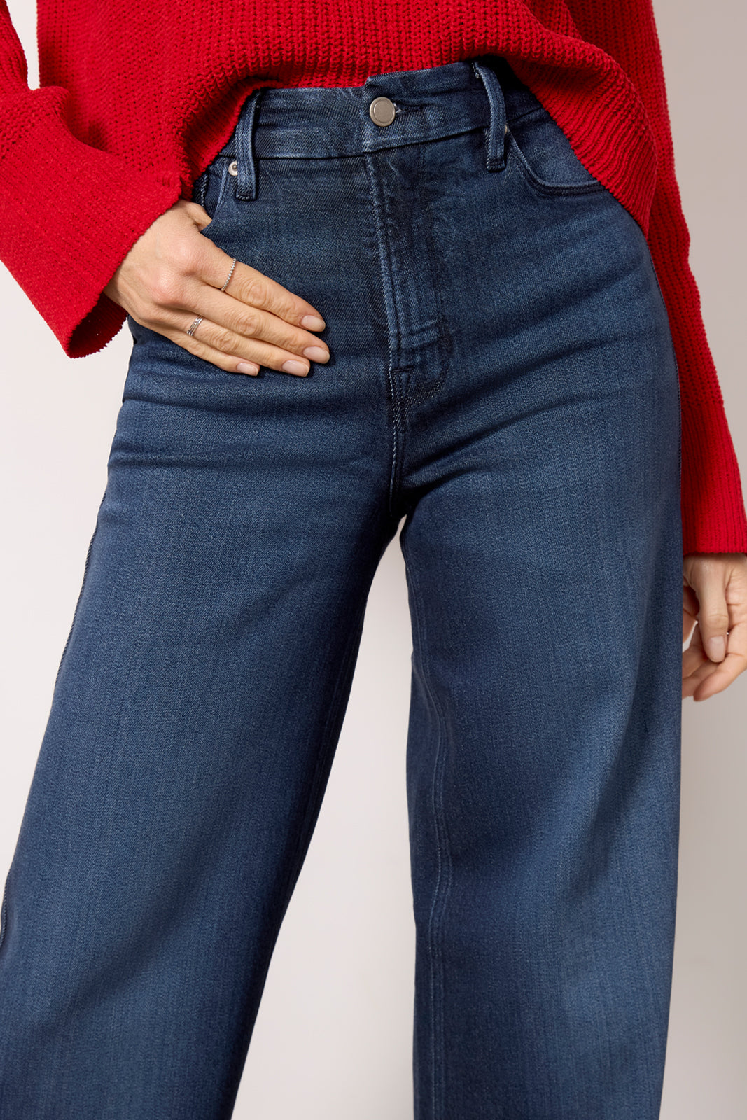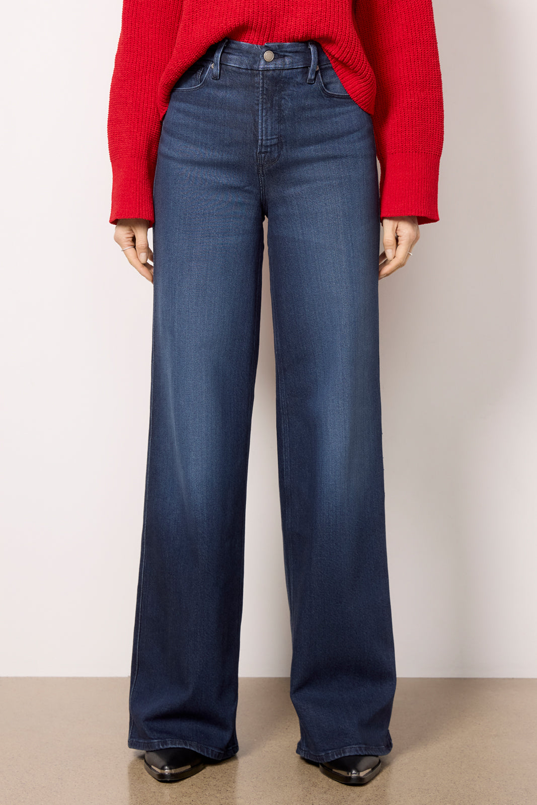 The Good Skate jeans from Good American feature a relaxed wide-leg silhouette. high-rise waist. and dark blue wash that will take you from work to weekend.