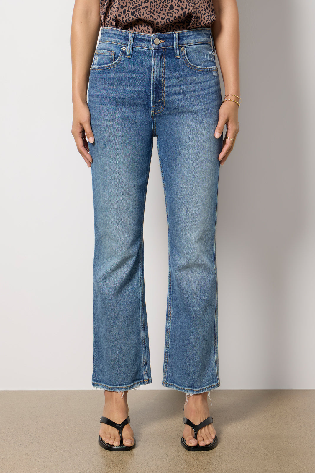 Crafted in stretch cotton denim. the Good Standard Kick Flare by Good American features a mid-rise waist. ankle-length hems. and a classic light blue wash.