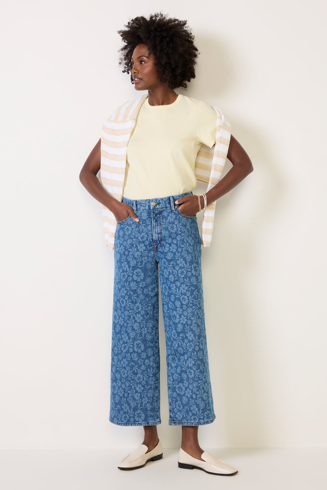 A?tonal floral design updates these fun and flattering wide leg jeans by Good American. Cropped at the ankle. the Good Waist Palazzo jean features a gap-proof waistband. clean hems. and soft stretch denim that moves with you from day to night.