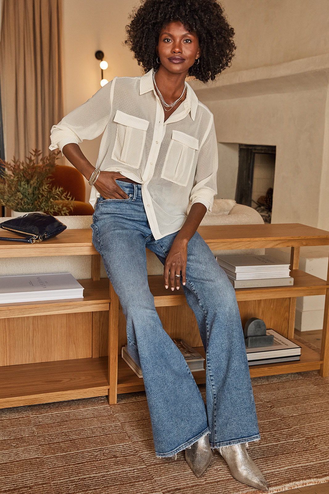 A voluminous wide leg defines these fun and flattering jeans by Good American. The Good Waist Palazzo is crafted in soft denim and features a gap-proof waistband. distressed hems. and a versatile?blue wash that’s perfect for dressing up or down.