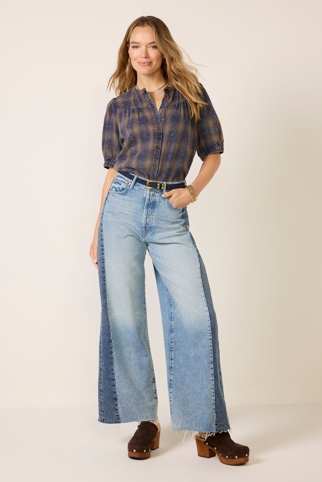 A nod to Western. the Gracie Blouse by EVEREVE features a crew neckline. short puff sleeves. front button closures. and yoke details throughout.?