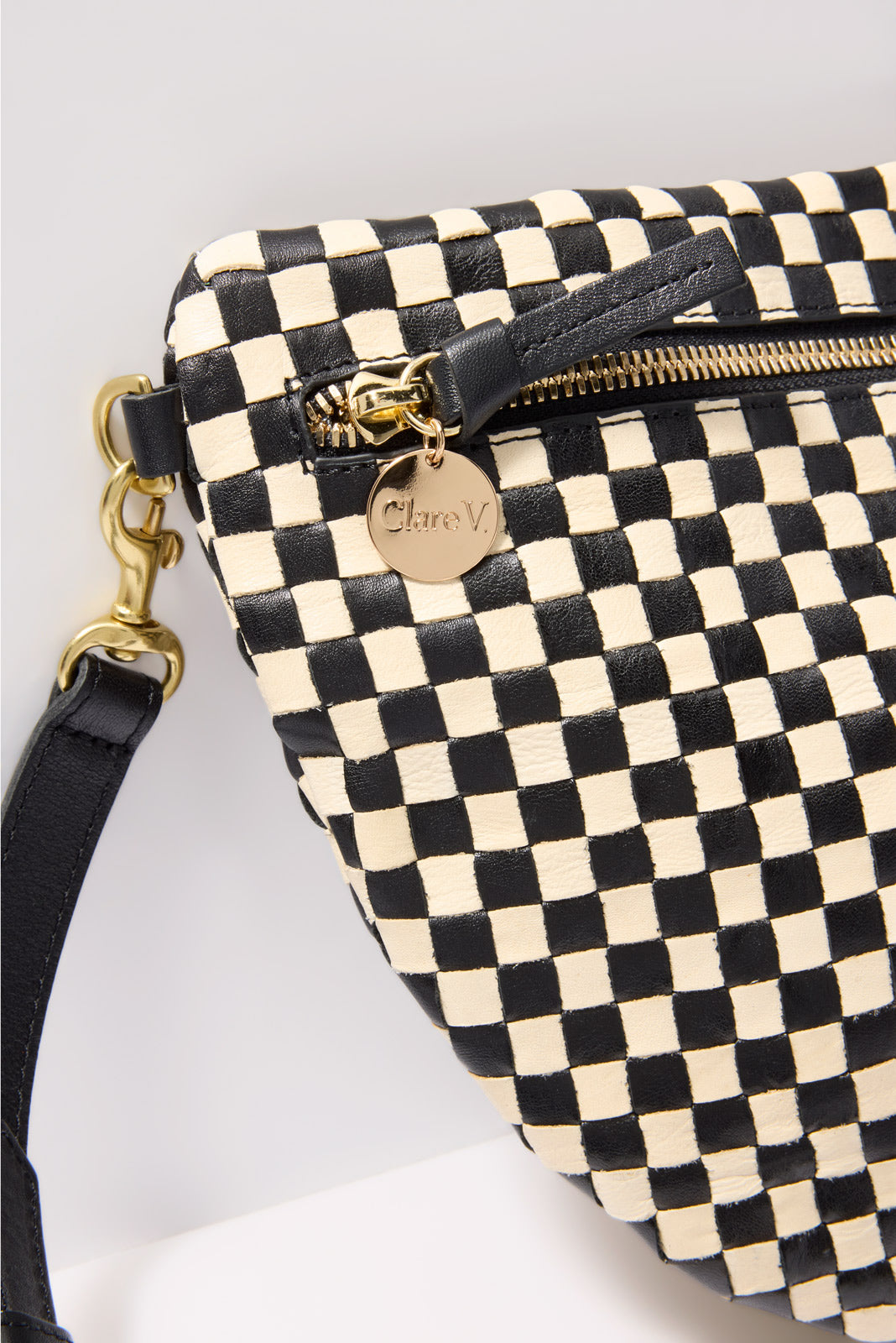 Chic and versatile. this Clare V. bag is the perfect on-the-go essential. The Grande Fanny is crafted in woven Italian leather with a cotton-lined interior and zipper closure. The detachable. adjustable strap can be worn at the waist. across the body. or on the shoulder.