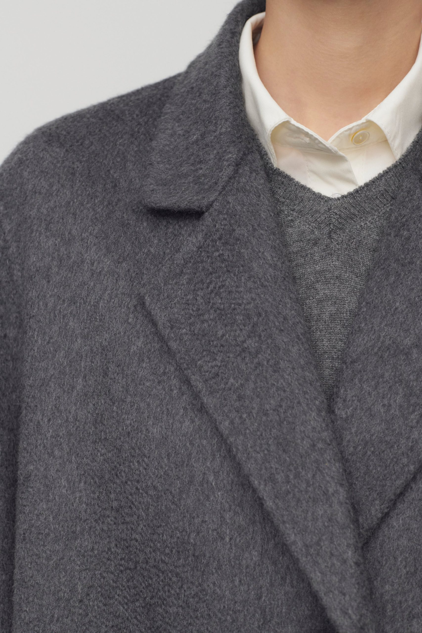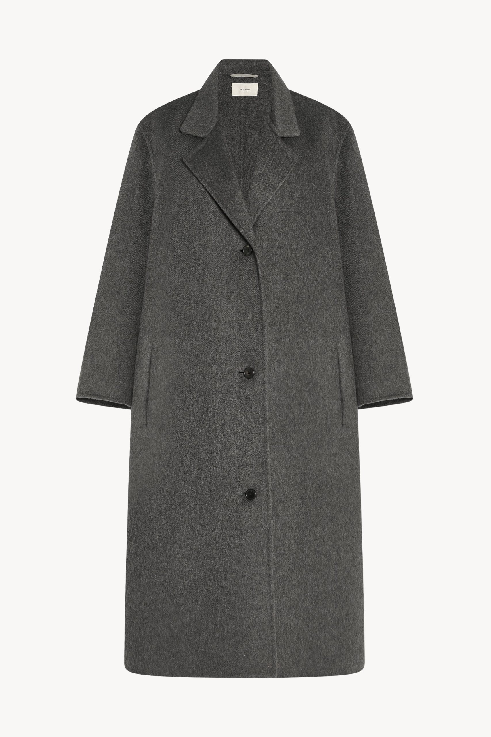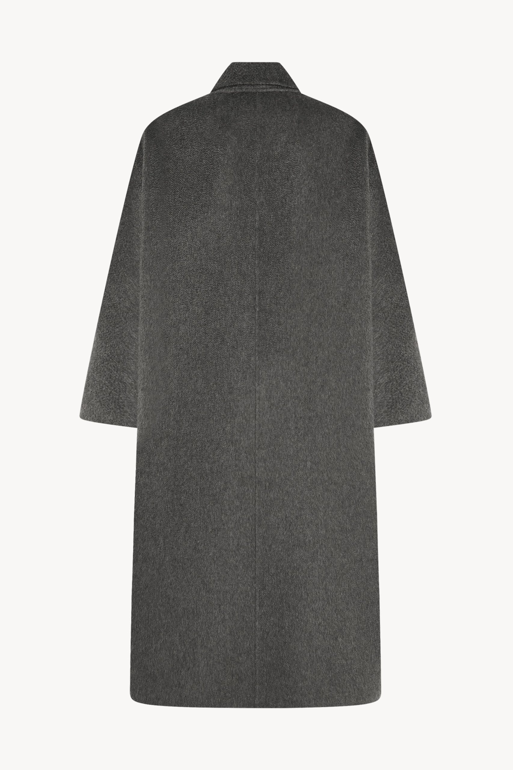 Relaxed single-breasted overcoat in washed double-faced cashmere with notch lapel. side slit pockets. and horn button closure.
