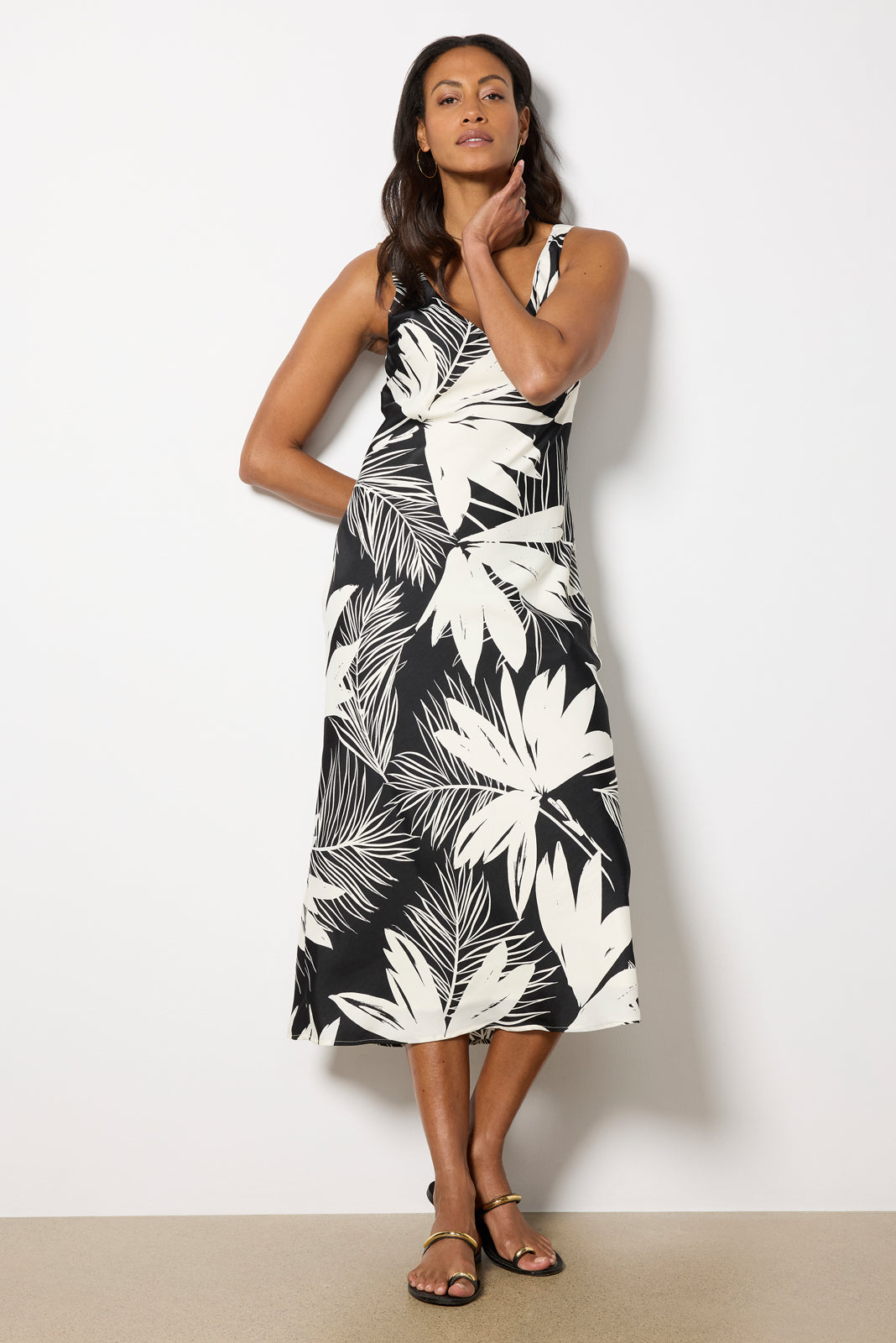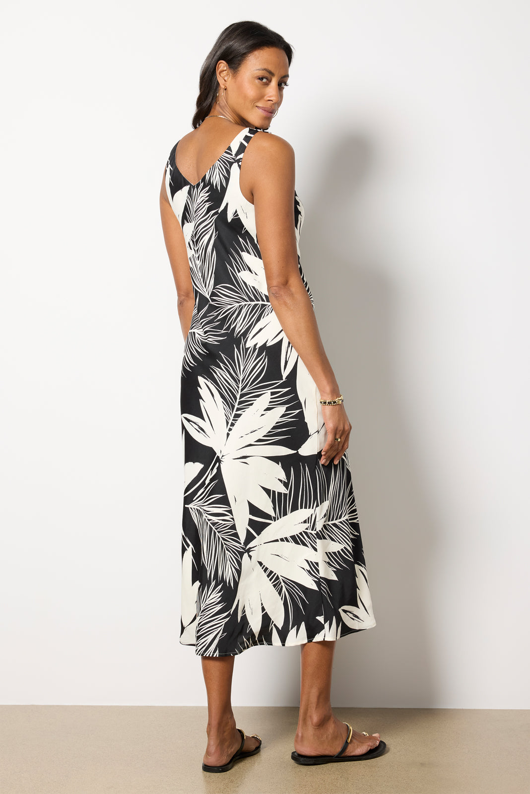 Chic and vacay-ready. this palm print dress by Z Supply is crafted in silky satin fabric and features a sleeveless silhouette. maxi length. and v-neckline.