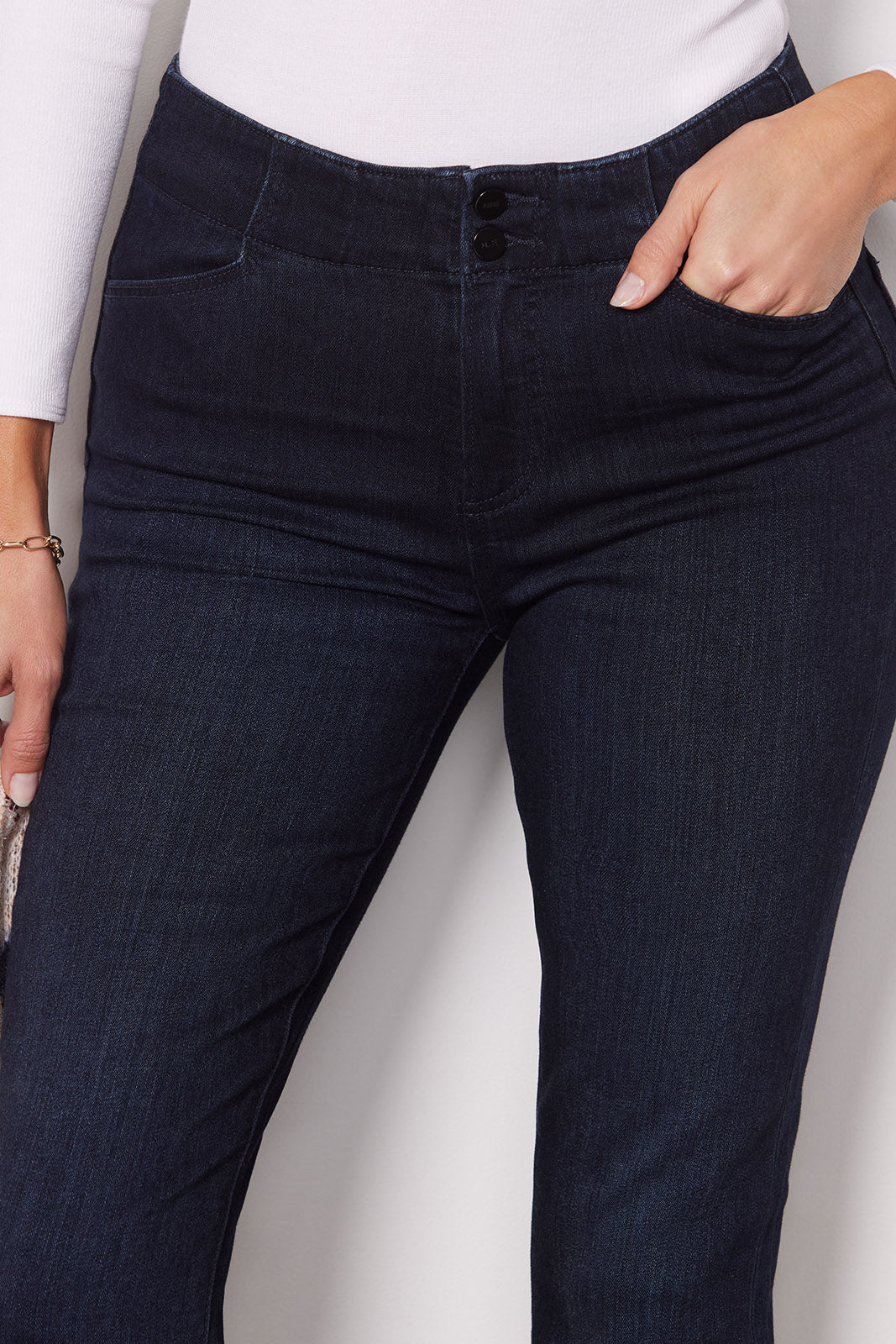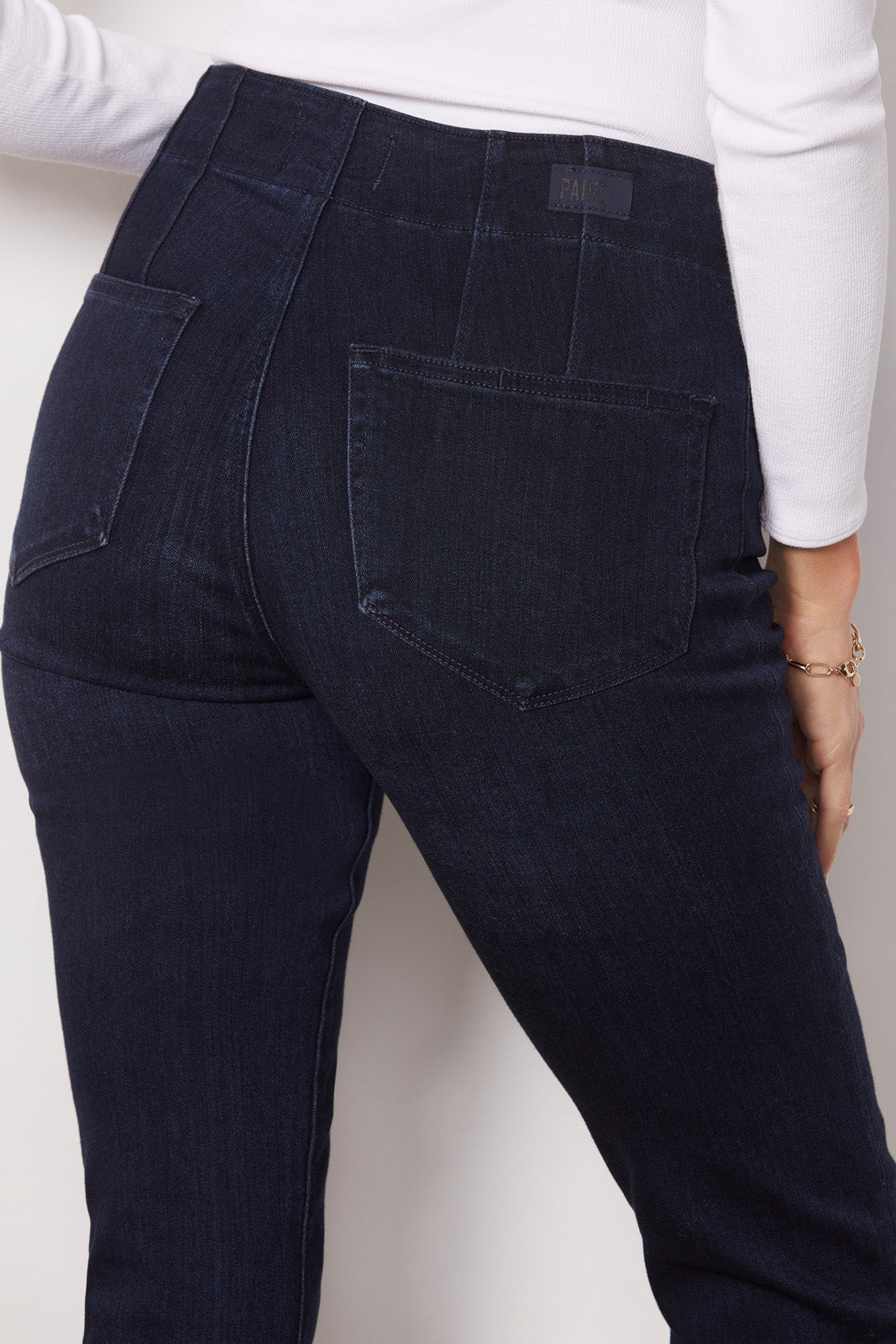 Angled pockets and a double button closure take these Paige jeans up a notch. Finished in a deep blue wash. this sleek bootcut silhouette features a high-rise fit and elongating full-length leg. The comfort-stretch denim fabric will move with you from day to night.