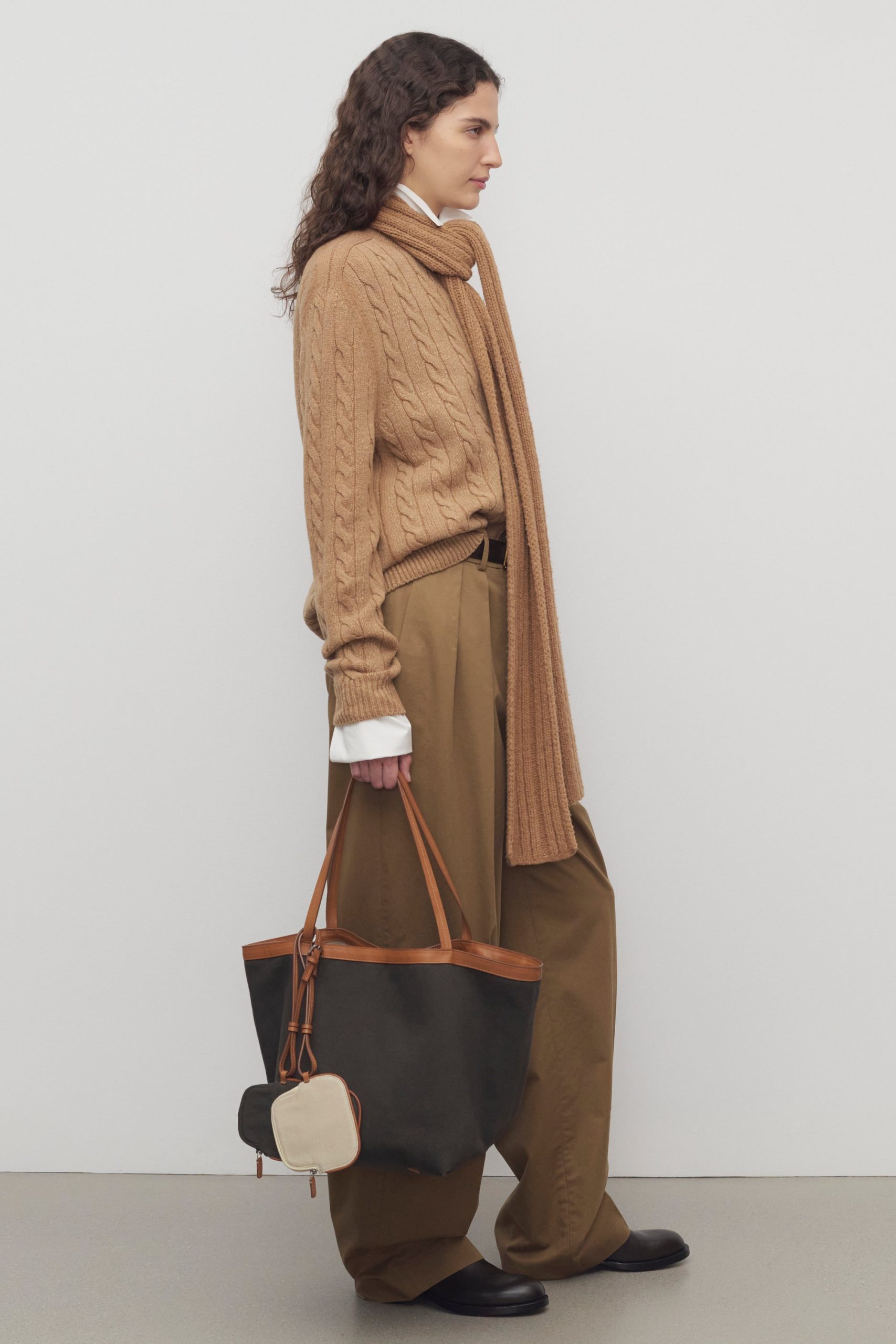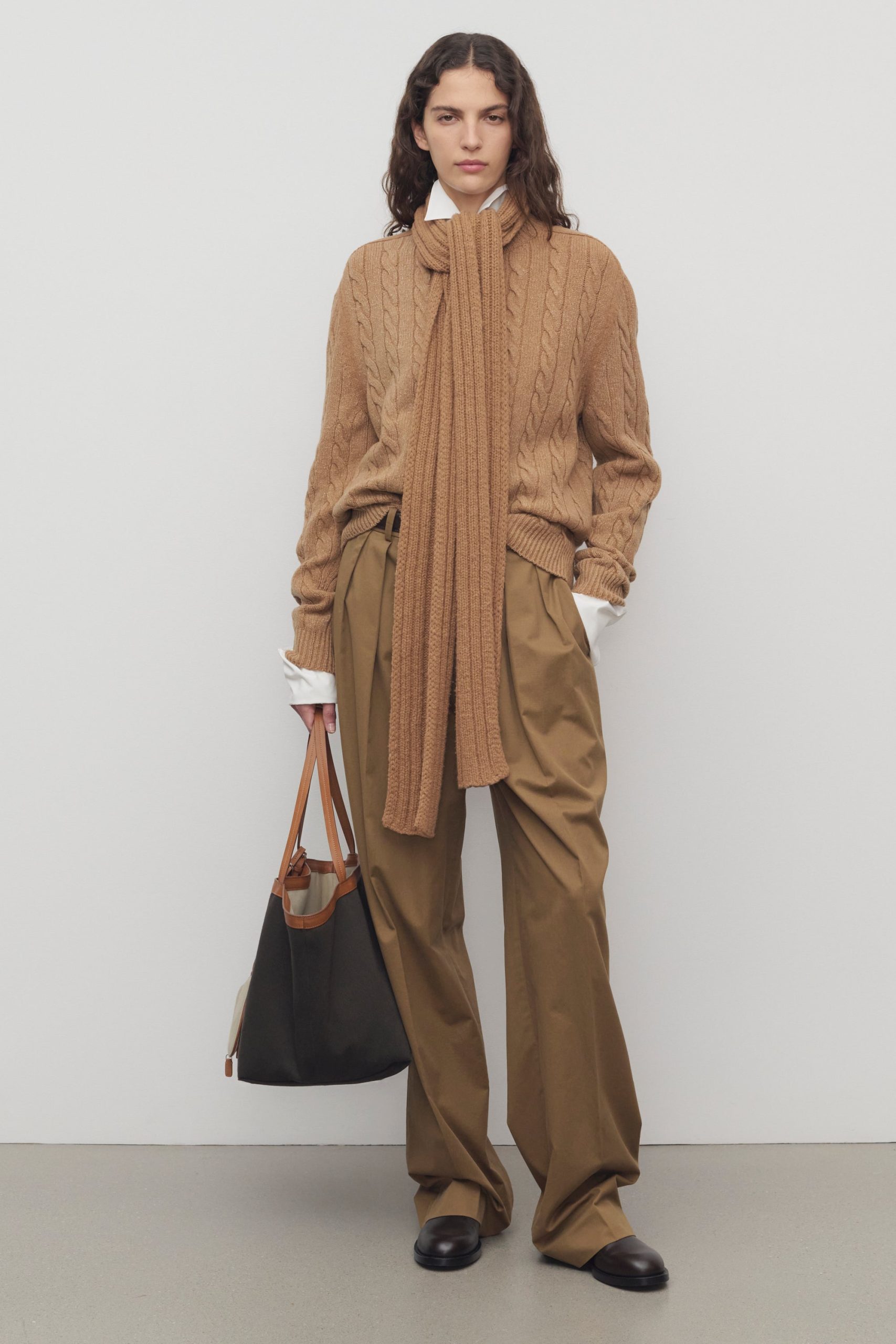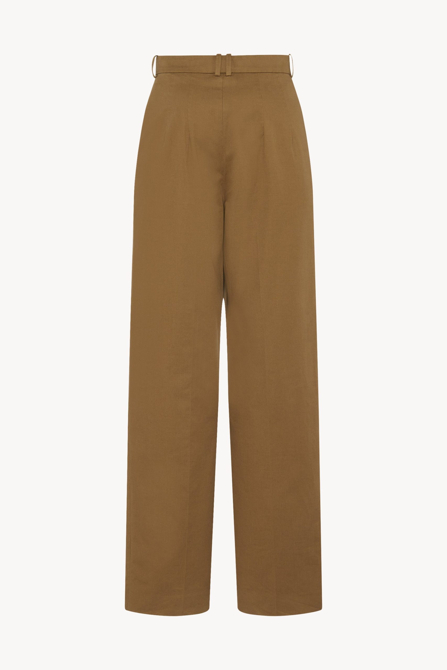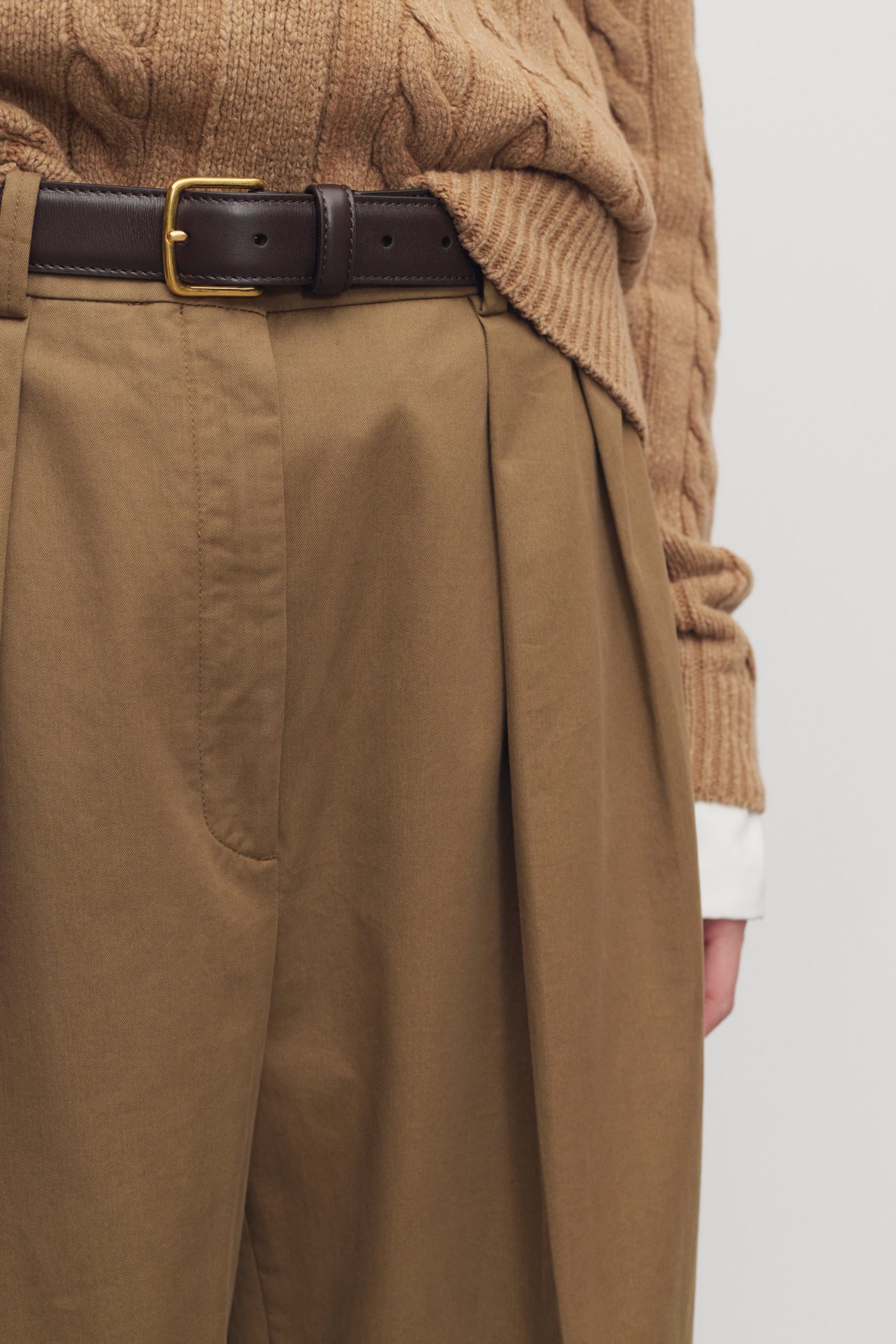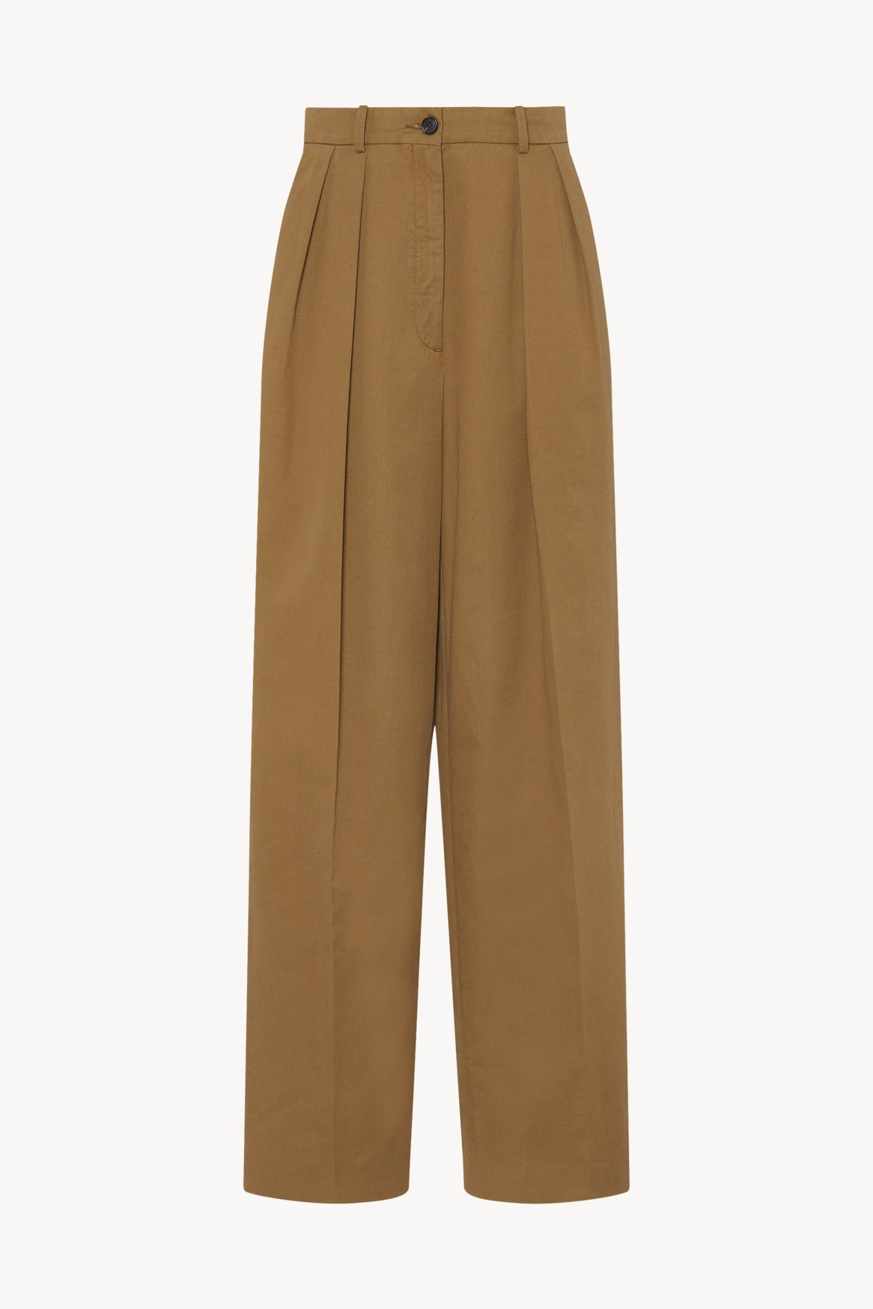 Low-rise trouser in cotton and cashmere gabardine with wide straight leg. front double pleats. and slanted side pockets.