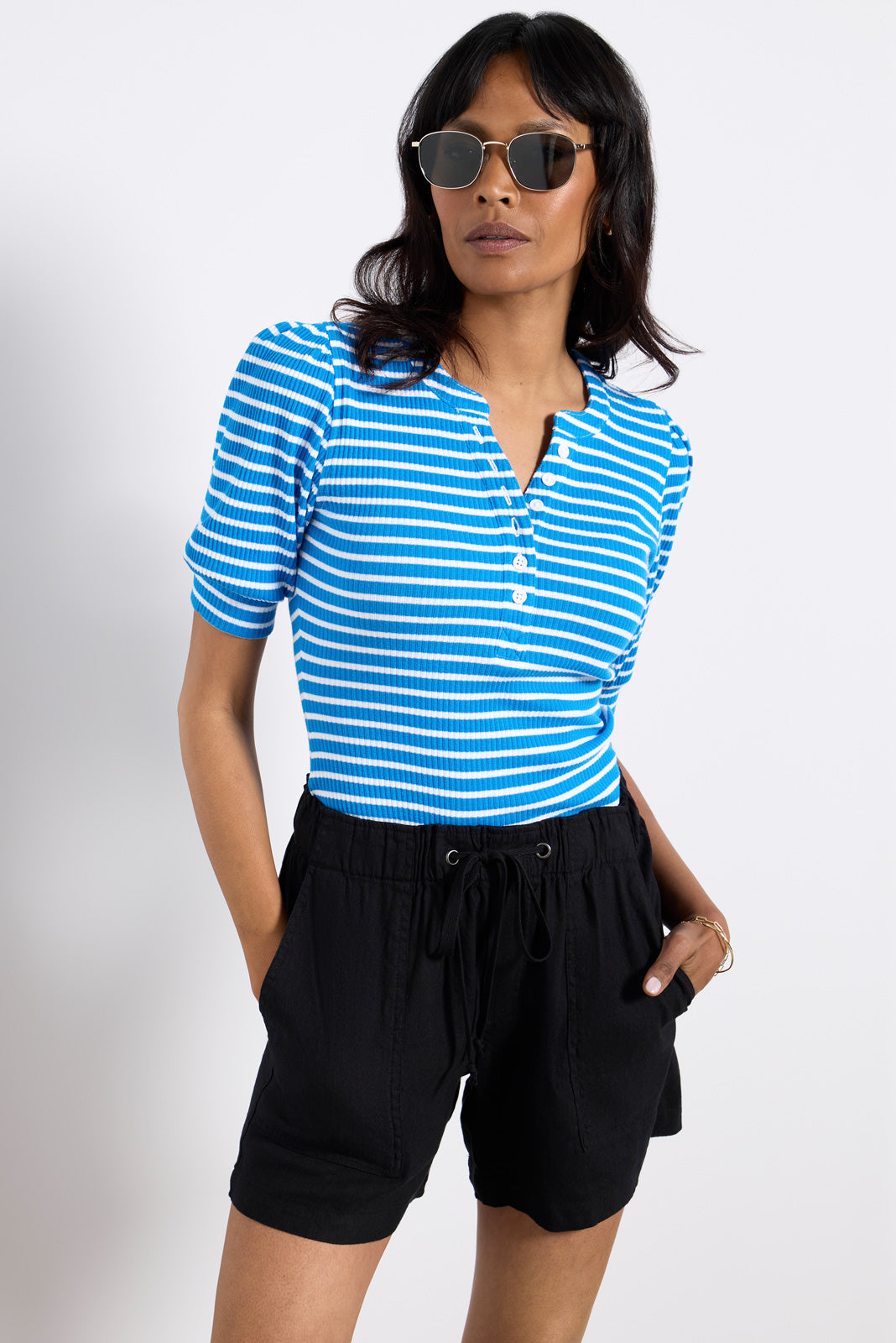 An elevated take on your everyday tee. the Jewel striped top by Rails is finished in soft ribbed fabric with a half button placket and elbow-length puff sleeves.